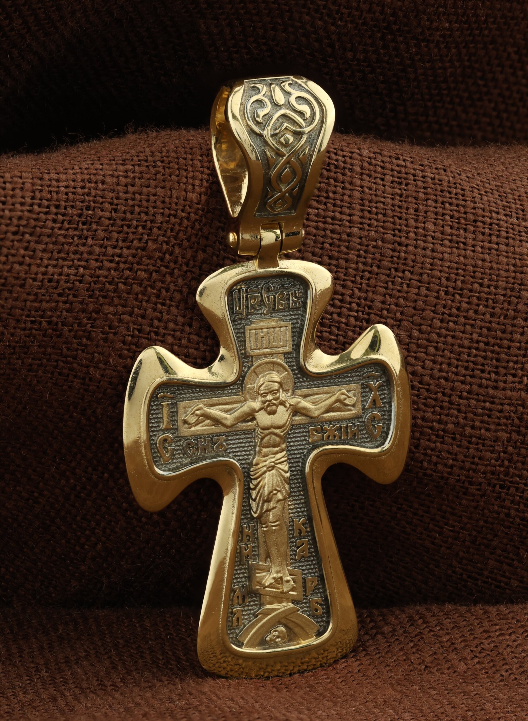 На лицевой стороне креста изображено Распятие Иисуса Христа. Господь представлен свободно покоящимся на кресте с простертыми руками и как бы обнимающим всю Вселенную. Он — Спаситель, искупивший грехи мира, «поправший смертию смерть» и призывающий к Себе «все концы земли». Поэтому рядом с Его образом помещены слова — «НИКА» и «Царь Славы». Эти слова характеризуют Господа как Великого Архиерея, победителя смерти. Также Распятие сопровождается надписями, олицетворяющими Христа. Это святое имя Христа «IC» (Иисус) «ХС» (Христос), и словосочетание «СЫН БОЖИЙ».