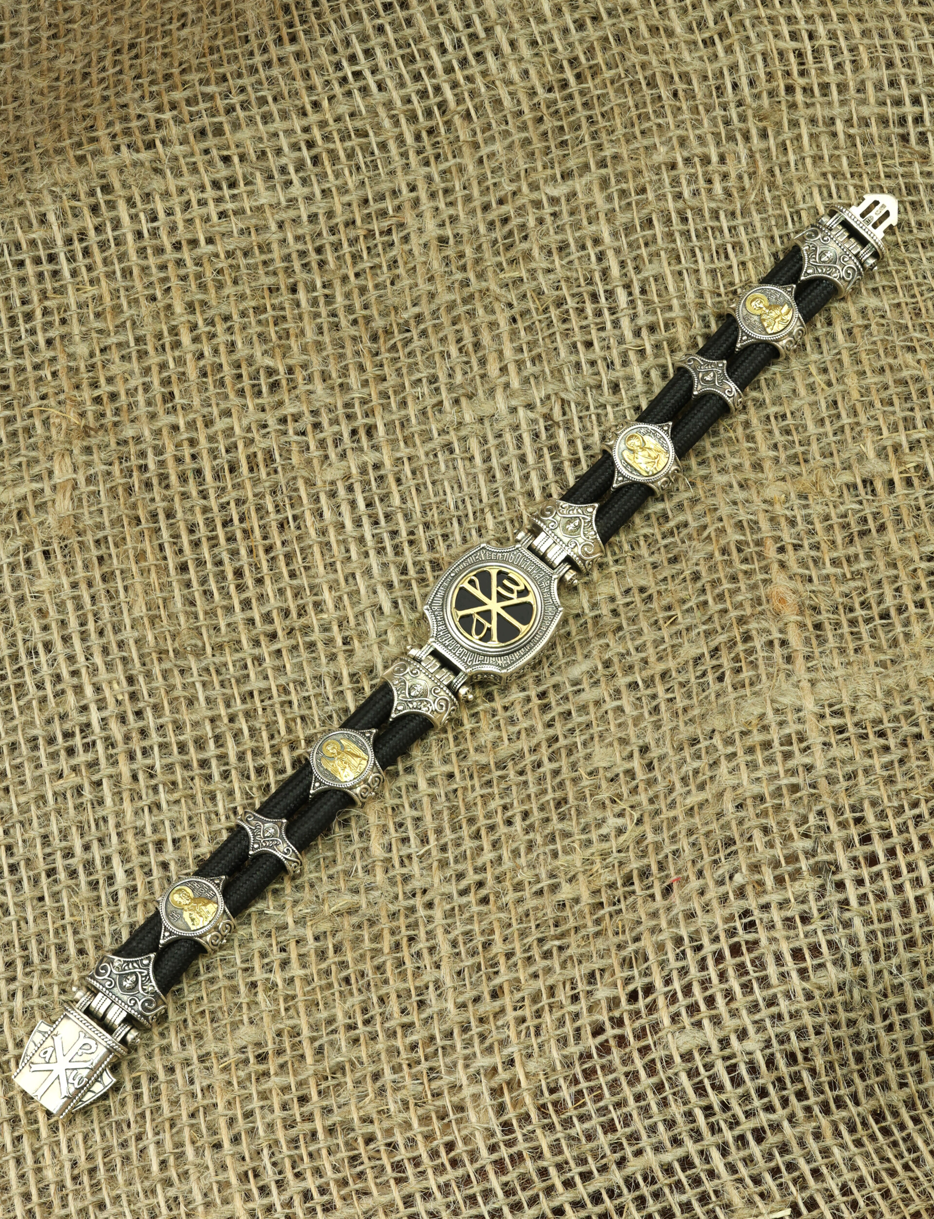 Браслет из серебра и золота c ониксом и шёлковым шнурком