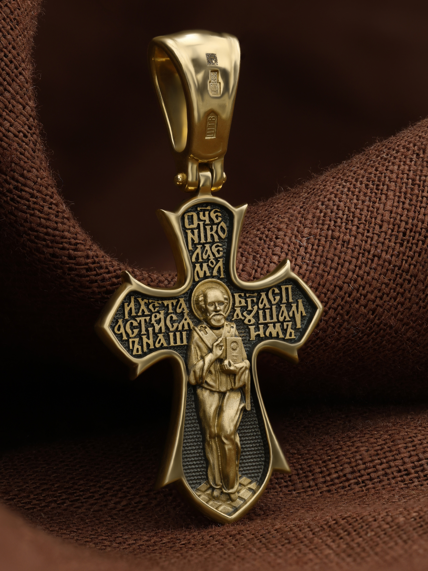 На лицевой стороне креста изображено распятие Господа нашего Иисуса Христа. Позади Распятия видна иерусалимская стена, знак того, что Господь был распят вне стен города. Но вместе с тем стена символизирует и Небесный Иерусалим, путь который открылся для человека через Голгофу. На кулоном кольце видим слова «ЦРЬ СЛВЫ» — Царь Славы. Верхняя перекладина символизирует собой табличку с надписью «IHЦI» — Иисус Назарянин Царь Иудейский. Над перекладиной пишется сокращенно имя Спасителя «IC XC» — Иисус Христос и словосочетание «СНЪ БЖIЙ» — «СЫН БОЖИЙ». Рядом с образом Христа помещены слова — «НИКА» (греч. — Победитель). Возвышение, на котором стоит Крест, символизирует гору Голгофу, на которой произошло Распятие. У подножия Креста изображают прах Адама, обозначенный черепом.