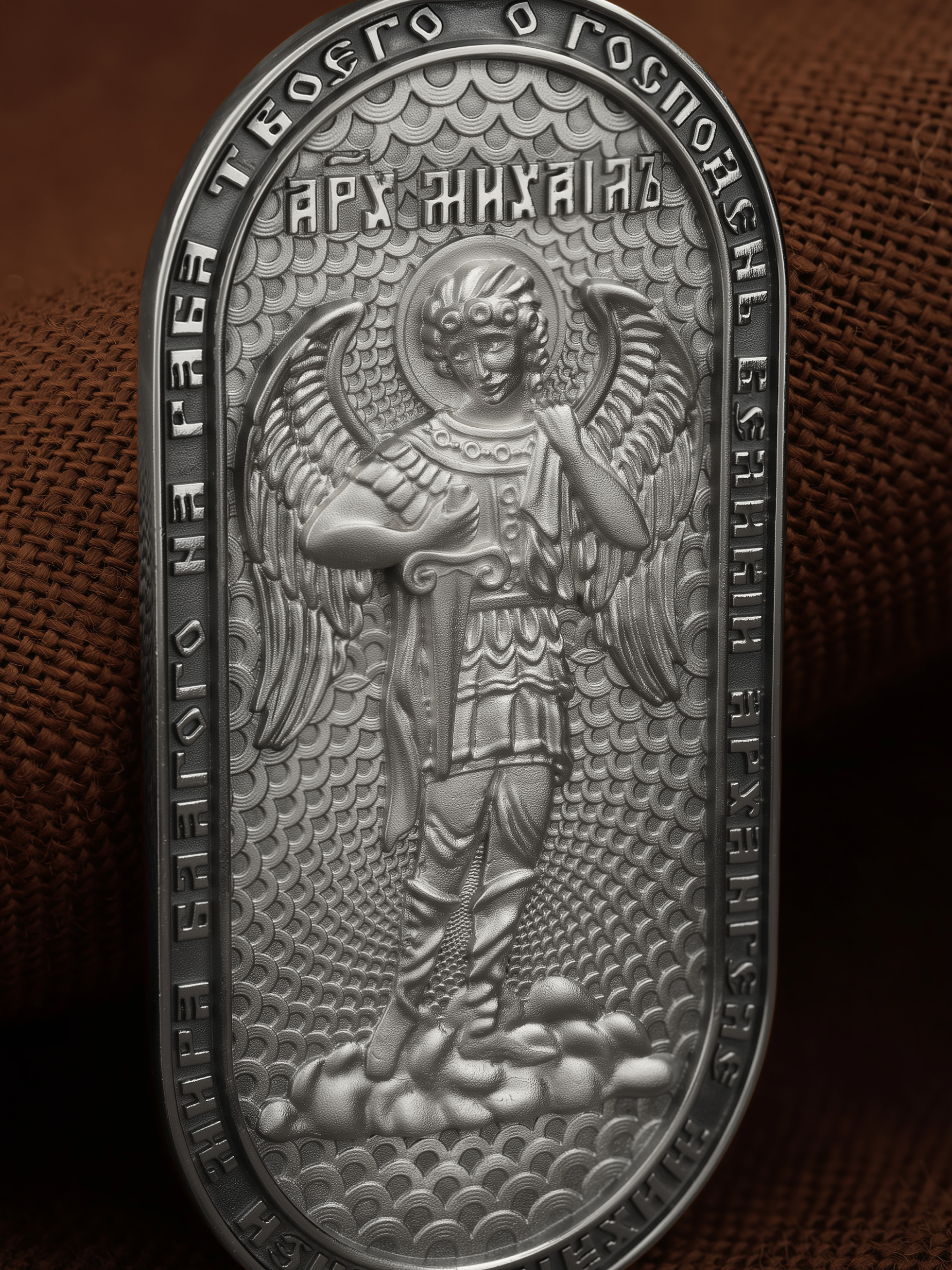 Основой композиции оборотной стороны является ростовое изображение Архангела Михаила — Архистратига всех Небесных Воинств. Он ведет непримиримую войну против сил зла, охраняет райские врата и защищает души людей. По контуру написана молитва: «О, Господень Великий Архангеле Михаиле, излей мира благого на раба Твоего». На кулонном кольце изображен Спас Нерукотворный — Символ вочеловечившегося Божества.