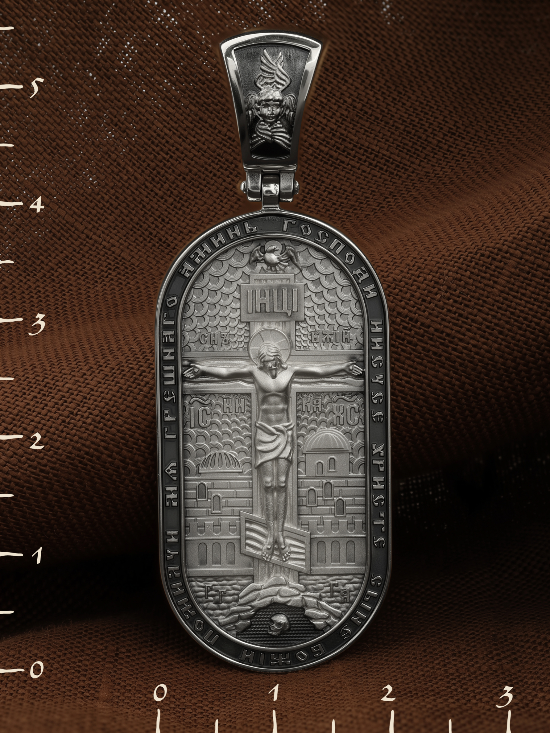 Центральную часть лицевой стороны занимает Распятие Христа — образ жертвы, принесенной Господом за грехи людей. Именно ко Христу, сошедшему на землю ради нашего спасения, возносятся все молитвы. Рядом с Его образом помещены слова — «НИКА» (греч. — Победитель) и «СЫН БОЖИЙ». Эти слова характеризуют Господа как Великого Архиерея, победителя смерти. Также Распятие сопровождается надписями, олицетворяющими Христа — это святое имя Христа «IC» (Иисус) «ХС» (Христос). Верхняя перекладина символизирует собой табличку с надписью «IHЦI» — Иисус Назарянин Царь Иудейский. Возвышение, на котором стоит Крест, символизирует гору Голгофу, на которой произошло Распятие. У подножия Креста изображают прах Адама, обозначенный черепом. На кулонном кольце изображен шестикрылый Серафим — самый приближенный к Господу Ангел. По контуру образка написана молитва: «Господи Иисусе Христе, Сыне Божий, помилуй мя грешного. Аминь»