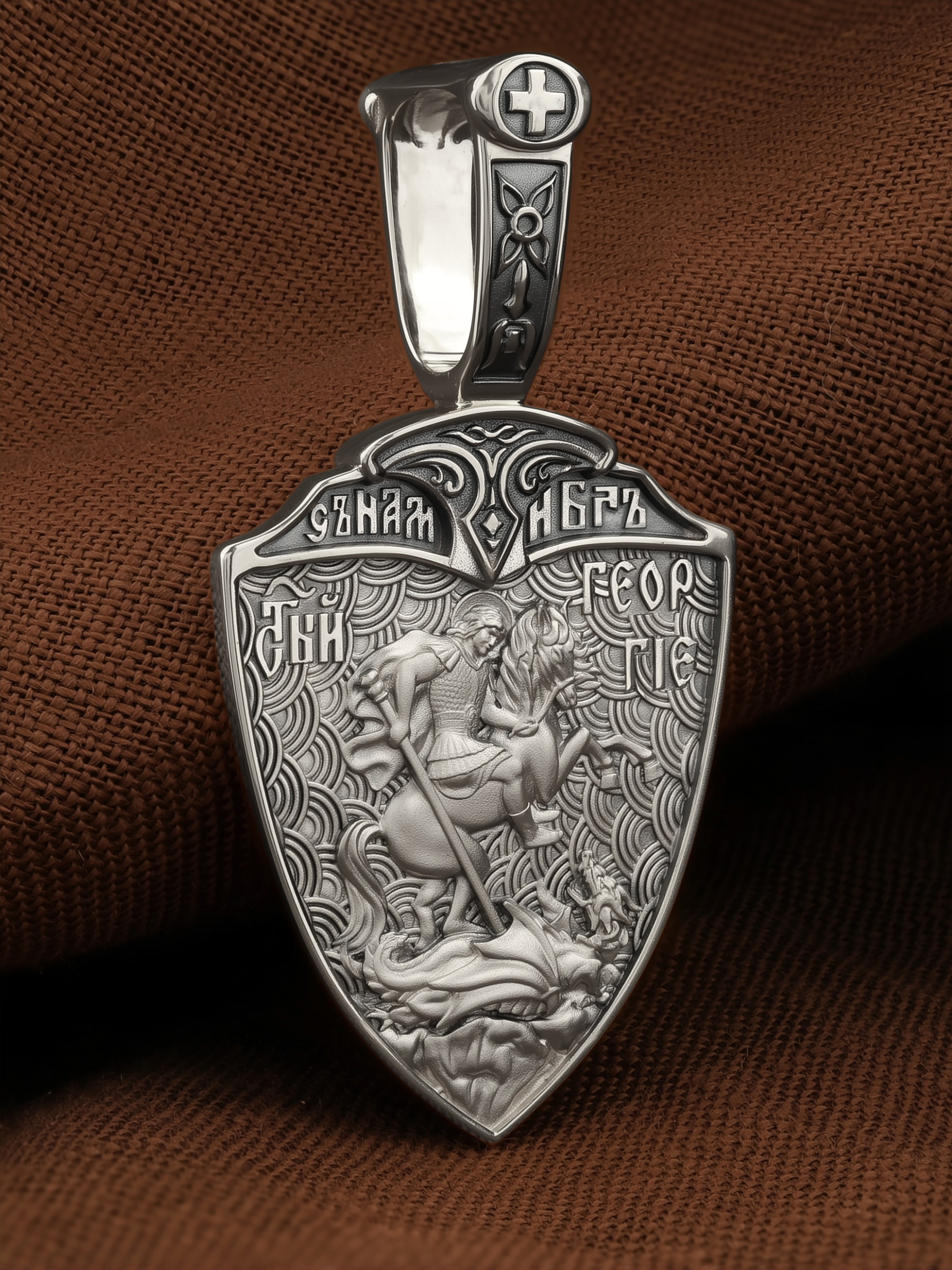 На оборотной стороне образка изображен Святой Великомученик Георгий Победоносец — один из самых почитаемых и удивительных святых. На Руси он известен как Юрий или Егорий, заступник для верующих, чья жизнь имеет какое-либо отношение к военным делам, помощник в крестьянском труде. На образке Георгий изображен как воитель, сидящий на вздыбленном коне и поражающий копьем огнедышащего змея. Змей символизирует собою сатанинские силы. Молитвами вознесенными к Всевышнему и своей непреклонной верой он смог одолеть чудовище. Святой убил змея, спас царскую дочь, принесенную в жертву, и жителей города, их души от влияния дьявола, породив в них надежду и веру в Господа, призывая людей принять христианскую веру.