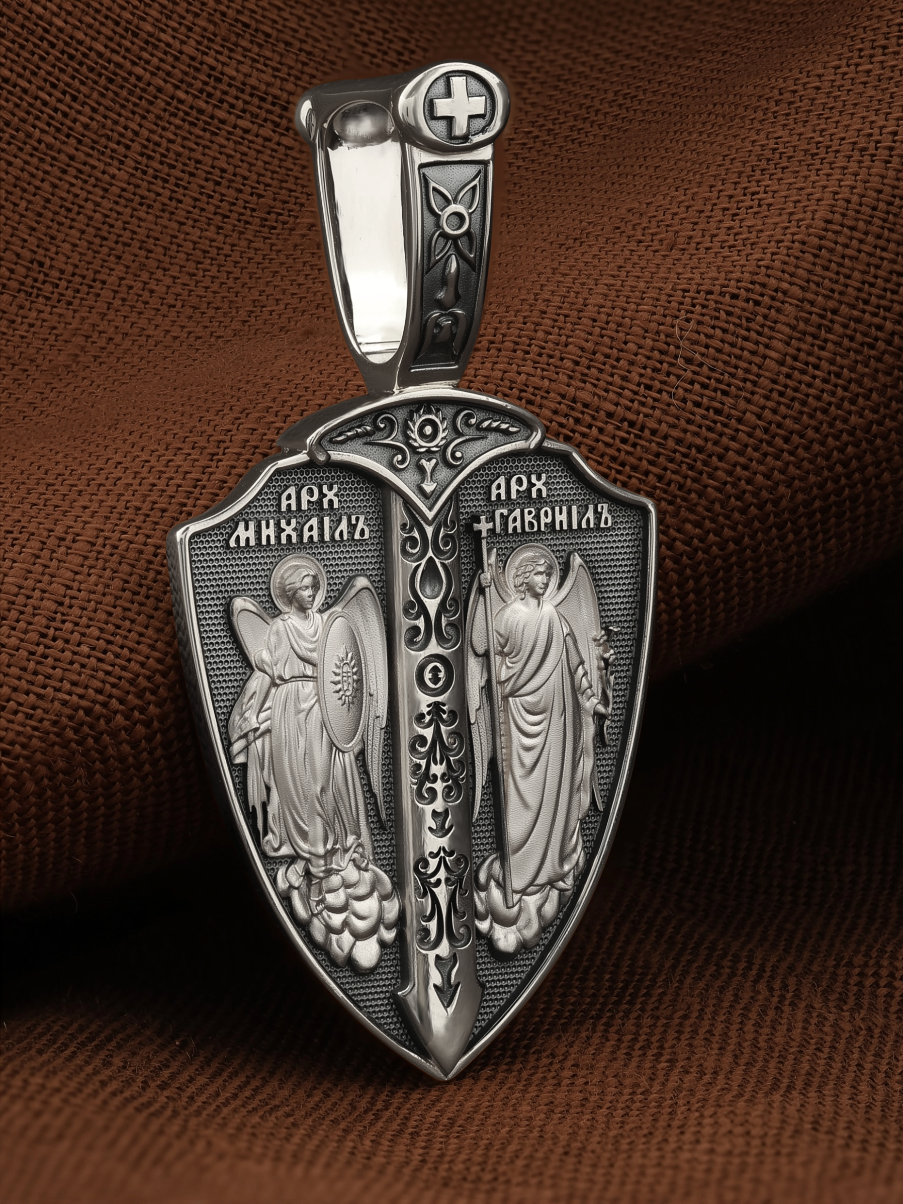 Образок выполнен в виде воинского щита и меча. На лицевой стороне образка изображены Архангел Михаил и Архангел Гавриил. Архангел Михаил изображен в воинственном виде с огненным мечом в правой руке и щитом в левой руке. Архангел Михаил — верный служитель Божий, который низринул с Неба возгордившегося денницу с другими павшими духами. В Православии его называют Архистратигом, что означает глава святого воинства Ангелов и Архангелов. Архангел почитается как покровитель воинов и всех верных Богу и ведущих борьбу против сил зла, борец против ересей, а также защитник душ умерших, страж райских врат. Архангел Гавриил изображен с крестом в правой руке и цветком лилии в левой руке. Он несколько раз упоминается в Писании, как Небесный вестник, которого Бог посылает, чтобы возвестить людям Свои планы о спасении рода человеческого. Так, Архангел Гавриил несколько раз являлся пророку Даниилу и раскрывал ему тайны пришествия Мессии, гонений антихриста и конца мира (Дан. 8, 16, 9−21). Перед пришествием Сына Божия в мир архангел Гавриил явился в храме старцу Захарии и сообщил ему о чудесном зачатии Предтечи. Через шесть месяцев он явился в Назарете Деве Марии с вестью об избрании Ее быть Матерью Христа Спасителя (Лк. 1). Когда Господь перед Своими страданиями молился в Гефсиманском саду до кровавого пота, на укрепление Его, по Церковному Преданию, был послан с Небес Архангел Гавриил. (Лк.22:43). Жены мироносицы услышали от Архистратига радостную весть о Воскресении Христовом.