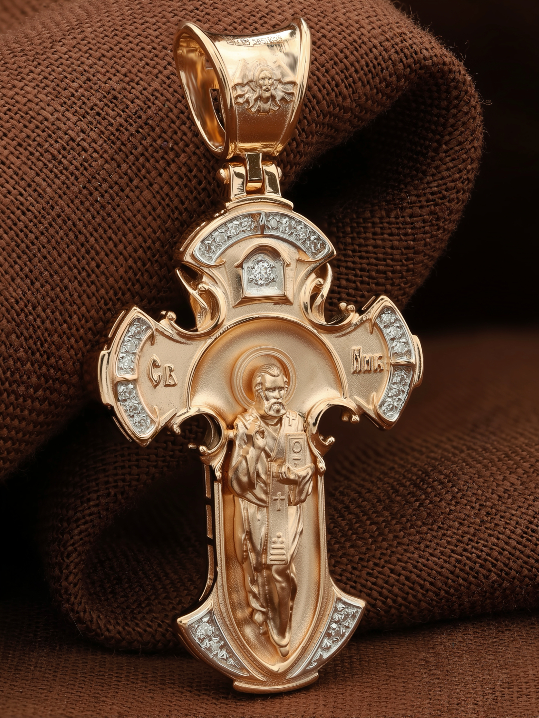 Оборотную сторону креста возглавляет икона святителя Николая Чудотворца. На кулонном кольце помещено изображение Спаса Нерукотворного — образ Спасителя, который Он запечатлел на плате и передал для исцеления больному проказой царю Эдессы. ему придается победное и защитное значение.
