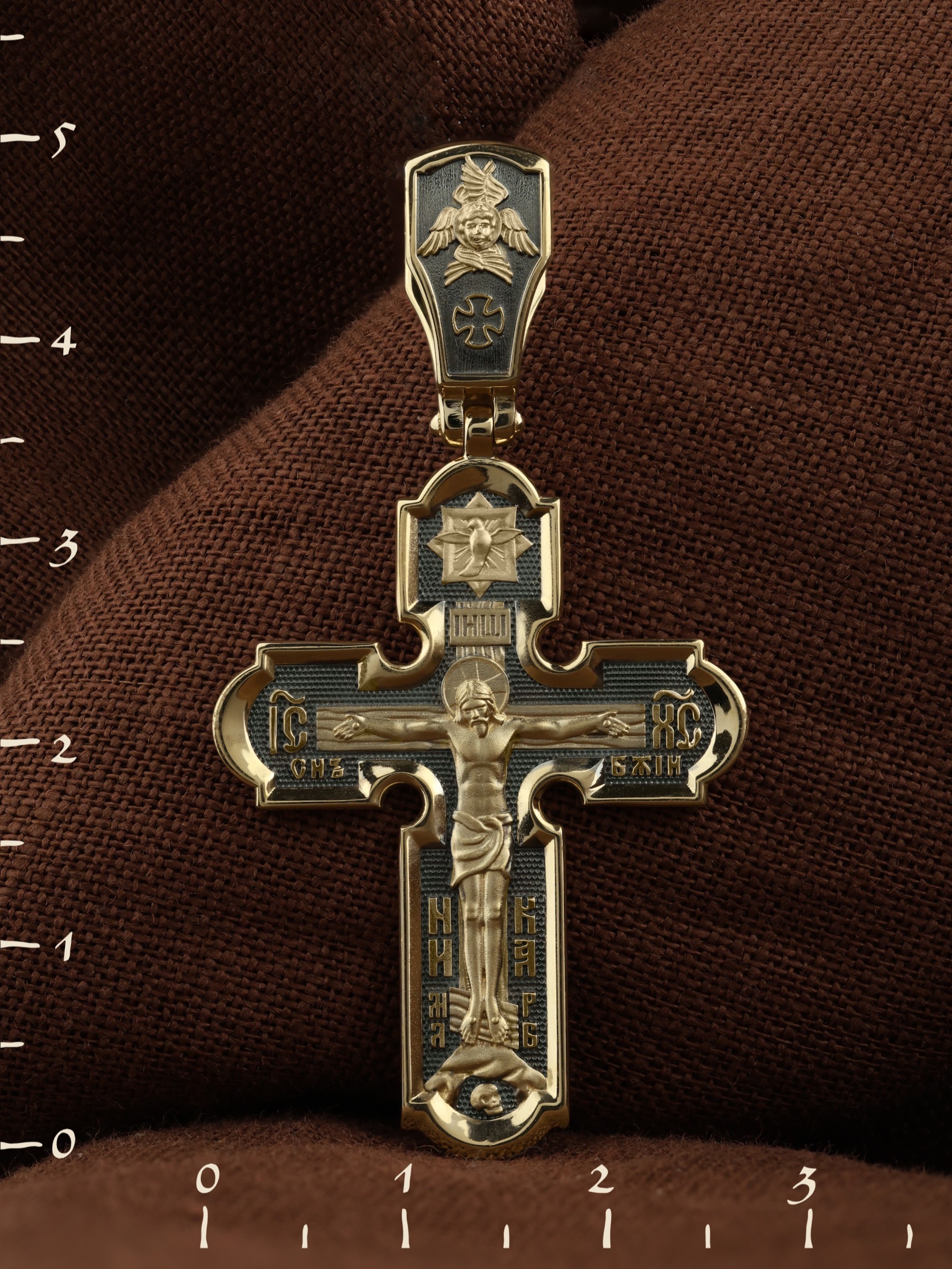 На лицевой стороне креста изображено Распятие Иисуса Христа. Господь представлен свободно покоящимся на кресте с простертыми руками и как бы обнимающим всю Вселенную. Он — Спаситель, искупивший грехи мира, «поправший смертию смерть» и призывающий к Себе «все концы земли». Поэтому рядом с Его образом помещены слова «НИКА» и «Царь Славы». Эти слова характеризуют Господа как Великого Архиерея, победителя смерти. Верхняя перекладина символизирует титло — табличку, на которой, согласно Евангелию, было начертано: Иисус Назорей Царь Иудейский (IНЦI). Также Распятие сопровождается надписями, олицетворяющими Христа. Это святое имя Христа «IC» (Иисус) «ХС» (Христос) и словосочетание «СЫН БОЖИЙ». Крест стоит на горе камней, символизирующих Голгофу, в основании которой различается череп. Это голова Адама. На кулонном кольце помещено изображение серафима.