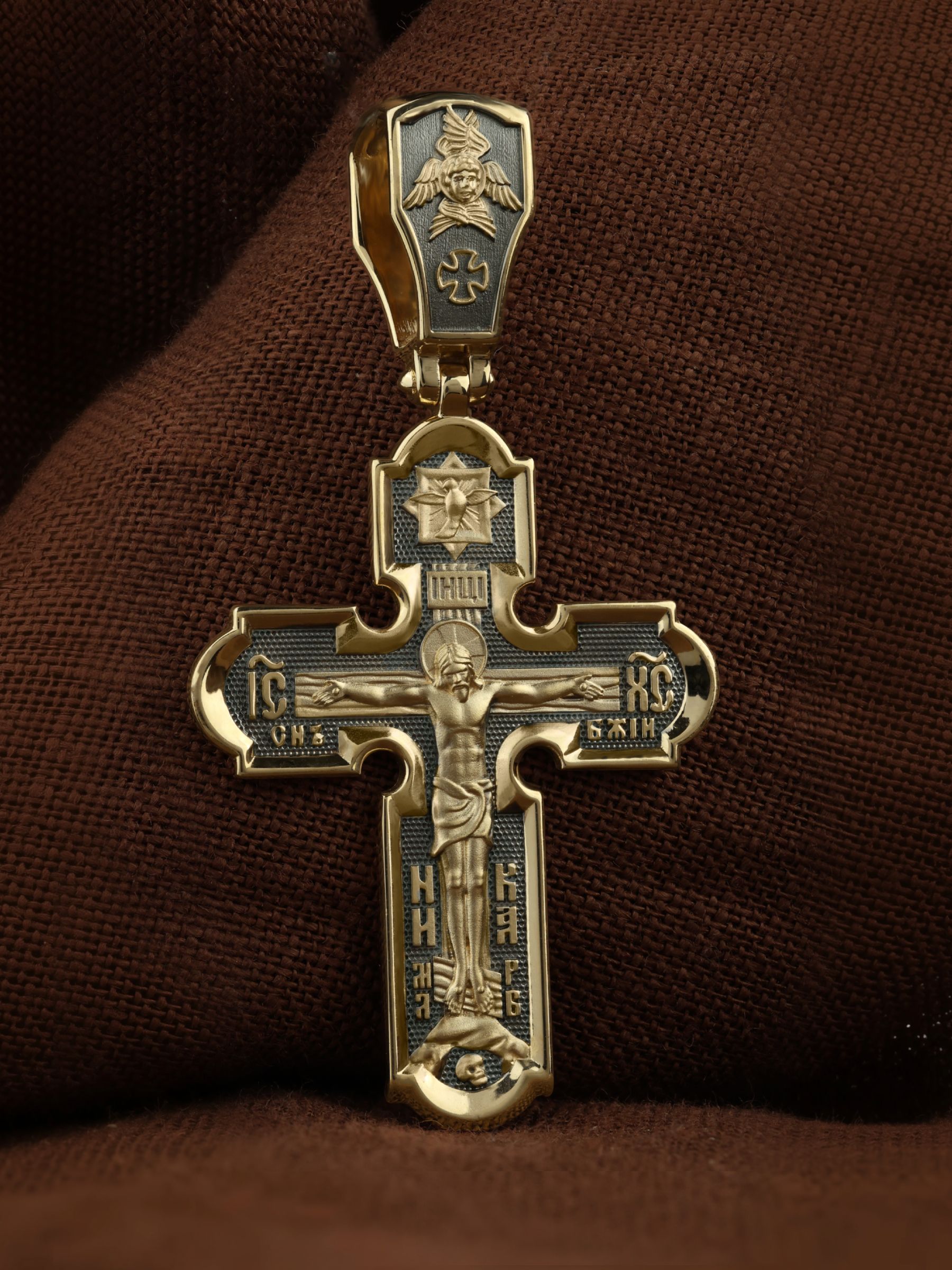 На кресте внизу изображен Ангел Хранитель, слева — Святая Блаженная Ксения, справа — Святая Блаженная Матрона, вверху — пророк, почитающийся в христианстве, Предтеча Господень Иоанн Креститель. На кулонном кольце помещено изображение Спаса Нерукотворного — образ Спасителя, который Он запечатлел на плате и передал для исцеления больному проказой царю Эдессы. Ему придается победное и защитное значение.