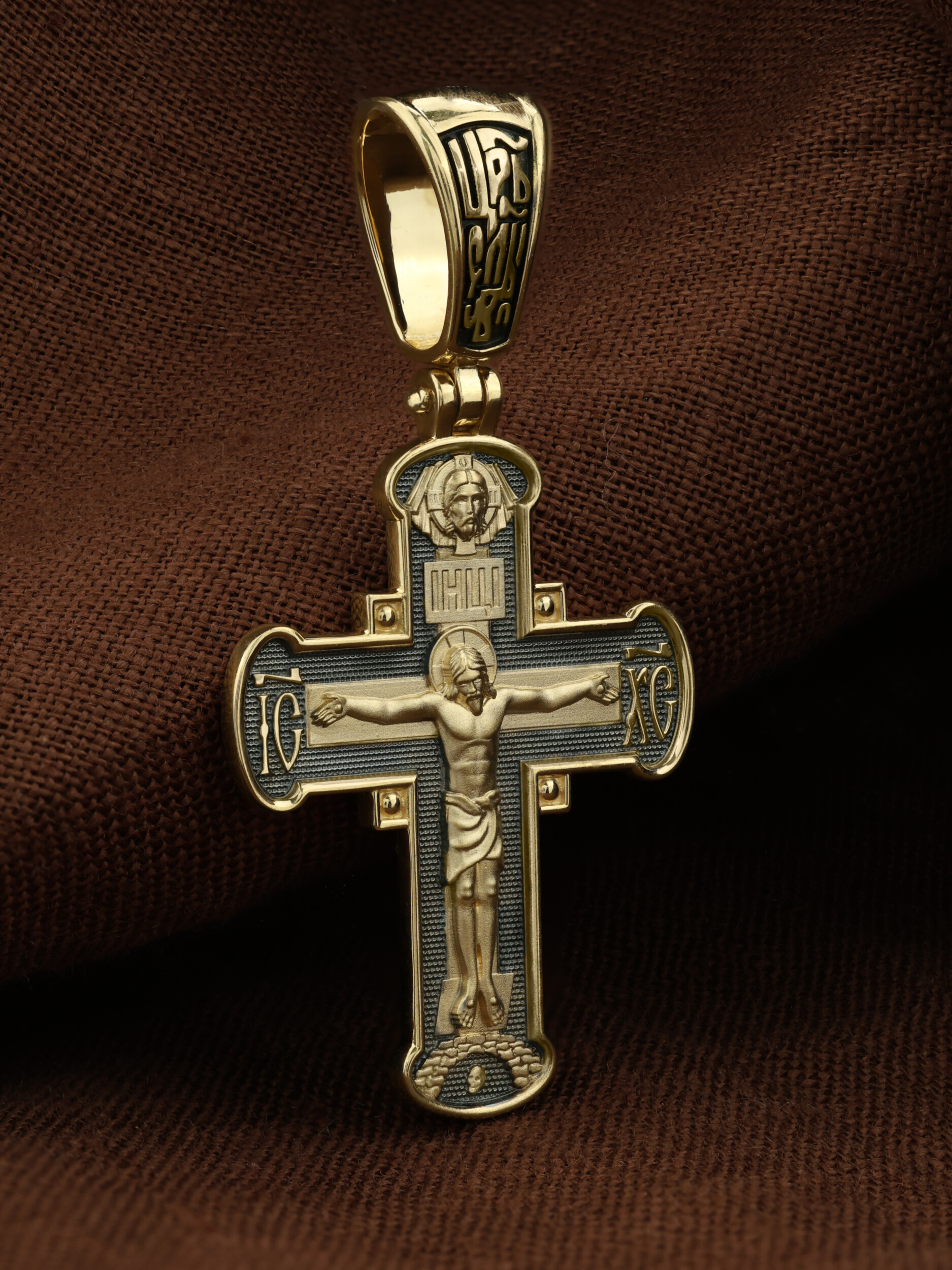 На лицевой стороне креста изображено Распятие Господа и Спасителя нашего Иисуса Христа, отдавшего Себя на смерть, для искупления грехов мира. Крест является символом жертвенной любви Всеблагого Бога к падшим людям, всепобеждающим духовным оружием христиан, основанием и средоточием церковной жизни. Господь сказал: «кто хочет идти за Мною, отвергнись себя, и возьми крест свой, и следуй за Мною». (Мк. 8: 34). На кулонном кольце помещена надпись «Царь Славы». На верхней табличке, выше головы Иисуса, расположена надпись, составленная Понтием Пилатом — «IНЦI». Она означает «Иисус Назорей, Царь Иудейский». Над ней — Нерукотворный образ Господа и Спасителя нашего Иисуса Христа, чудесно отпечатавшийся на плате, котором Христос вытер свой лик. Надпись «IC» «ХC», означает Иисус Христос, помещается на разных сторонах поперечной перекладины креста. Крест стоит на горе камней, символизирующих Голгофу. В ее основании различается череп– это голова Адама.
