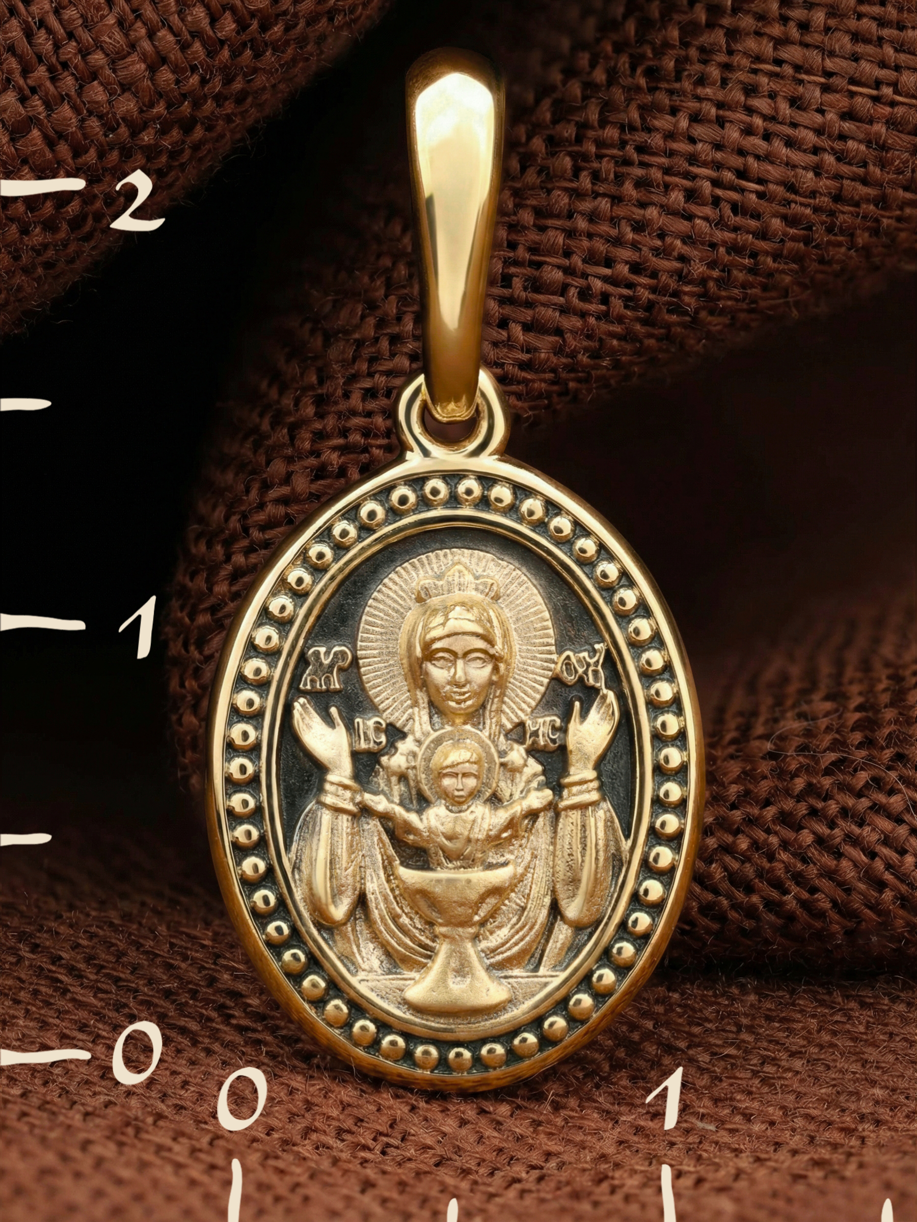 На лицевой части образка изображена икона Божией Матери «Неупиваемая чаша». Икона славится помощью в исцелении зависимостей, помогает людям обрести свободу от греховных страстей.