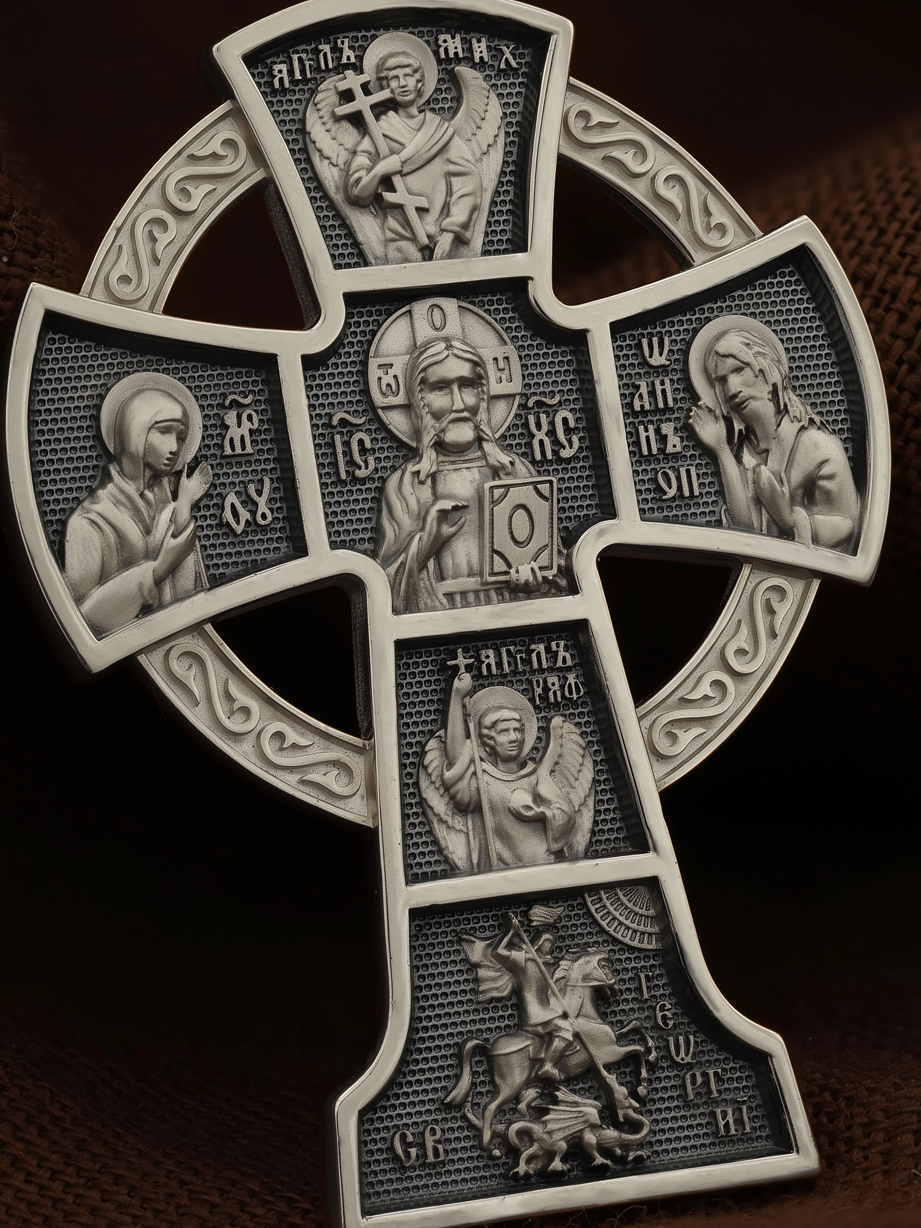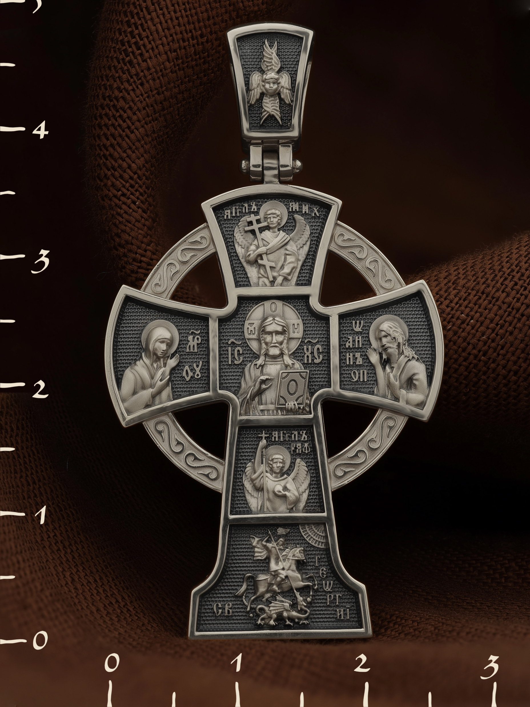 Вверху и внизу от спасителя предстоят два архангела, Михаил (Первый служитель Божественной славы, страж и защитник) и Гавриил (служитель Божественной крепости и изъявитель сокровенных Божьих тайн). Внизу помещен образ свт. Георгия Победоносца. Святой при жизни прославился не только как храбрый воин и твердый исповедник веры, но и как сострадательный, милосердный целитель и чудотворец. Святому молятся о покровительстве воинам и армии, о защите государства, сохранении и спасения России.