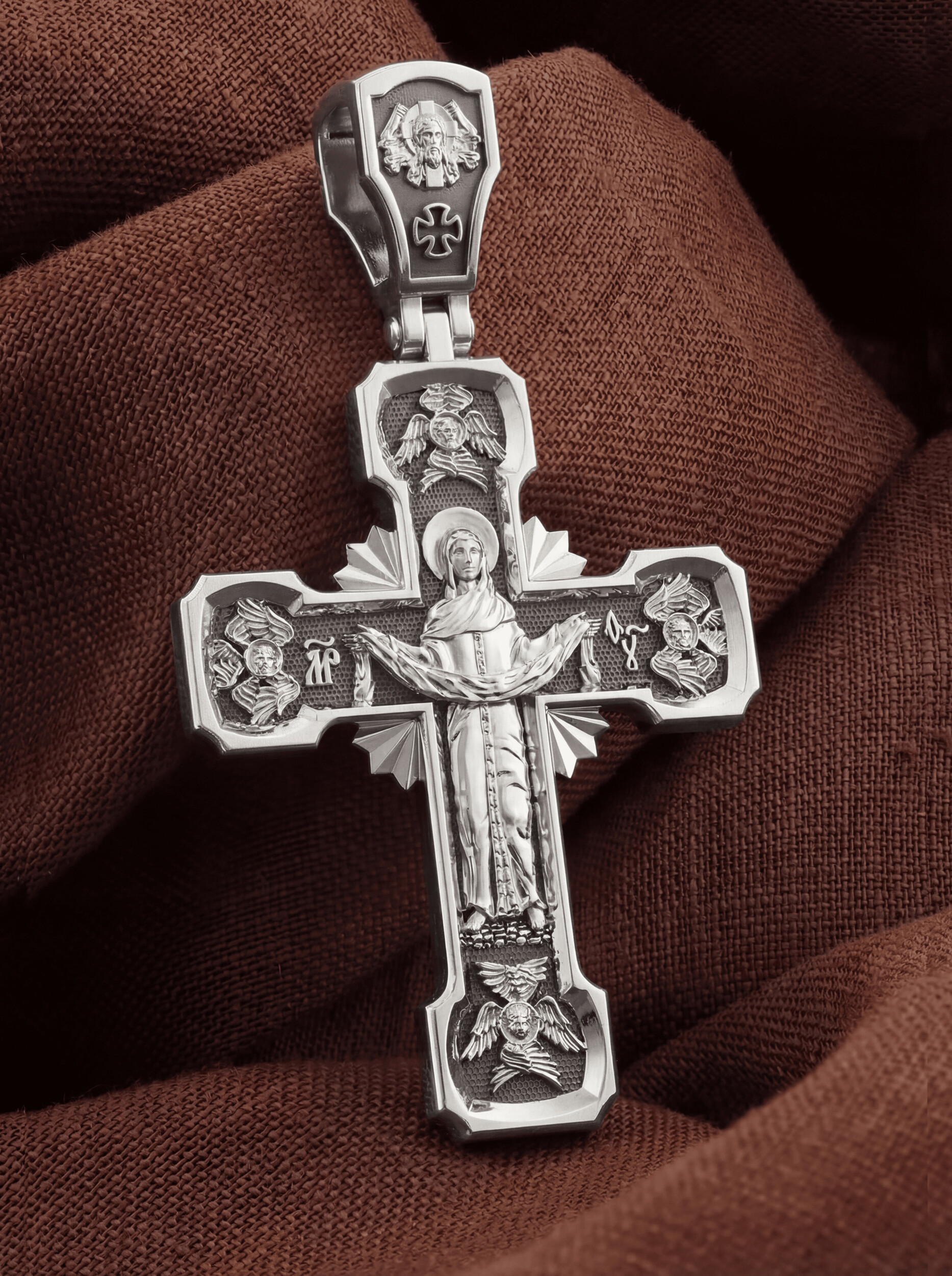 На обороте креста, в окружении крылатых Серафимов, изображена икона Покрова Пресвятой Богородицы. Праздник Покрова Божией Матери является воспоминанием чуда, которое произошло во Влахнернской церкви 1 (14) октября 910 года: Пресвятая Богородица явилась верующим над алтарем храма и распростерла над ними Свое покрывало. В этот день Божья Матерь открыла людям, что Она является Ходатаицей за них перед Богом. Богородица простирает Свой молитвенный покров над всеми православными христианами и умоляет Сына Своего о даровании вечного спасения каждому человеку.