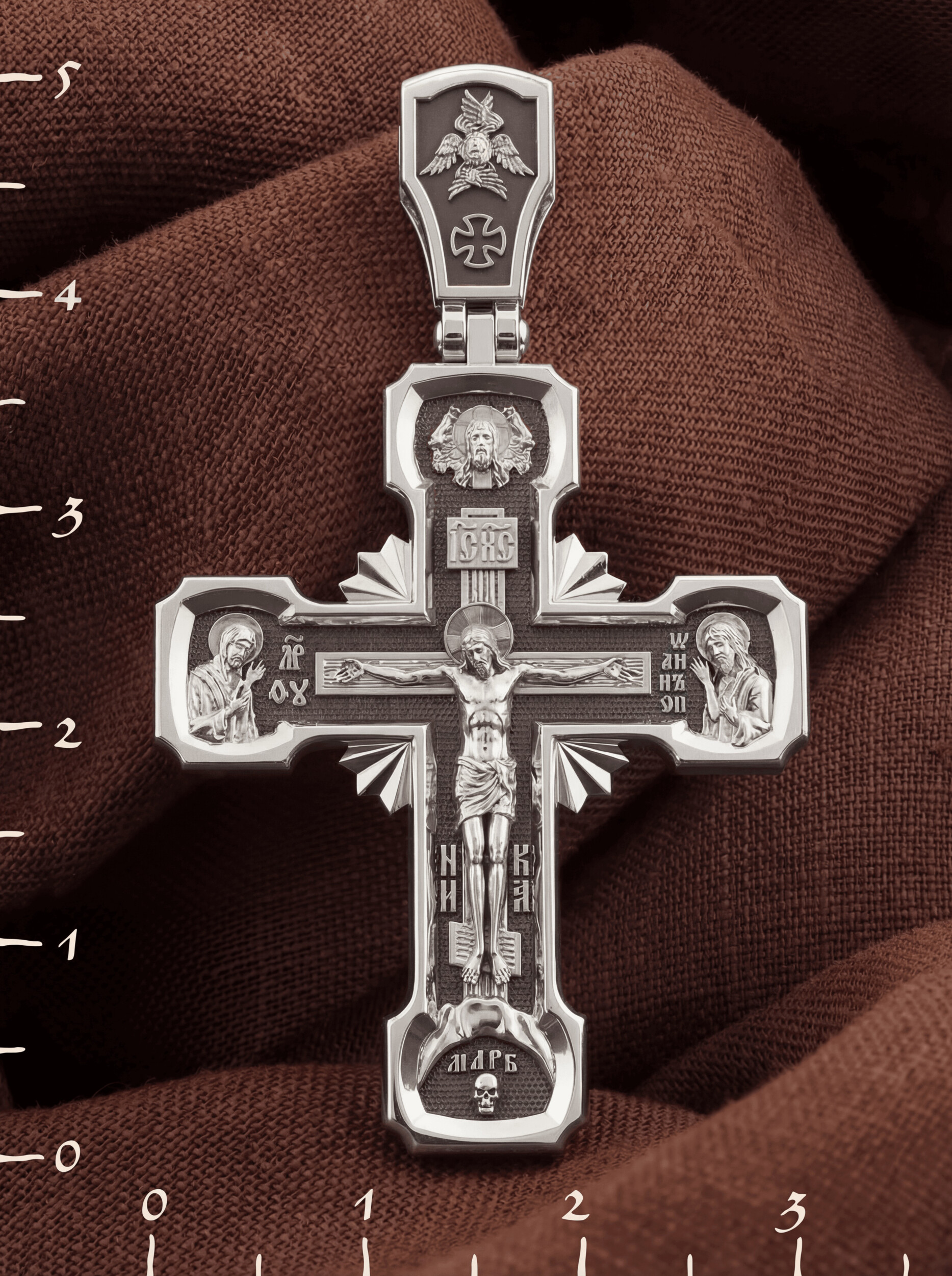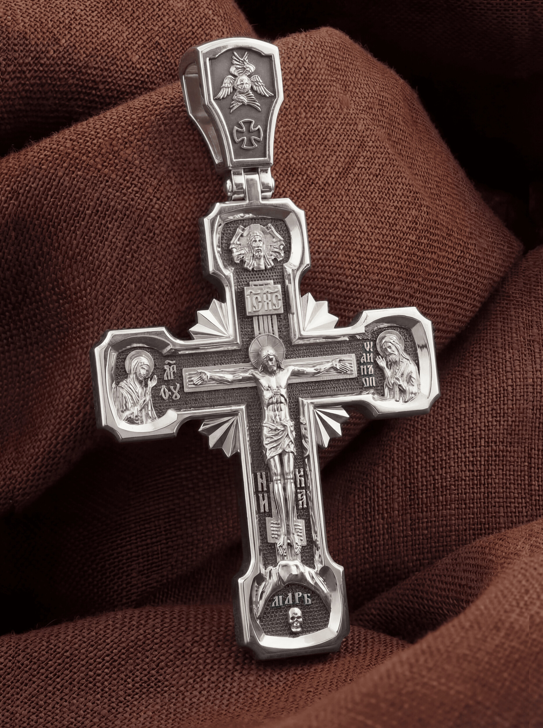 На лицевой стороне креста изображено Распятие Господа Иисуса Христа. С двух сторон Христу предстоят Пресвятая Богородица и св. пророк и Предтеча Господень Иоанн Креститель, которые имеют особое дерзновение перед Богом молиться за всех людей. Иконы, где они изображены молящимися Христу, называются Деисус, что значит «моление».