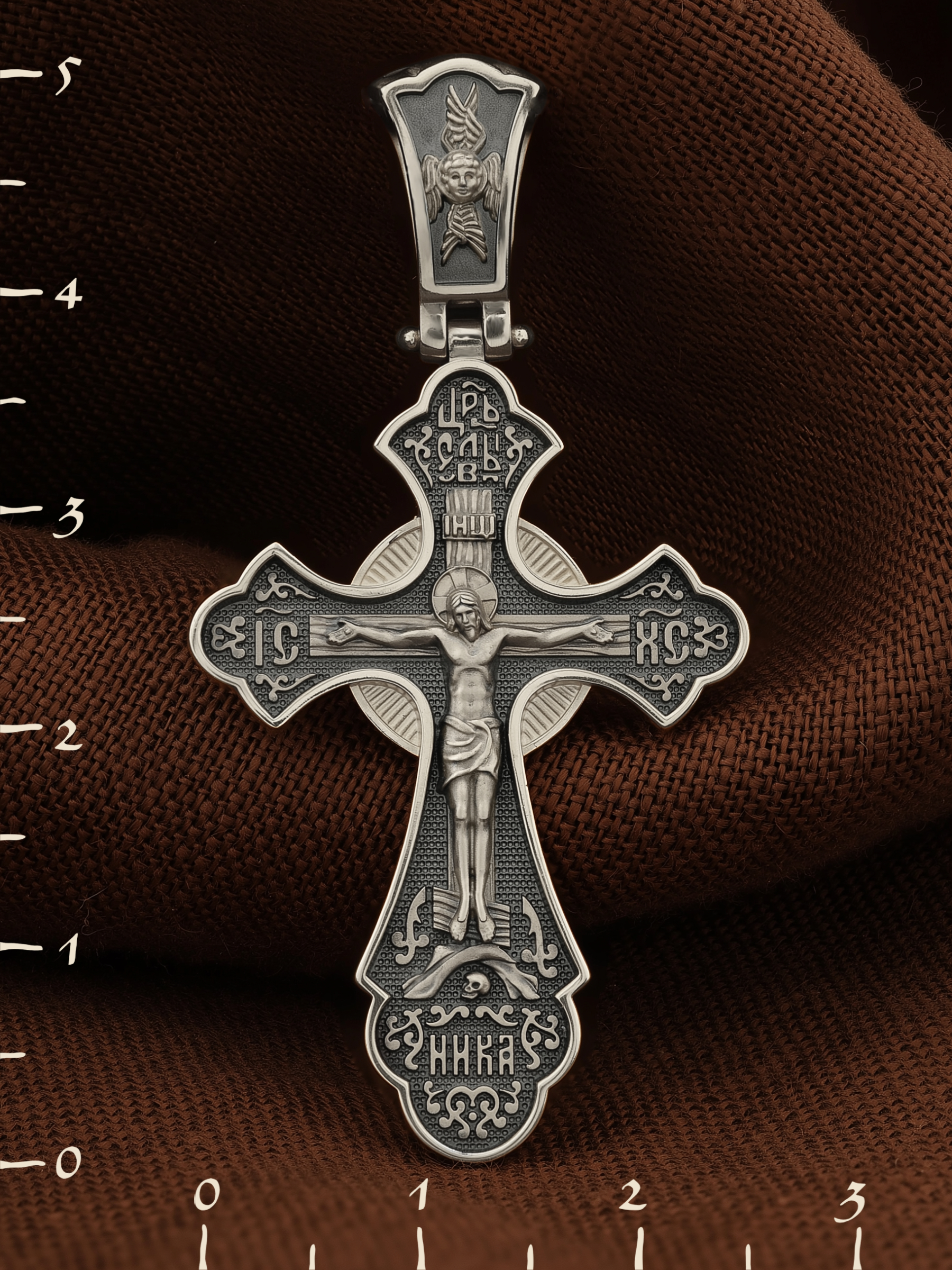 На лицевой стороне креста по каноническим правилам Церкви изображен Господь Иисус Христос. Сверху у изголовья Иисуса Христа размещена табличка с надписью в виде аббревиатуры ИНЦИ — «Иисус Назорей Царь Иудейский», которая, согласно Евангелию, была прибита к кресту после Распятия. У подножия креста Господа в виде скалистой горки изображена гора Голгофа с Главой Адамовой в пещере.