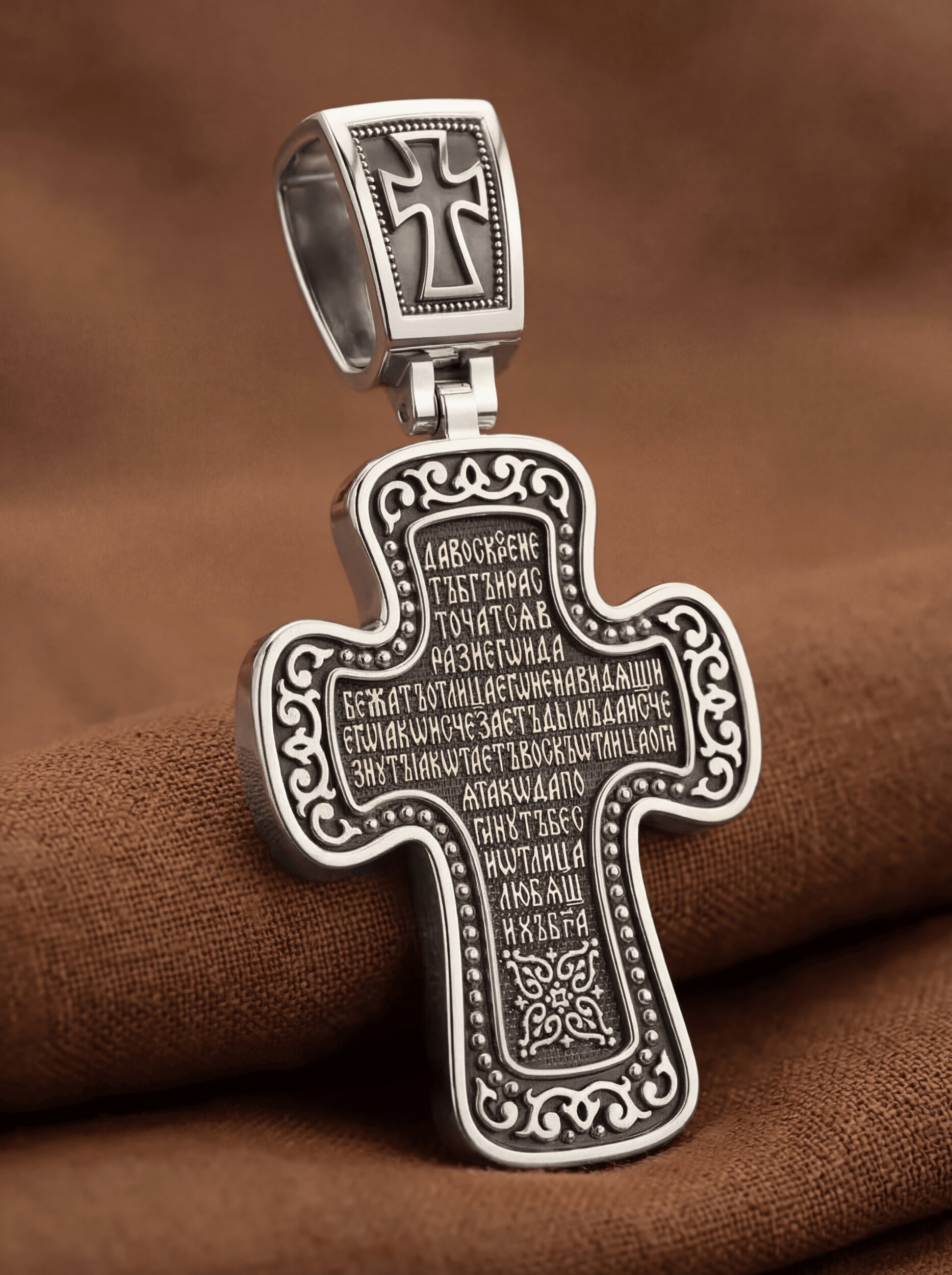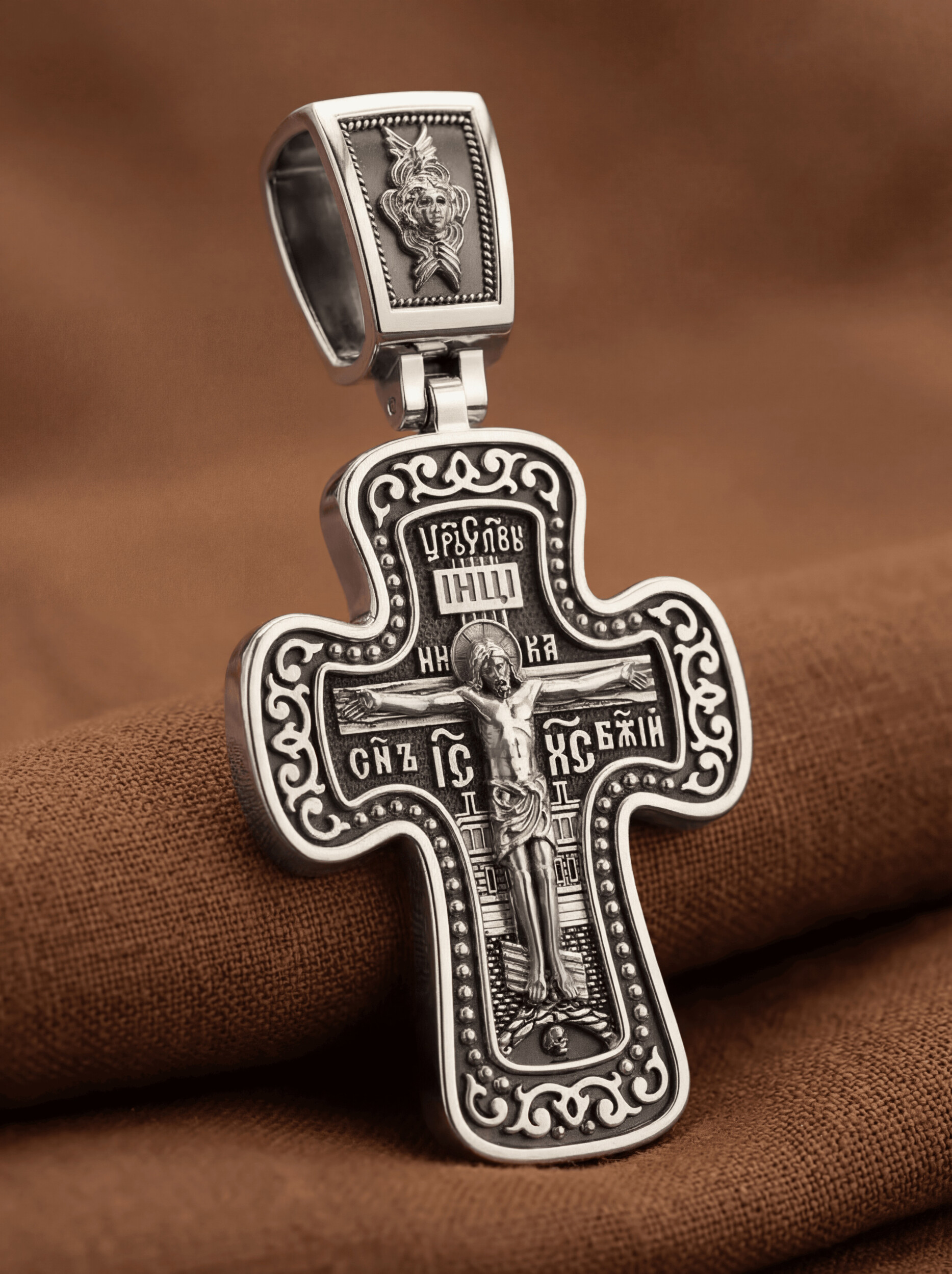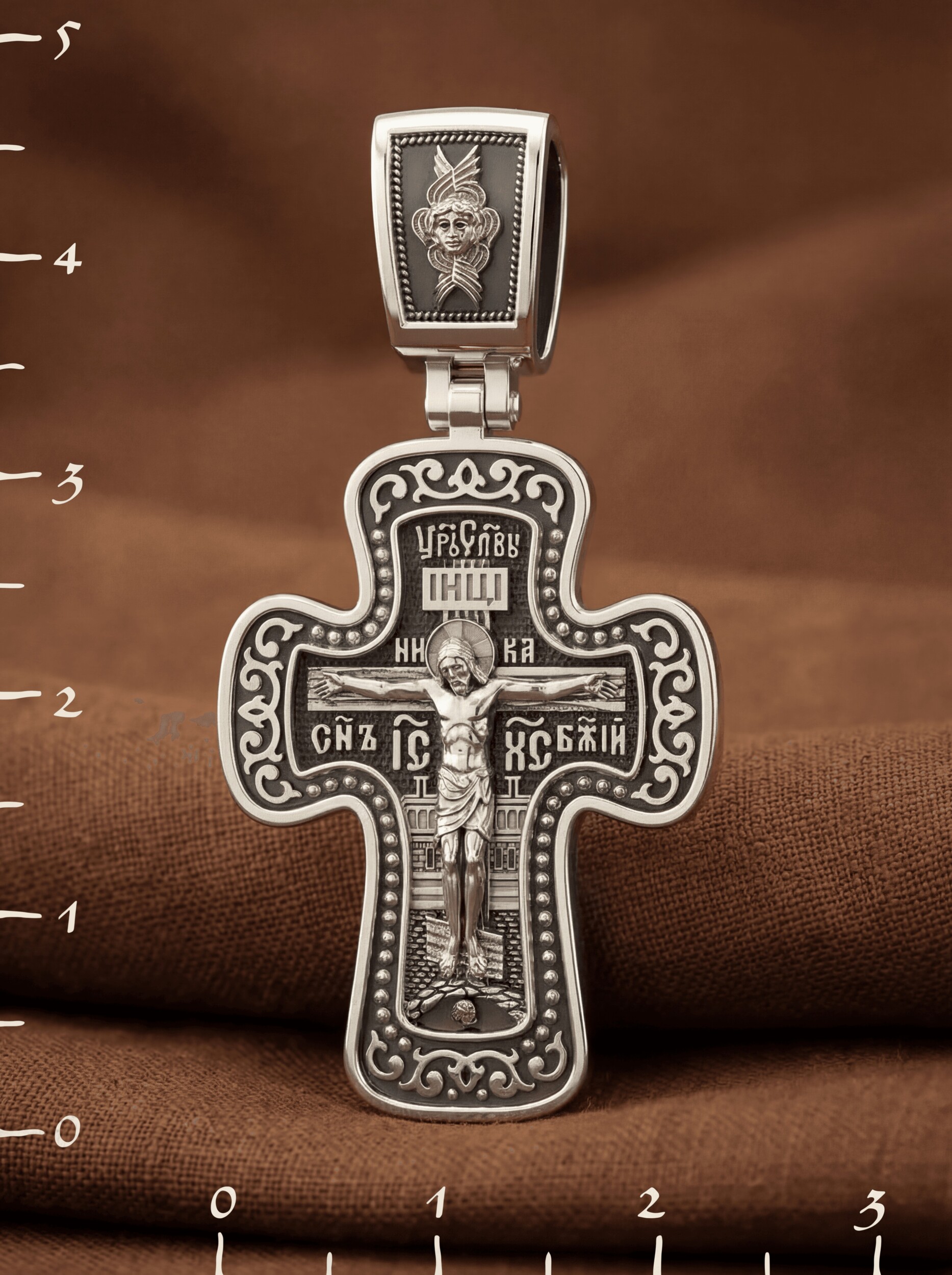 Распятие сопровождается каноническими надписями. Это святое имя Христа, которое принято писать на иконах сокращенно — «ИС ХС», словосочетание «СЫН БОЖИЙ», что означает божественную природу Иисуса Христа. Рядом с Его образом помещены слова «Царь Славы». Над головой Господа на поперечной перекладине аббревиатура «IНЦI», что символизирует табличку, которая была прибита к Кресту, с надписью «Иисус Назорей Царь Иудейский». На кулонном кольце помещено изображение Серафима.