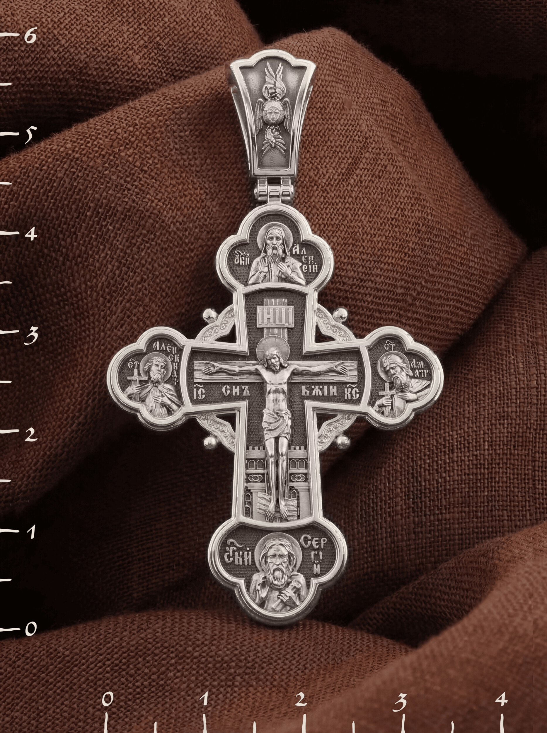 На лицевой стороне креста в центре изображено Распятие Господа Иисуса Христа. Слева от Господа находится святой благоверный князь Александр Невский, справа — святой благоверный князь Димитрий Донской. Святые князья почитаются как покровители воинов и защитники от врагов телесных и душевных. Вверху и над Распятием — образ митрополита московского святителя Алексия. Он почитается как помощник в воспитании детей и целитель, особенно при болезни глаз. Внизу — икона преподобного Сергия Радонежского, великого чудотворца и целителя. К нему обращаются в различных болезнях, тяжелых жизненных ситуациях, а также когда у детей возникают сложности в обучении.