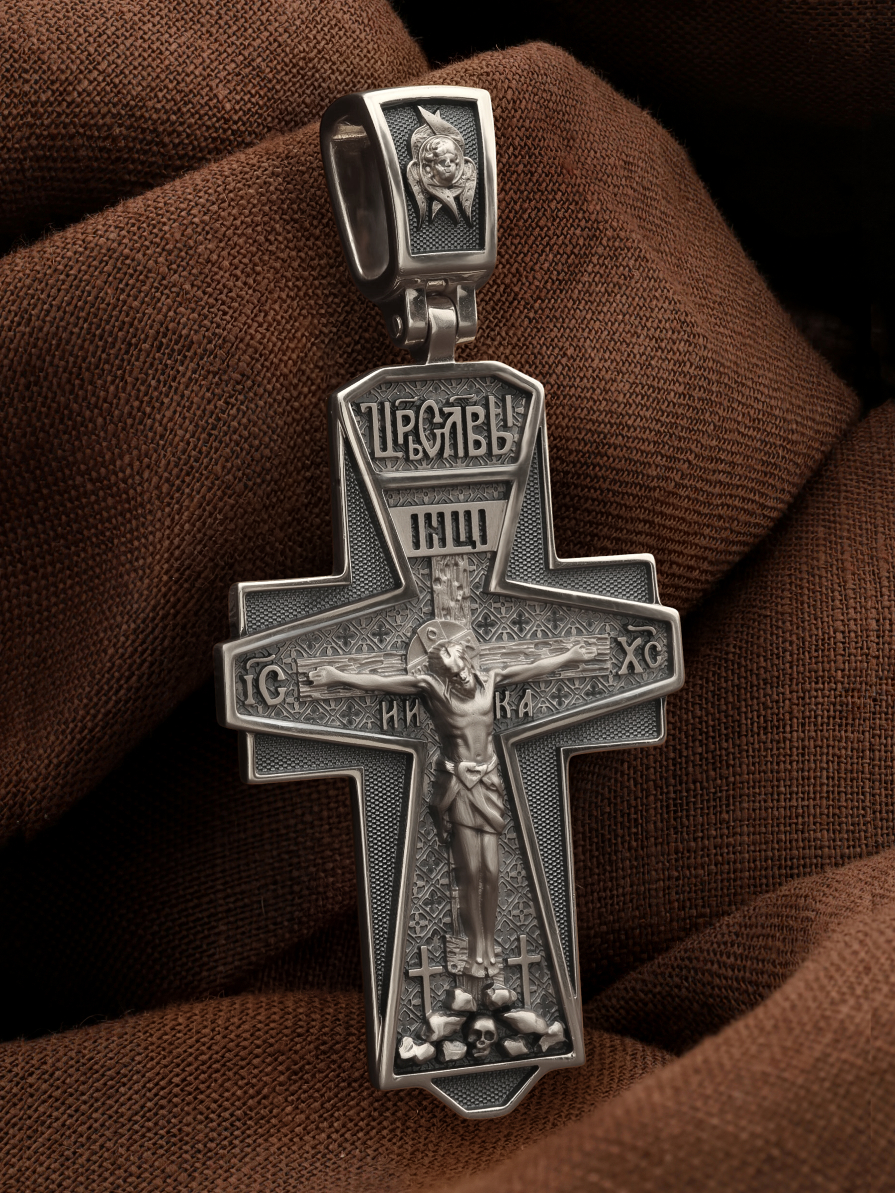 На лицевой стороне креста изображено Распятие, потому что это орудие казни Иисус Христос сделал орудием победы над грехом и смертью. Своими страданиями Он искупил грехи человечества, умерев и сошествовав во ад, победил сатану, освободил души праведников от вечной смерти и открыл им небесные врата рая. Жертва Христа сделала возможным спасение для каждого человека. На православном кресте Христос не умирает, а свободно простирает руки, ладони Иисуса открыты, будто он хочет обнять все человечество, даря им свою любовь и открывая путь к вечной жизни.