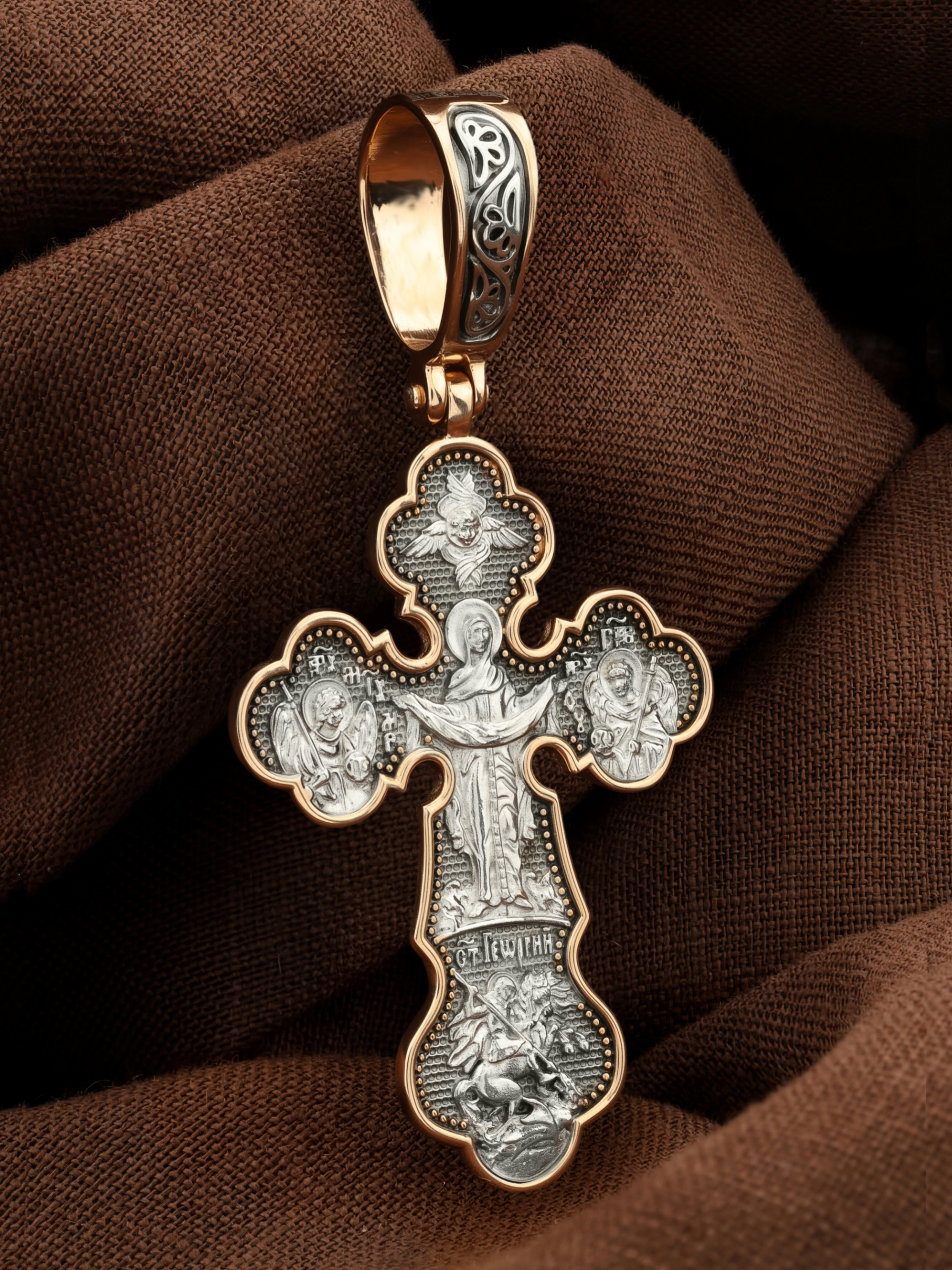 Центральную часть оборотной стороны креста украшает икона Божией Матери «Покров Пресвятой Богородицы». Праздник Покрова Пресвятой Богородицы пришел на Русь в XII веке из Византии и стал одним из самых почитаемых. Пресвятая Богородица простирает Свой молитвенный покров над всеми православными христианами и умоляет Сына своего о даровании вечного спасения каждому человеку. Над образом помещен шестикрылый Серафим. Справа помещено изображение Архангела Гавриила, слева- Архангела Михаила. На кресте внизу помещено изображение Святого Великомученика Георгия Победоносца — одного из самых почитаемых и удивительных святых. Он изображен как воитель, сидящий на вздыбленном коне и поражающий копьем огнедышащего змея. Змей символизирует собою сатанинские силы.