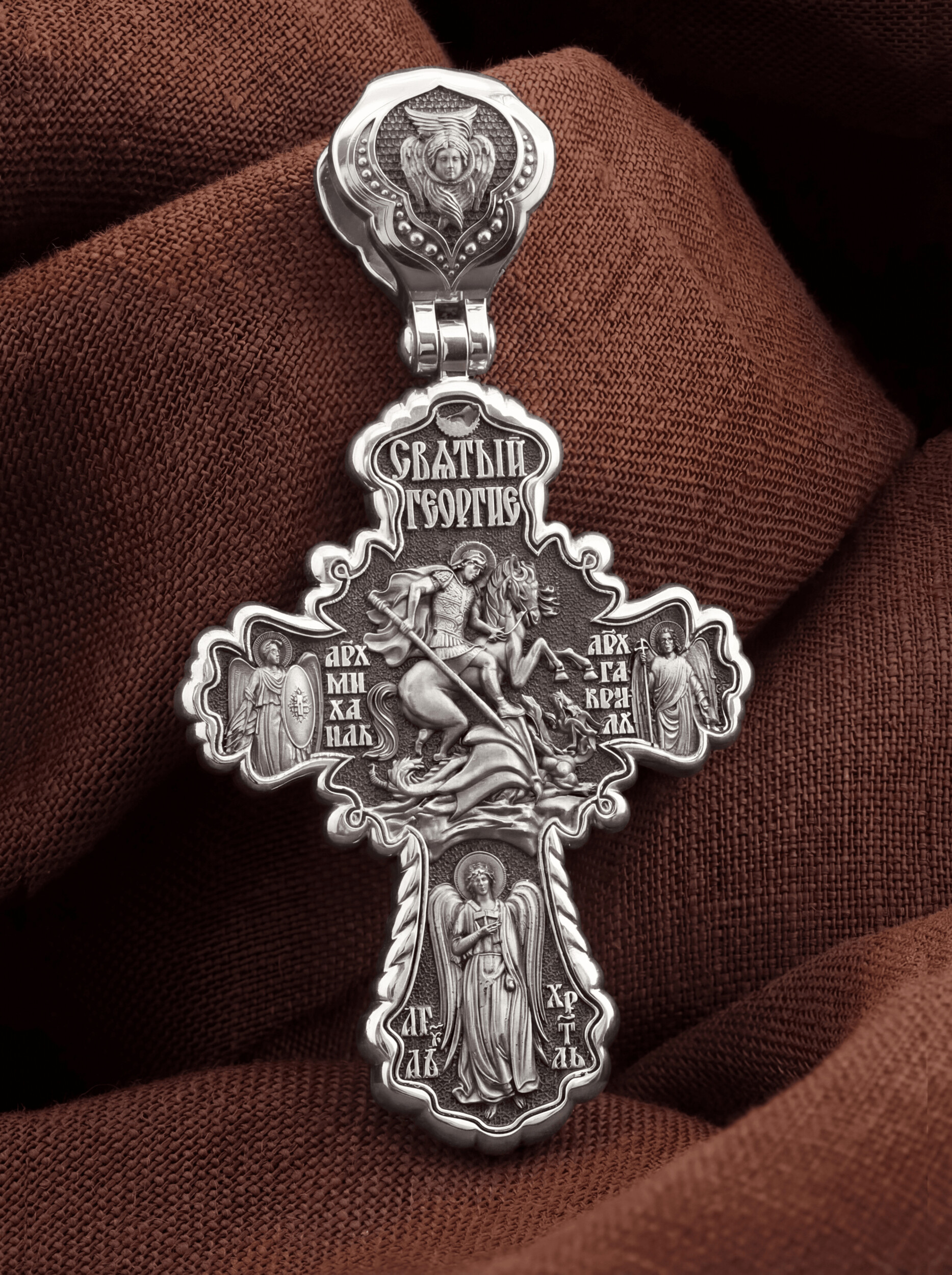 В центре оборотной стороны креста помещено изображение Святого Великомученика Георгия Победоносца. Он изображен как воитель, сидящий на вздыбленном коне и поражающий копьем огнедышащего змея. Змей символизирует собою сатанинские силы. Молитвами вознесенными к Всевышнему и своей непреклонной верой он смог одолеть чудовище. Святой убил змея, спас царскую дочь, принесенную в жертву, и жителей города, их души от влияния дьявола, породив в них надежду и веру в Господа, призывая людей принять христианскую веру. Слева от Святого Георгия изображен Архистратиг Михаил, справа — Архангел Гавриил. Ниже помещен образ Ангела Хранителя. На кулонном кольце изображен шестикрылый Ангел — Серафим.