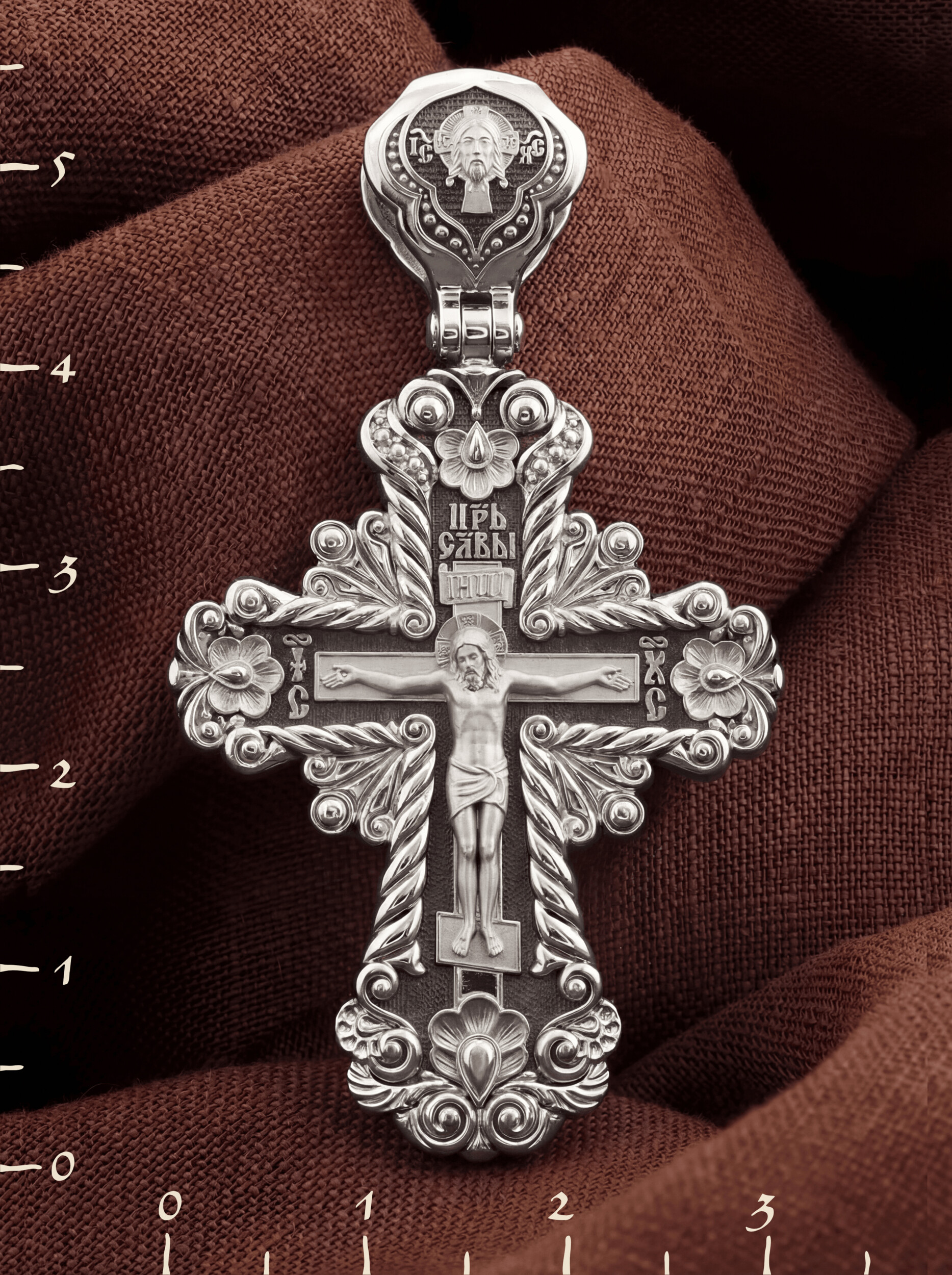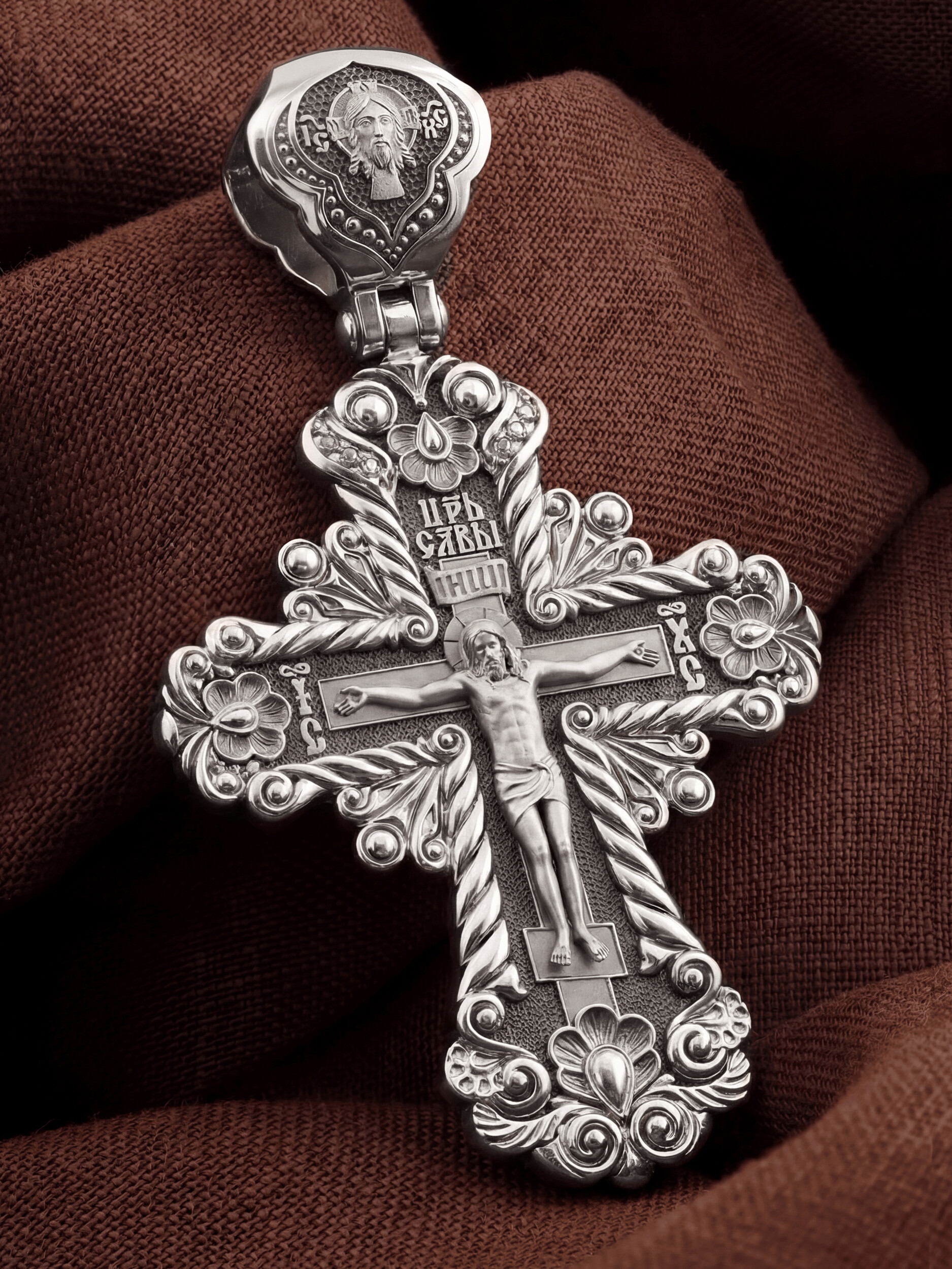 На лицевой стороне креста изображено Распятие Господа и Спасителя нашего Иисуса Христа, отдавшего Себя на смерть, для искупления грехов мира. Крест является символом жертвенной любви Всеблагого Бога к падшим людям, всепобеждающим духовным оружием христиан, основанием и средоточием церковной жизни. Господь сказал: кто хочет идти за Мною, отвергнись себя, и возьми крест свой, и следуй за Мною. (Мк. 8: 34). Над Распятием помещена надпись «Царь Славы». На верхней табличке, выше головы Иисуса, расположена надпись, составленная Понтием Пилатом — «IНЦI». Она означает «Иисус Назорей, Царь Иудейский». Надпись «IC» «ХC», означает Иисус Христос, помещается на разных сторонах поперечной перекладины креста. На кулонном кольце изображен Нерукотворный образ Господа и Спасителя нашего Иисуса Христа, чудесно отпечатавшийся на плате, которым Христос вытер свой лик.