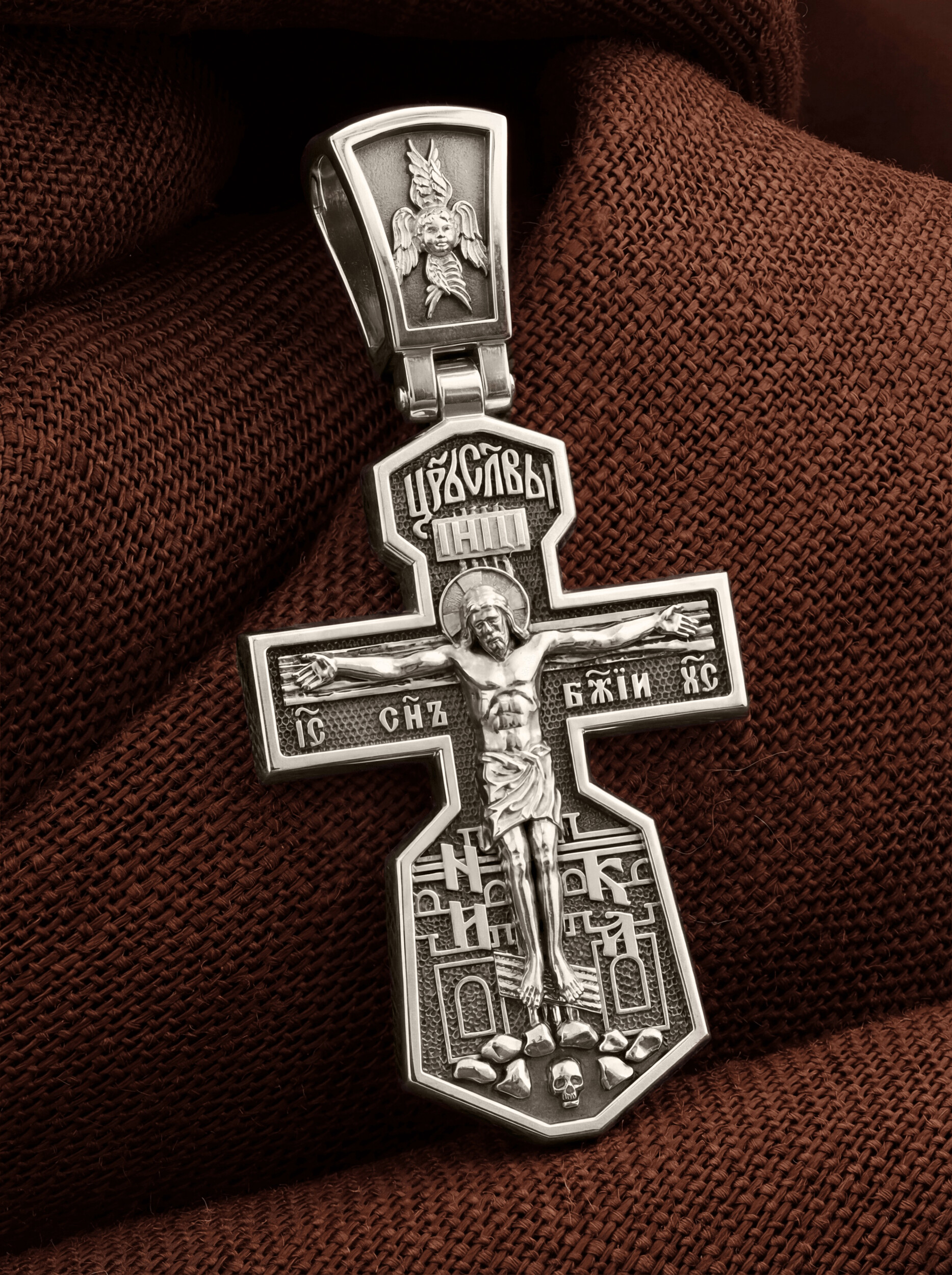 На лицевой стороне креста изображено Распятие Иисуса Христа. Господь представлен свободно покоящимся на кресте с простертыми руками и как бы обнимающим всю Вселенную. Он — Спаситель, искупивший грехи мира, «поправший смертию смерть» и призывающий к Себе «все концы земли». Поэтому рядом с Его образом помещены слова — «НИКА» и «Царь Славы». Эти слова характеризуют Господа как Великого Архиерея, победителя смерти. Верхняя перекладина символизирует титло — табличку, на которой, согласно Евангелию, было начертано: Иисус Назорей Царь Иудейский (IНЦI). Также Распятие сопровождается надписями, олицетворяющими Христа. Это святое имя Христа «IC» (Иисус) «ХС» (Христос), и словосочетание «СЫН БОЖИЙ».