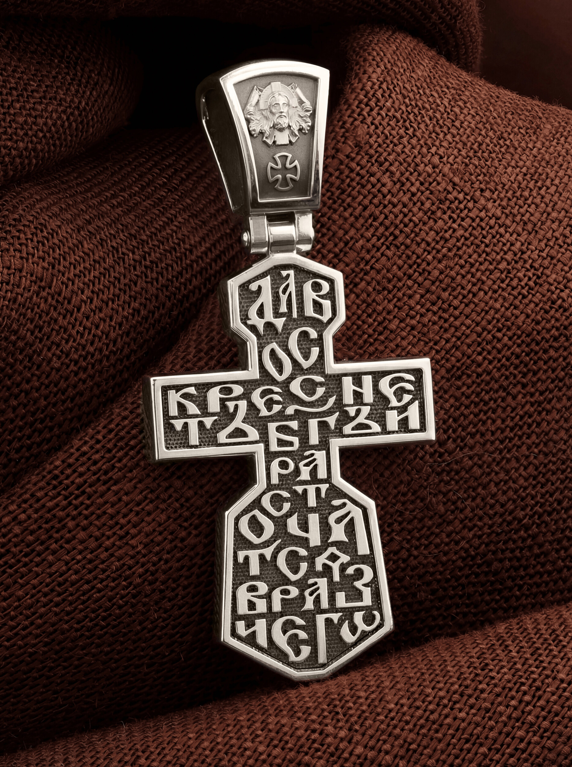 Всю оборотную часть креста занимает начальный стих оградительной молитвы Честному Кресту Господню: «Да воскреснет Бог, и расточатся врази Его».