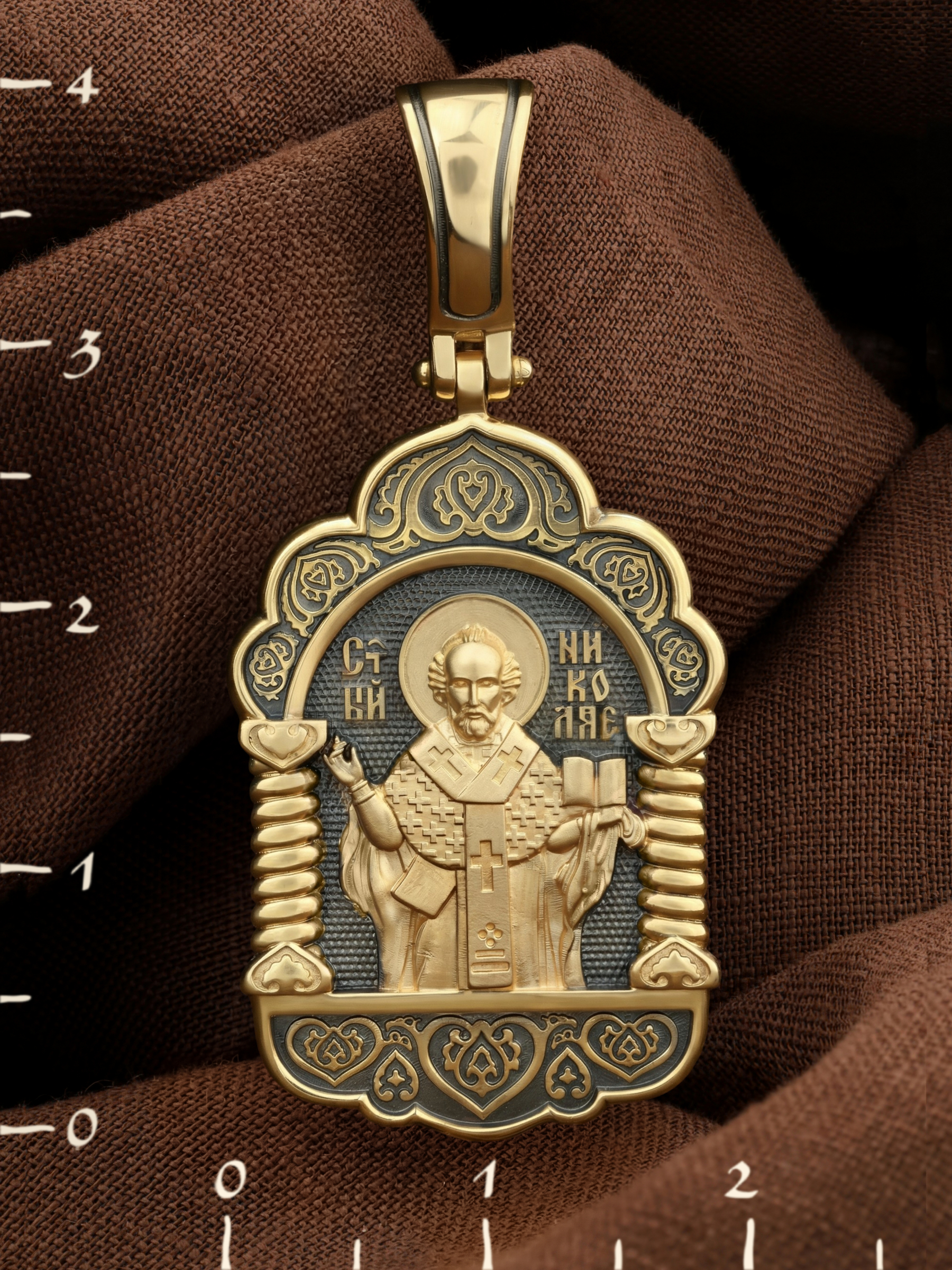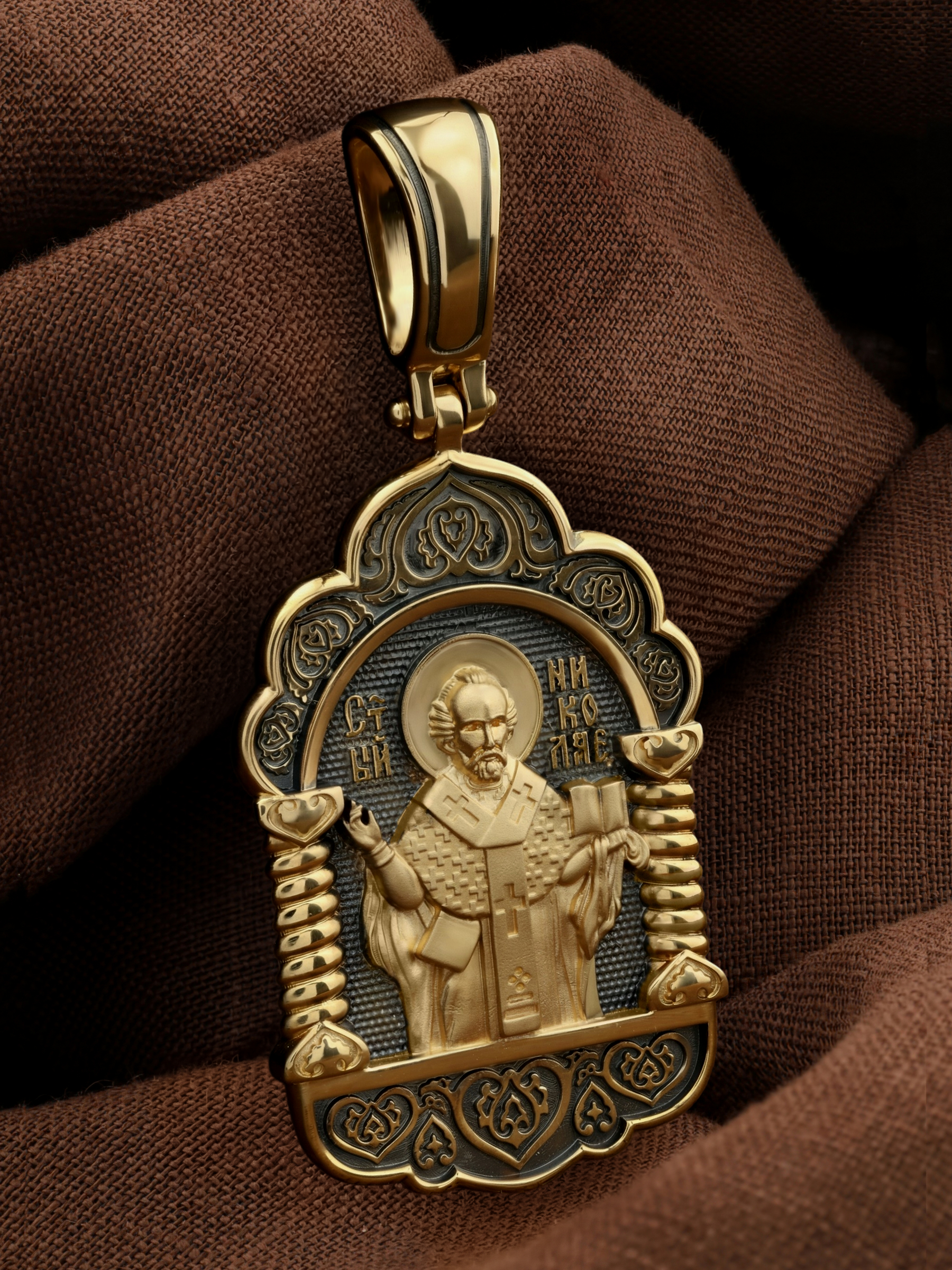 На лицевой стороне образка изображен Святитель Николай архиепископ Мир Ликийских, Чудотворец. Он является одним из самых почитаемых святых в православном мире. Святитель Николай родился во второй половине III века в Малой Азии в Ликийском городе Патары. С рождения Божий Угодник проявлял необыкновенные дарования. Сохранилось Предание, что во время крещения он, никем не поддерживаемый, простоял в купели три часа. Приняв сан священника, святитель Николай стал проводить еще более строгую подвижническую жизнь. Из­бран­ник Бо­жий Ни­ко­лай стал вершиной всех доб­ро­де­те­лей, подня­той до рай­ской вы­со­ты. С кем из ве­ли­чай­ших пра­вед­ни­ков не срав­нял­ся он об­ра­зом ду­хов­ной кра­со­ты, ко­му из них не по­сле­до­вал в сво­их де­я­ни­ях и чудотворениях? Вся жизнь святого Николая — это служение Богу. Много великих и преславных чудес сотворил великий Святитель Николай Угодник. Он помогал сущим в бедах, укрощал штормы, спасал от потопления и выносил на сушу из глубины морской, освобождал из плена и приносил освобожденных домой, избавлял от уз и темницы, защищал от посечения мечом, освобождал от смерти и подавал многим различные исцеления, слепым прозрение, хромым хождение, глухим слух, немым дар слова.