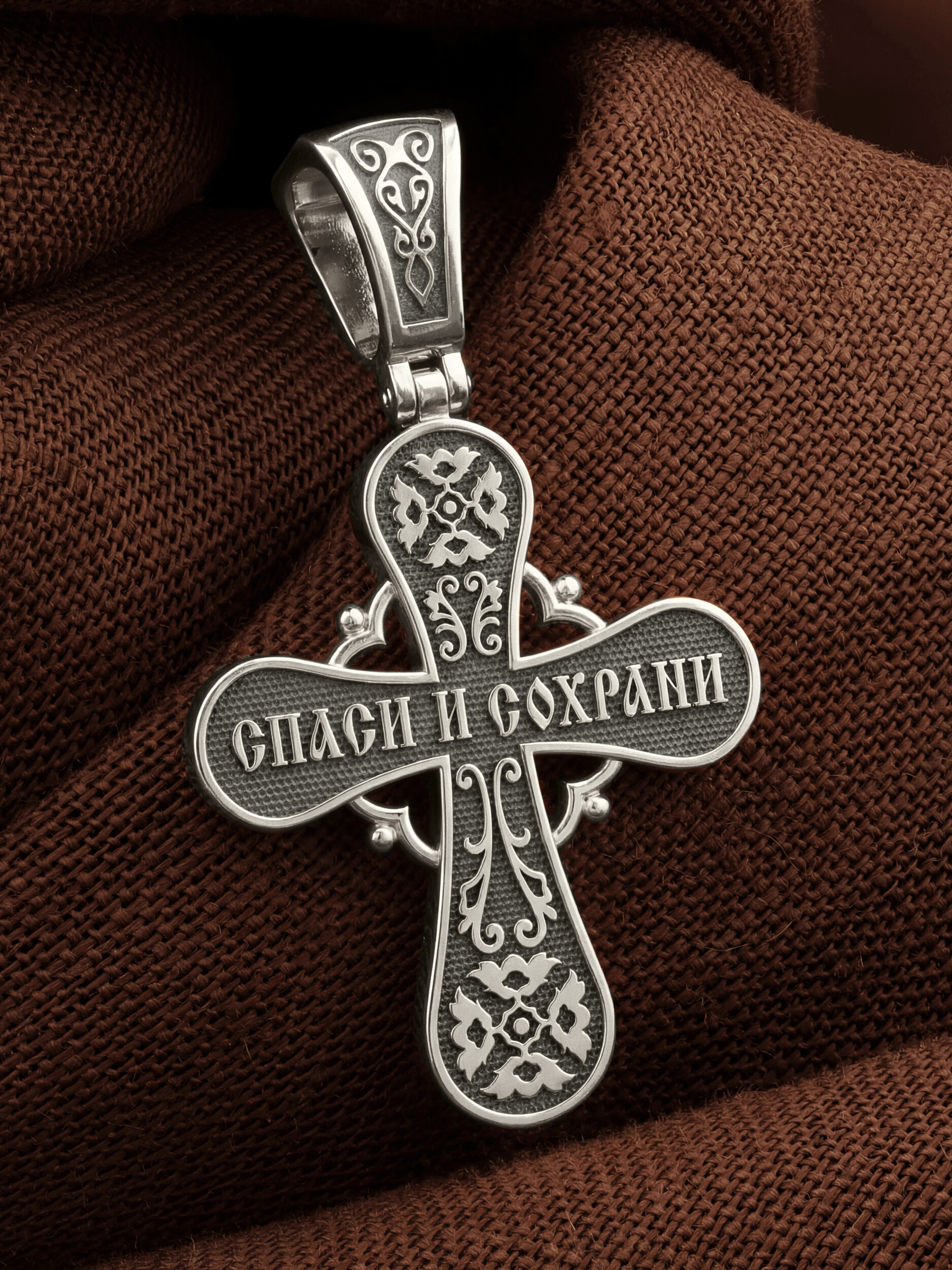 На обороте данного креста, в окружении изящного растительного узора, написано молитвенное славословие: «Спаси и сохрани».