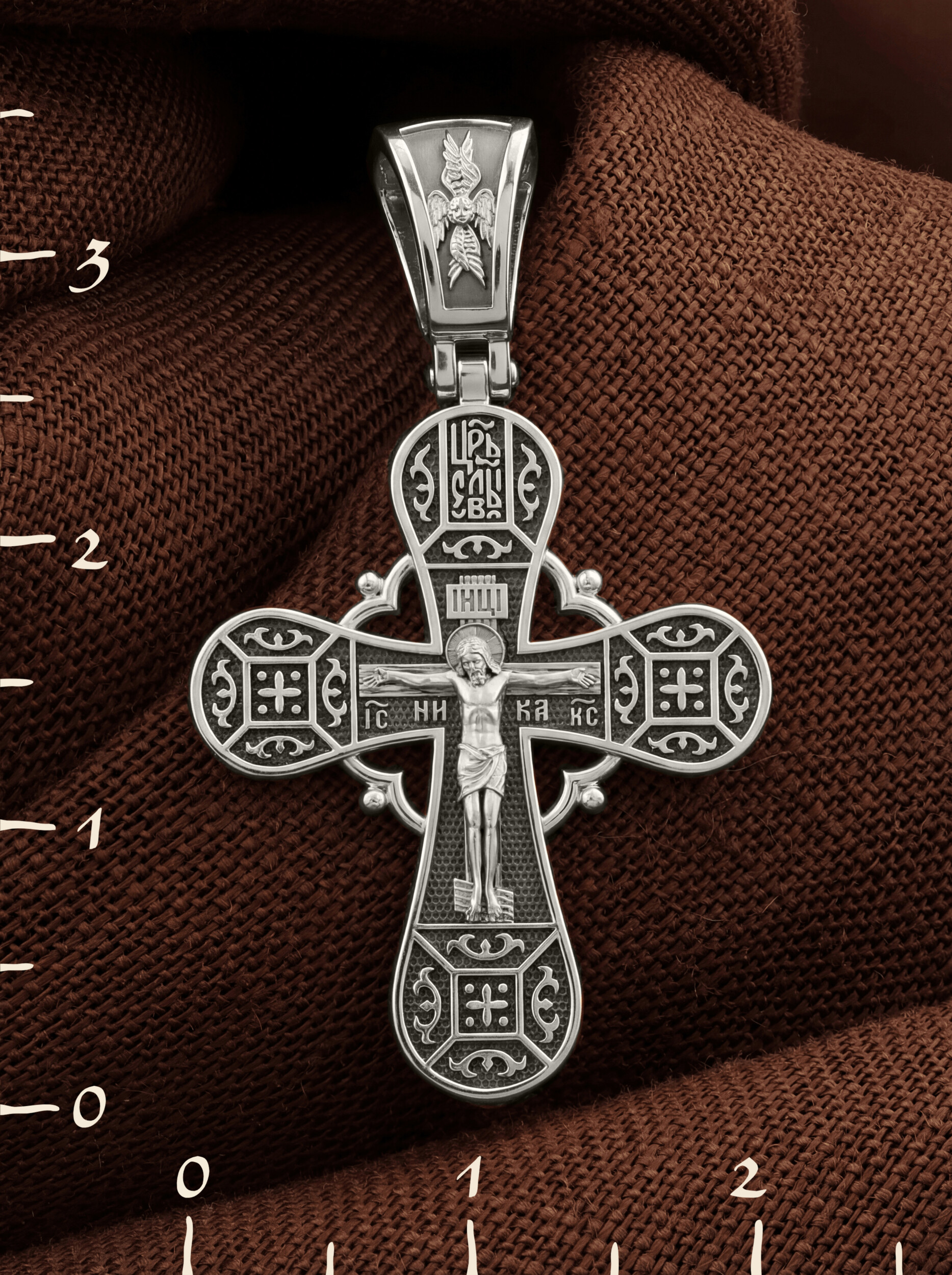 На лицевой стороне креста изображено Распятие, потому что это орудие казни Иисус Христос сделал орудием победы над грехом и смертью. Своими страданиями Он искупил грехи человечества, умерев и сошествовав во ад, победил сатану, освободил души праведников от вечной смерти и открыл им небесные врата рая. Жертва Христа сделала возможным спасение для каждого человека. На православном кресте Христос не умирает, а свободно простирает руки, ладони Иисуса открыты, будто он хочет обнять все человечество, даря им свою любовь и открывая путь к вечной жизни. Над титлом видим слова «ЦРЬ СЛВЫ» — Царь Славы. Верхняя перекладина символизирует собой табличку с надписью «IHЦI» — Иисус Назарянин Царь Иудейский. Под перекладиной пишется сокращенно имя Спасителя «IC XC» — Иисус Христос, рядом добавляется: «НИКА» (греч. — Победитель). Возвышение, на котором стоит Крест, символизирует гору Голгофу, на которой произошло Распятие. У подножия Креста изображают прах Адама, обозначенный черепом.