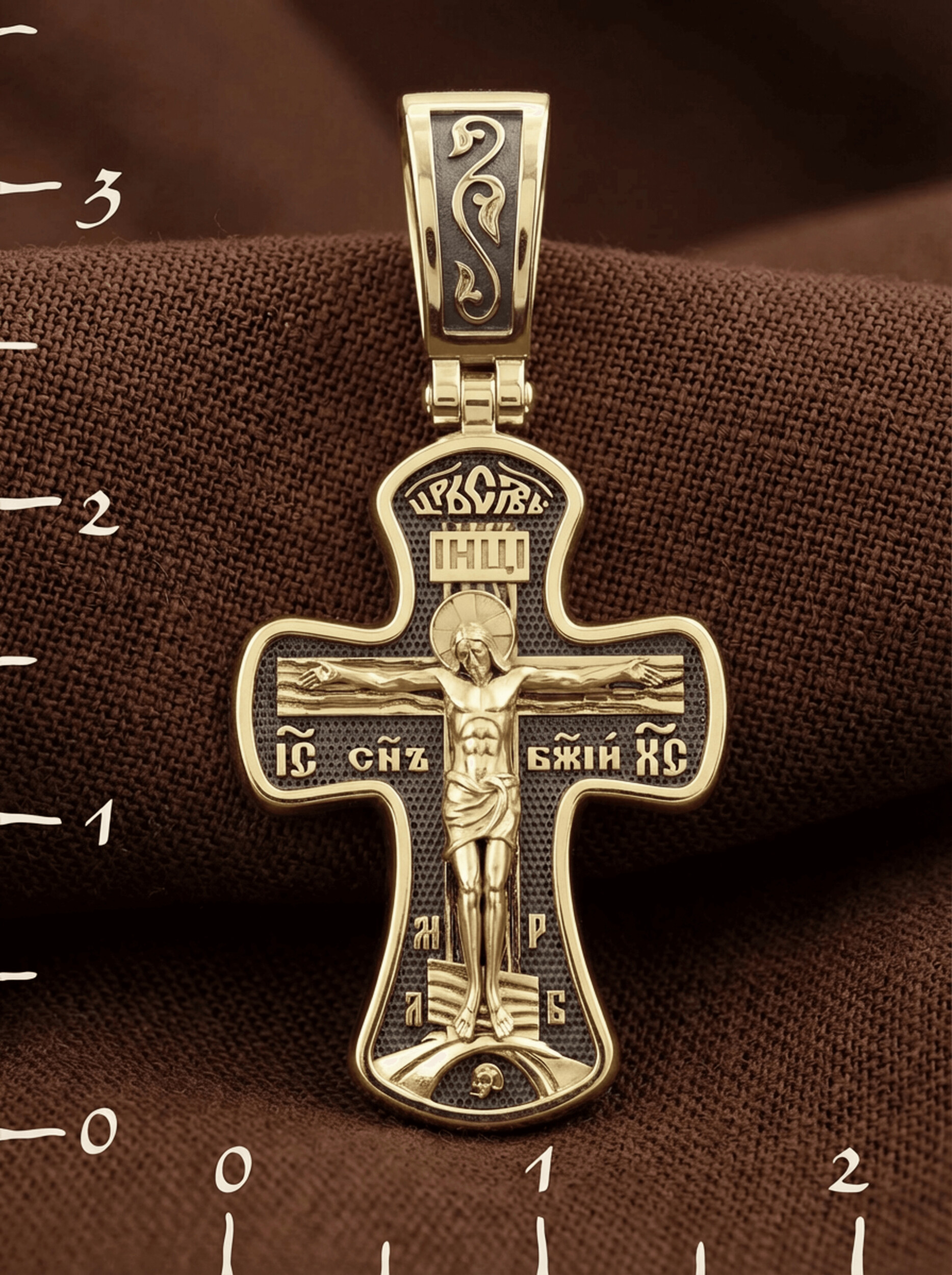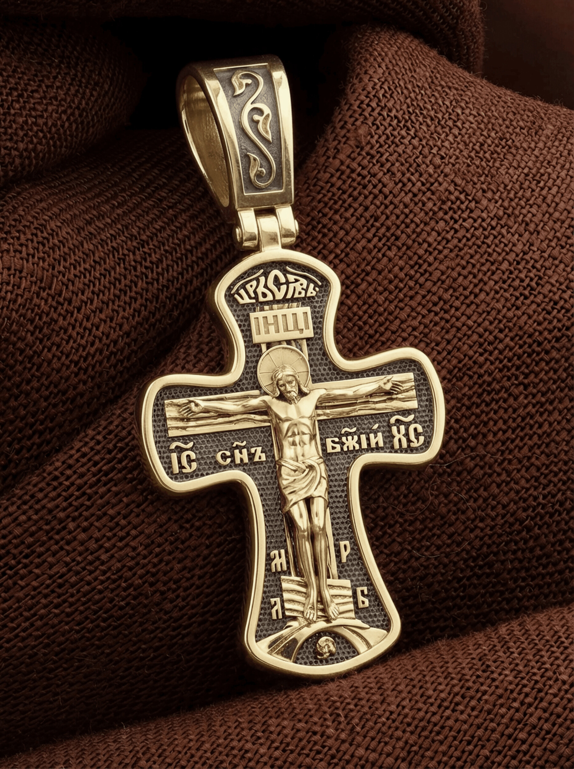 Крест четырехконечный со слегка расширяющимися лопастями. Такая форма креста имеет многочисленные духовные смыслы. Ее устремленная ввысь вертикаль означает справедливость и непреложность Божественных заповедей, прямоту Божией правды и истины, не допускающей никаких нарушений. Эта прямота пересекается поперечной перекладиной, означающей любовь и милость Божию к грешным людям. На лицевой стороне креста изображено Распятие, потому что это орудие казни Иисус Христос сделал орудием победы над грехом и смертью. На лицевой стороне креста изображено Распятие Иисуса Христа. Над титлом видим слова «ЦРЬ СЛВЫ» — Царь Славы. Верхняя перекладина символизирует собой табличку с надписью «IHЦI» — Иисус Назарянин Царь Иудейский. Над перекладиной пишется сокращенно имя Спасителя «IC XC» — Иисус Христос и словосочетание «СНЪ БЖIЙ» — «СЫН БОЖИЙ». Две пары букв на кресте «МЛ» «РБ» означают: Место Лобное Рай Бысть. Возвышение, на котором стоит Крест, символизирует гору Голгофу, на которой произошло Распятие. У подножия Креста изображают прах Адама, обозначенный черепом.