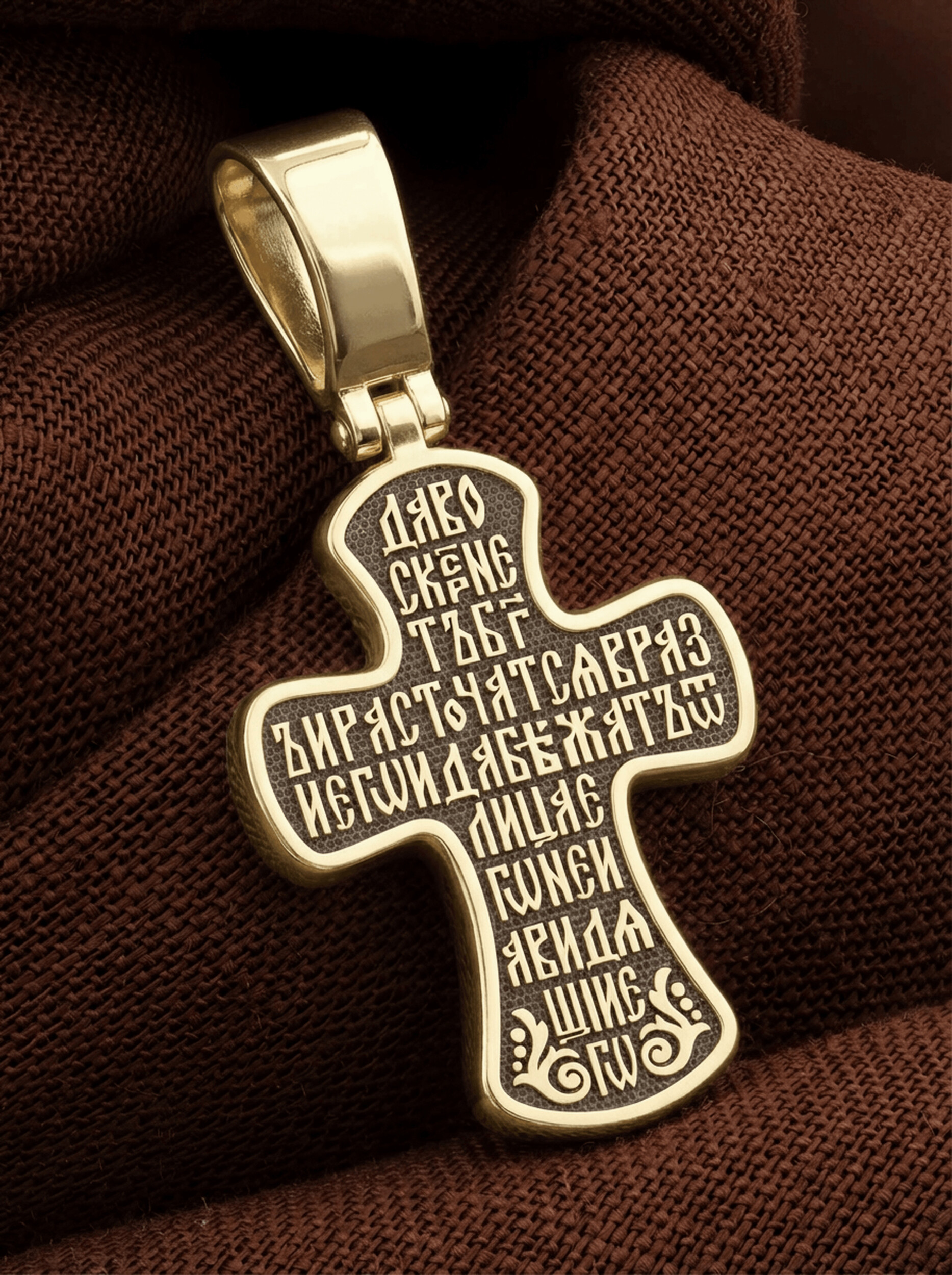 Всю оборотную часть креста занимает начальный стих оградительной молитвы Честному Кресту Господню: «Да воскреснет Бог, и расточатся врази Его, и да бежат от лица Его ненавидящие Его.»
