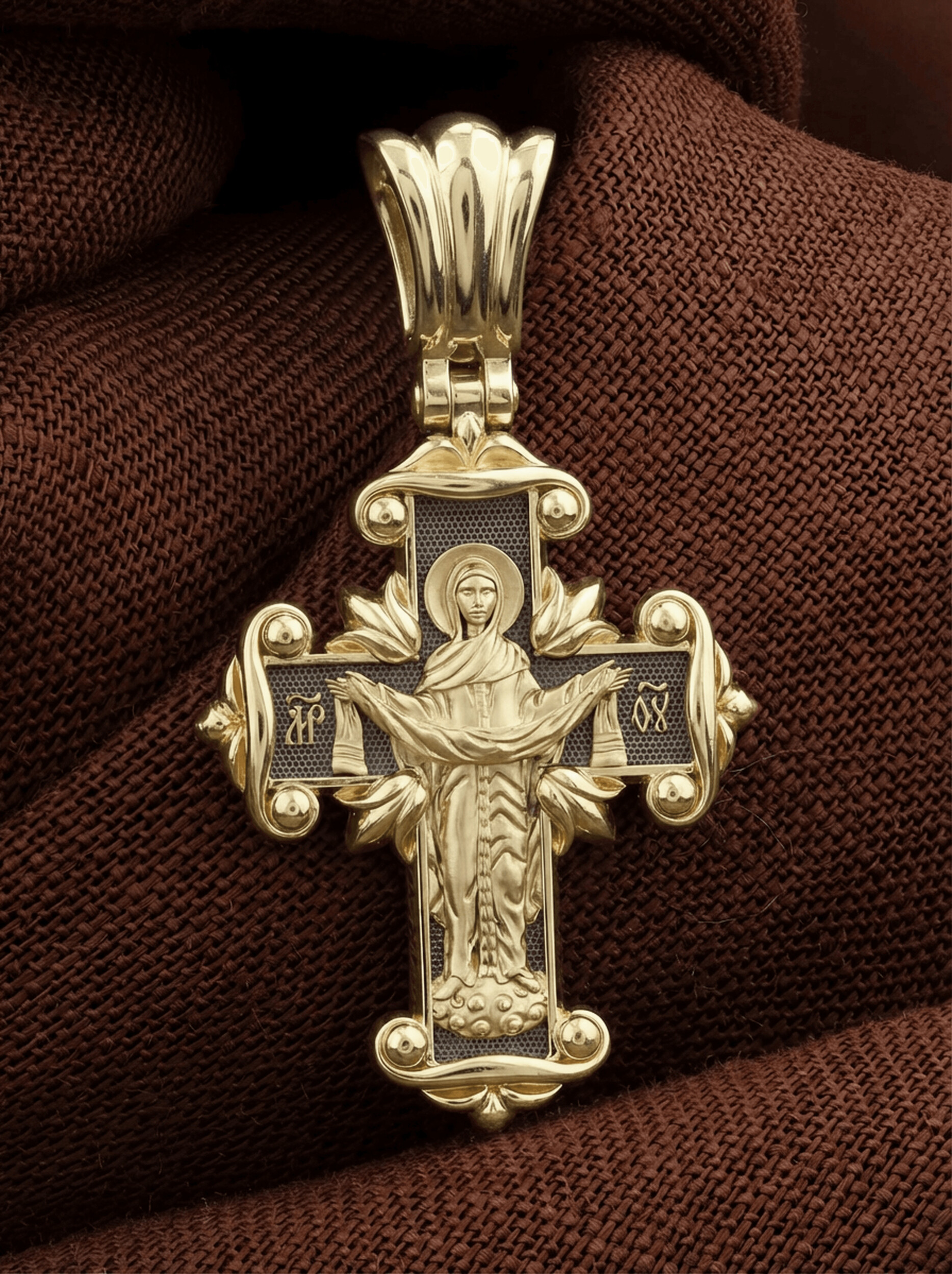 На оборотной стороне креста изображена икона Божией Матери «Покров Пресвятой Богородицы». Праздник Покрова Пресвятой Богородицы пришел на Русь в XII веке из Византии и стал одним из самых почитаемых. В 910 году Византийской Империи угрожали нападением сарацины. Не видя ниоткуда помощи, в те дни греки во множестве стекались в Константинополь, во Влахернский храм, в котором хранились риза Богоматери и Ее головной покров, и молились. 1 (14) октября 910 года Святому Андрею Юродивому и его ученику Епифанию было видение Покрова Божией Матери. Пресвятая Богородица, в окружении Святых, явилась над алтарем Храма и слезно молилась. По окончании молитвы сняла с Себя блистающее великое и страшное покрывало, которое носила на Пречистой главе Своей и, держа его с великой торжественностью, распростерла над всем стоящим народом. Вскоре враги без всякого кровопролития отступили от города. Богородица простирает Свой молитвенный покров над всеми православными христианами и умоляет Сына своего о даровании вечного спасения каждому человеку.