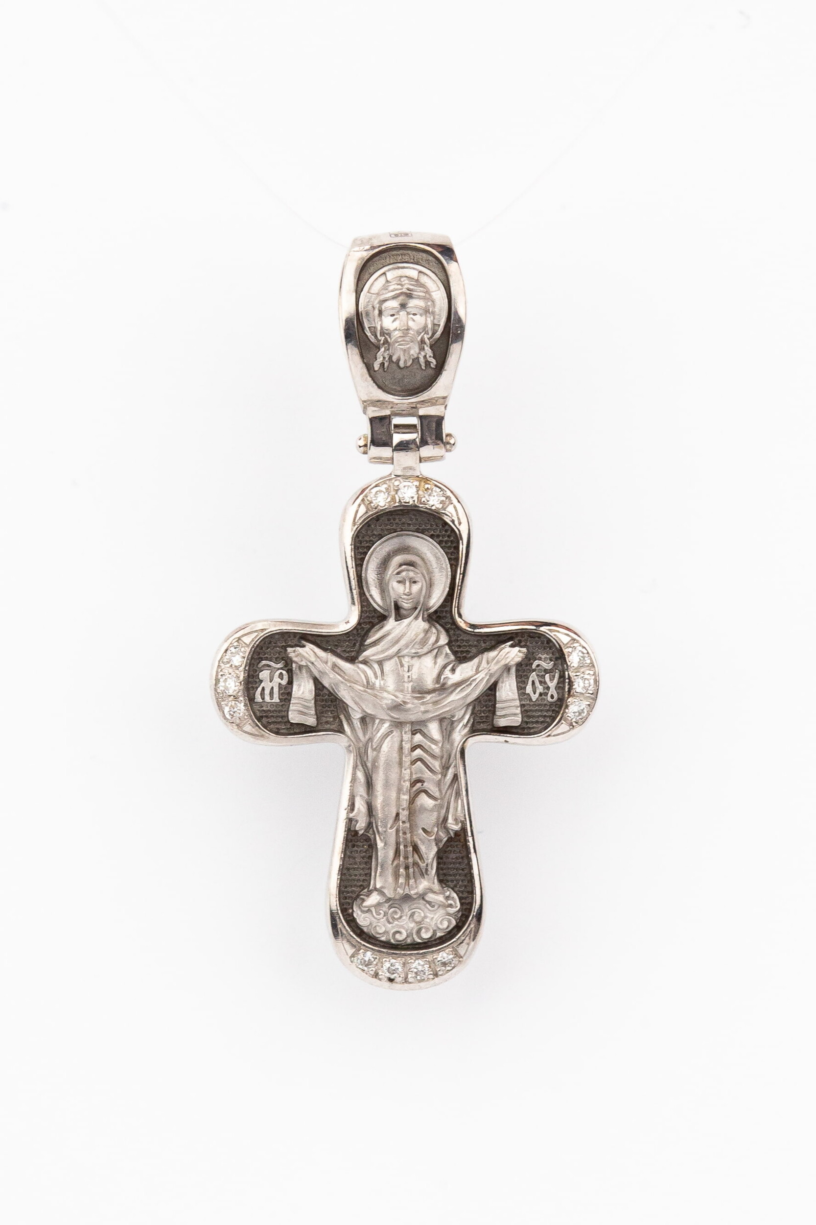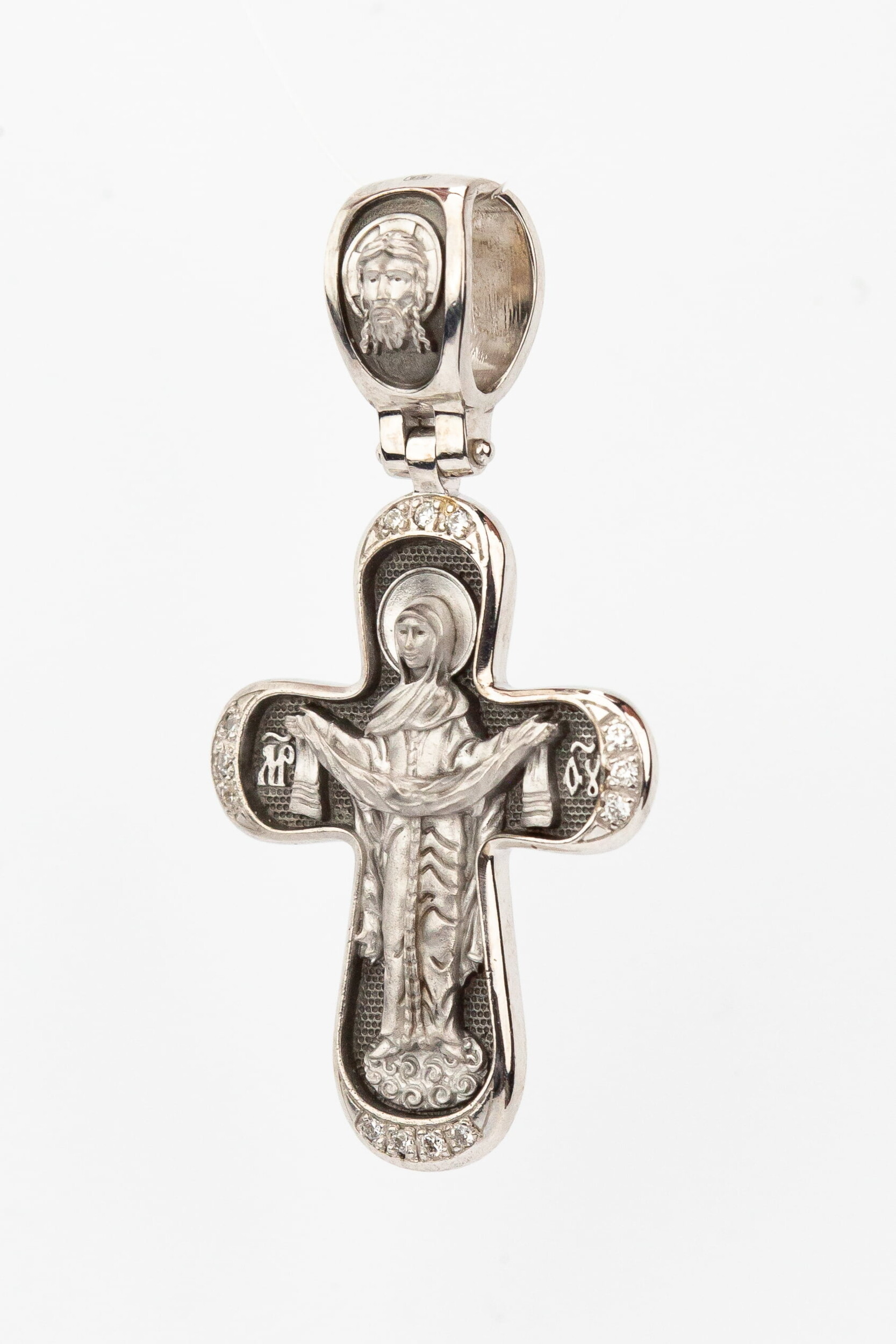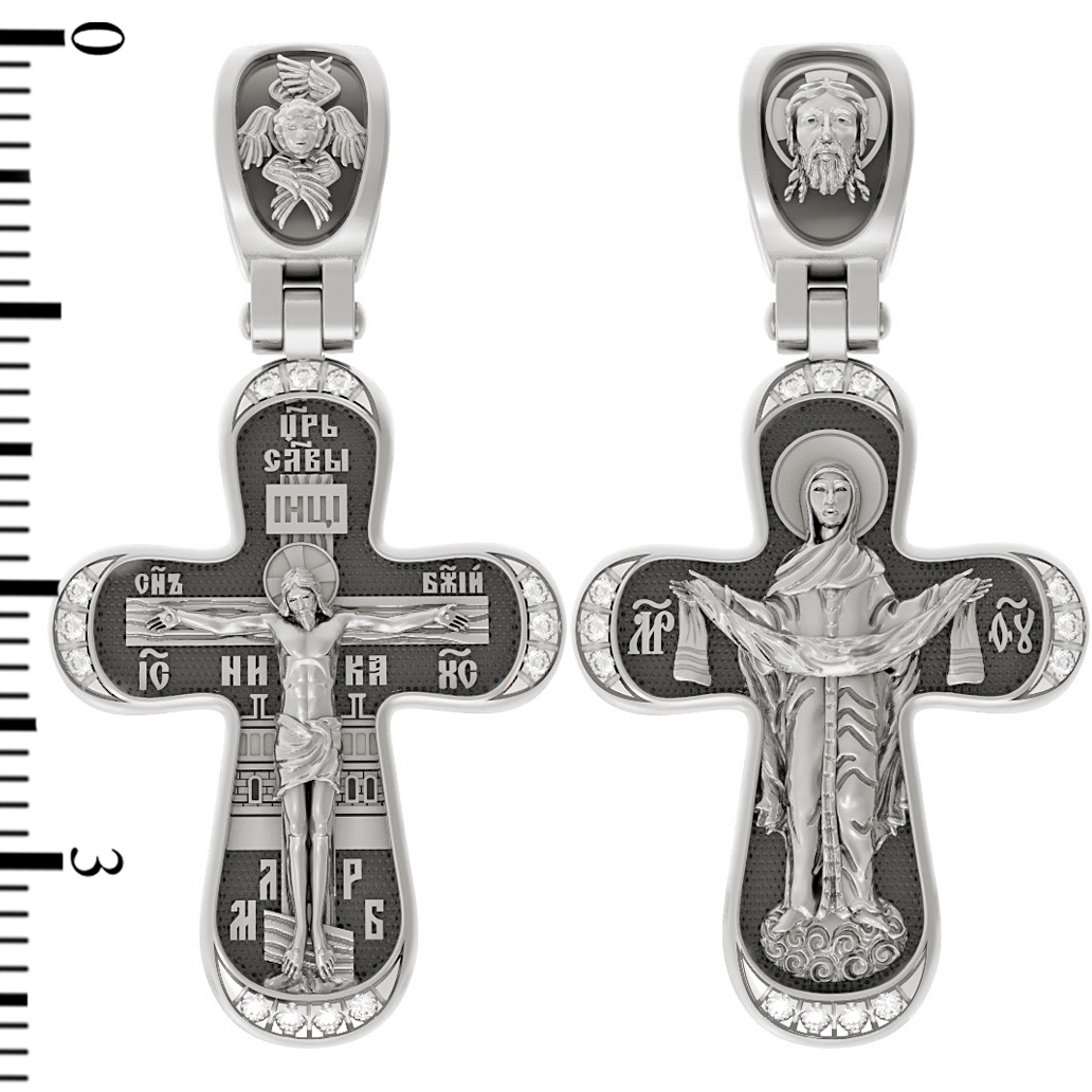 На обороте креста изображена икона Покрова Пресвятой Богородицы. Праздник Покрова Божией Матери является воспоминанием чуда, которое произошло во Влахнернской церкви 1 (14) октября 910 года: Пресвятая Богородица явилась верующим над алтарем храма и распростерла над ними Свое покрывало. В этот день Божья Матерь открыла людям, что Она является Ходатаицей за них перед Богом. Богородица простирает Свой молитвенный покров над всеми православными христианами и умоляет Сына Своего о даровании вечного спасения каждому человеку. На кулонном кольце помещено изображение Спаса Нерукотворного — образ Спасителя, который Он запечатлел на плате и передал для исцеления больному проказой царю Эдессы. Ему придается победное и защитное значение.