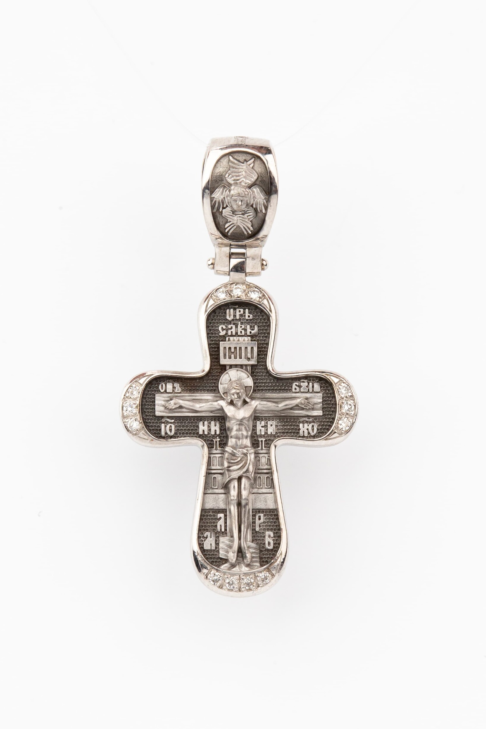 На лицевой стороне креста изображено Распятие Иисуса Христа. Господь представлен свободно покоящимся на кресте с простертыми руками и как бы обнимающим всю Вселенную. Он — Спаситель, искупивший грехи мира, «поправший смертию смерть» и призывающий к Себе «все концы земли». Поэтому рядом с Его образом помещены слова «Царь Славы». Эти слова характеризуют Господа как Великого Архиерея, победителя смерти. Верхняя перекладина символизирует титло — табличку, на которой, согласно Евангелию, было начертано: Иисус Назорей Царь Иудейский (IНЦI). Также Распятие сопровождается надписями, олицетворяющими Христа. Это святое имя Христа «IC» (Иисус) «ХС» (Христос), и словосочетание «Сын Божий». Крест стоит на горе камней, символизирующих Голгофу, в основании которой различается череп. Это голова Адама. На кулонном кольце помещено изображение серафима.