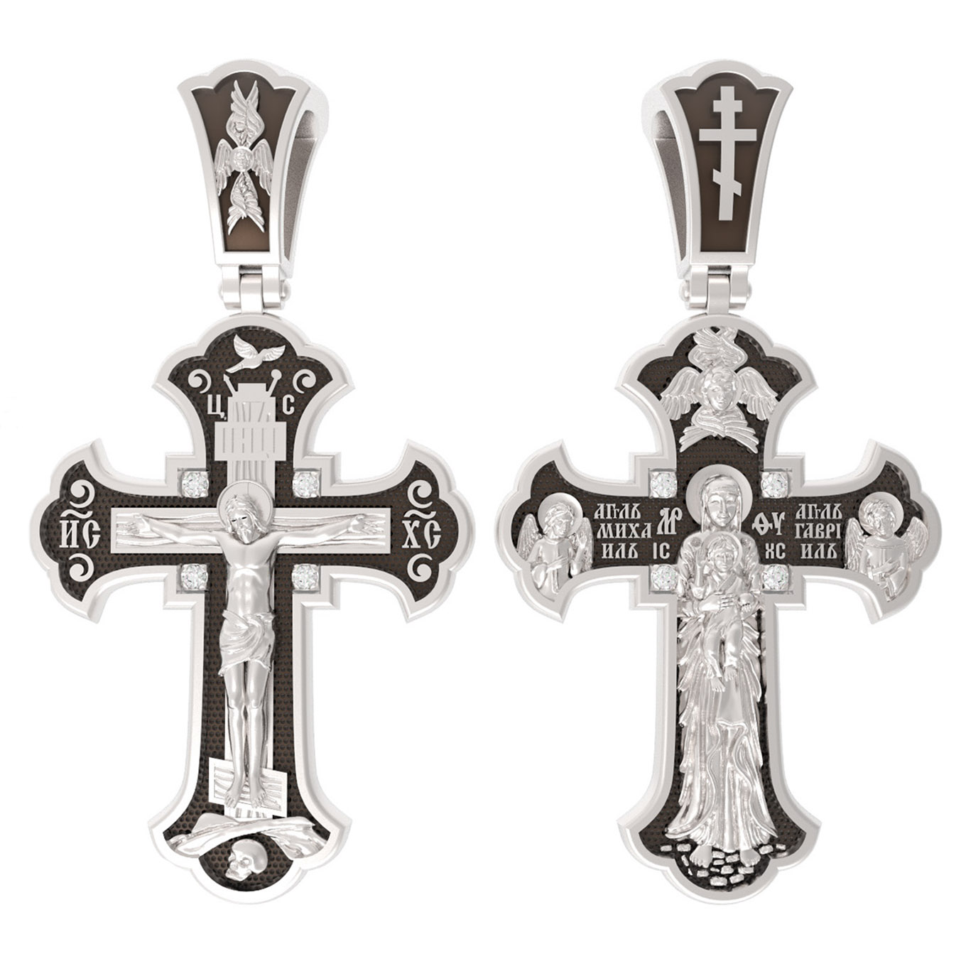 На лицевой стороне этого креста центральную часть занимает икона Распятия Христа — образ жертвы, принесенной Господом за грехи людей. Именно ко Христу, сошедшему на землю ради нашего спасения, возносятся все молитвы. Пресвятая Богородица, ангелы и святые — помощники Господа в деле спасения и заступники за людей перед Богом. «Оружием великим Христовым» именует Церковь крест, потому что, претерпев страдания и умерев, Господь победил смерть и лишил дьявола его власти над миром. Поэтому рядом с титлами Святого имени Христа написано «НИКА», что значит «победитель».