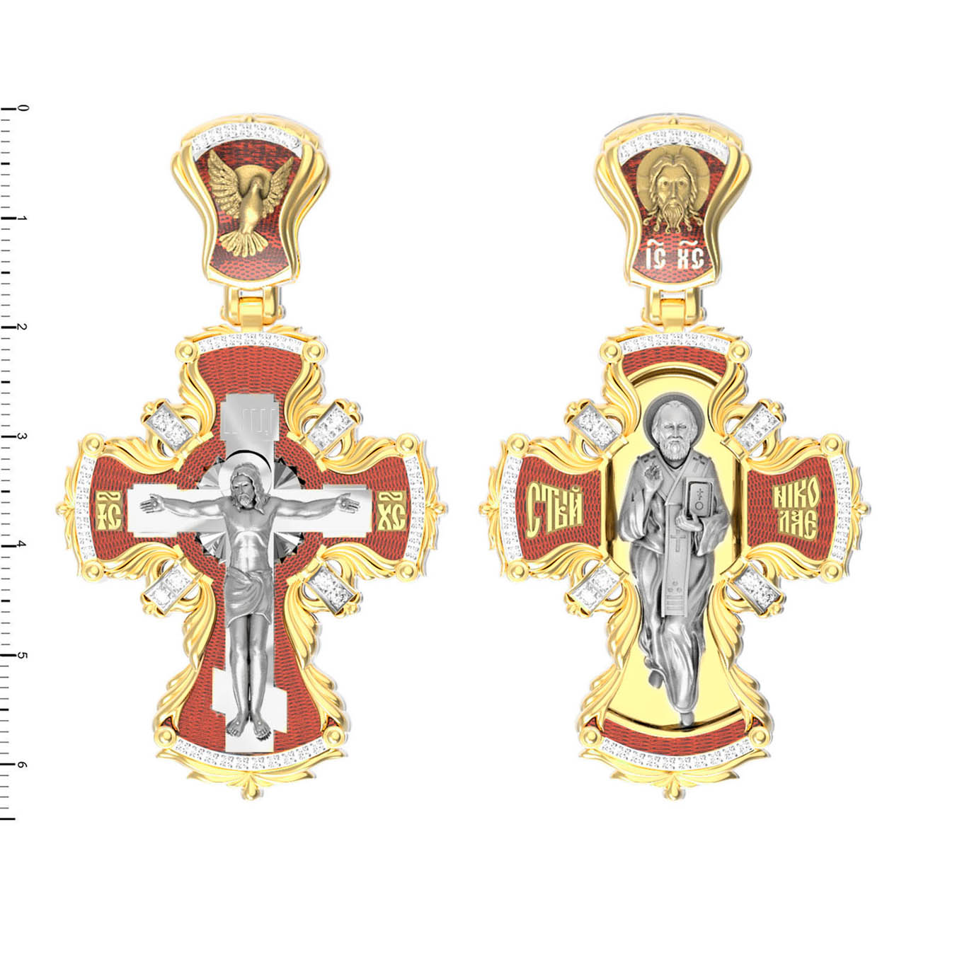 Оборотную сторону креста возглавляет икона святителя Николая Чудотворца, самого почитаемого святого не только в России, но и во всем мире. Николай Чудотворец, помощник в делах, защитник путешествующих, покровитель учащихся, утешитель обиженных и нуждающихся, целитель самых страшных и тяжелых недугов, предстатель и молитвенник за людей перед Богом. На кулонном кольце помещено изображение Спаса Нерукотворного — образ Спасителя, который Он запечатлел на плате и передал для исцеления больному проказой царю Эдессы.