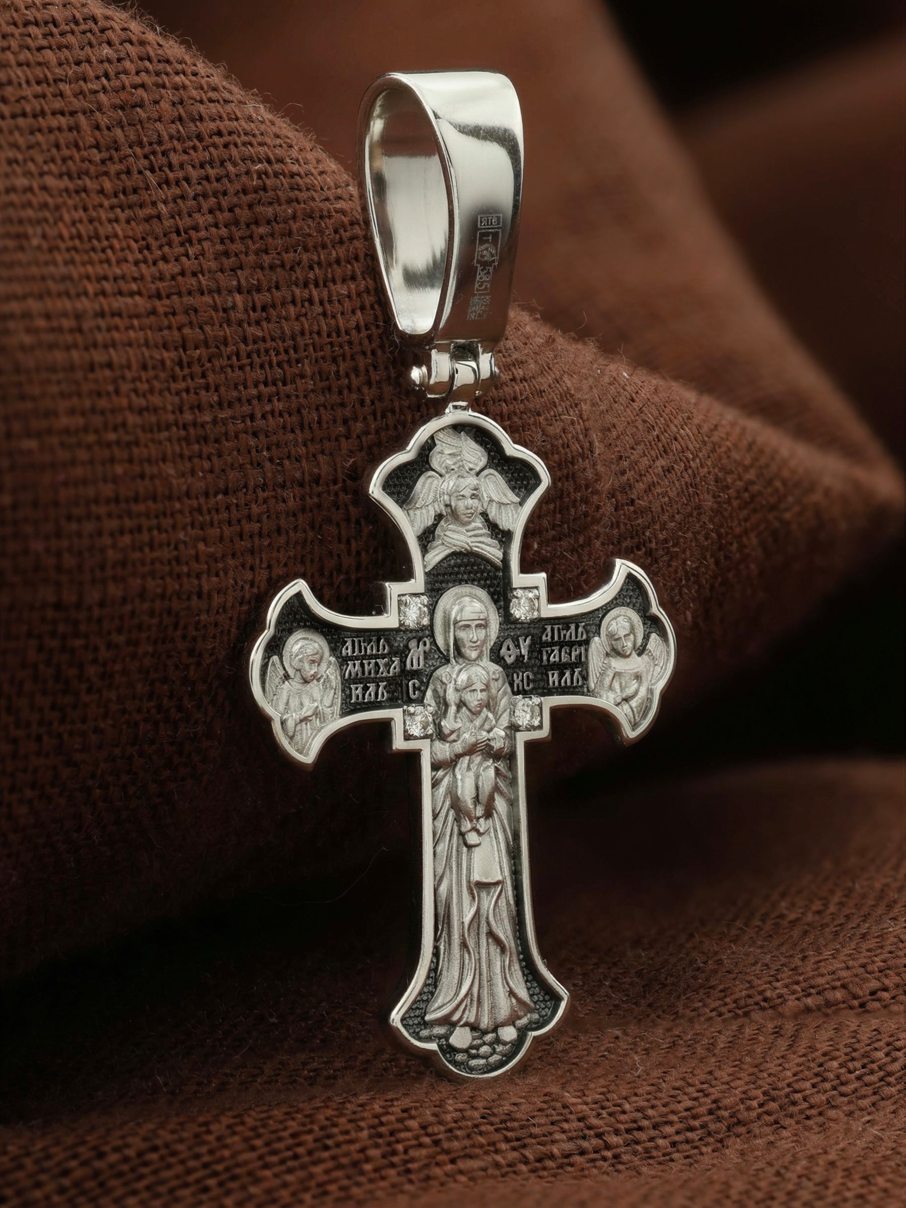 На обратной стороне креста в полный рост изображена Валаамская икона Божией Матери, над которой раскрыл свои крылья серафим. Этот образ написал в 1878 году иеромонах Валаамского монастыря о. Алипий. Валаамскую икону прославили многие чудеса, ее считают целительницей при разных недугах. Перед этим образом Богородицу молят в первую очередь об укреплении веры, просят даровать смирение, твердость в соблюдении заповедей Христовых и об исцелении. Богородице предстоят два архангела, Михаил и Гавриил.
