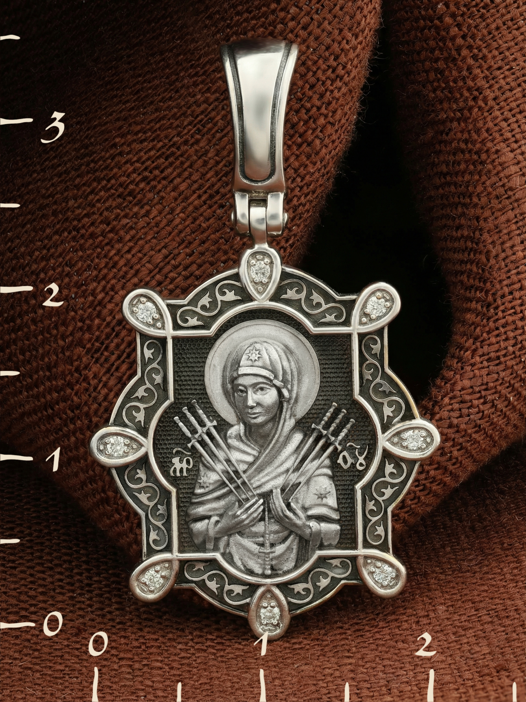 На лицевой стороне образка изображена икона Пресвятой Богородицы «Семистрельная» — одна из самых чудотворных икон на Руси. На протяжении многих веков христиане взывали к Царице Небесной через эту икону, если в стране начинались войны или мятежи.