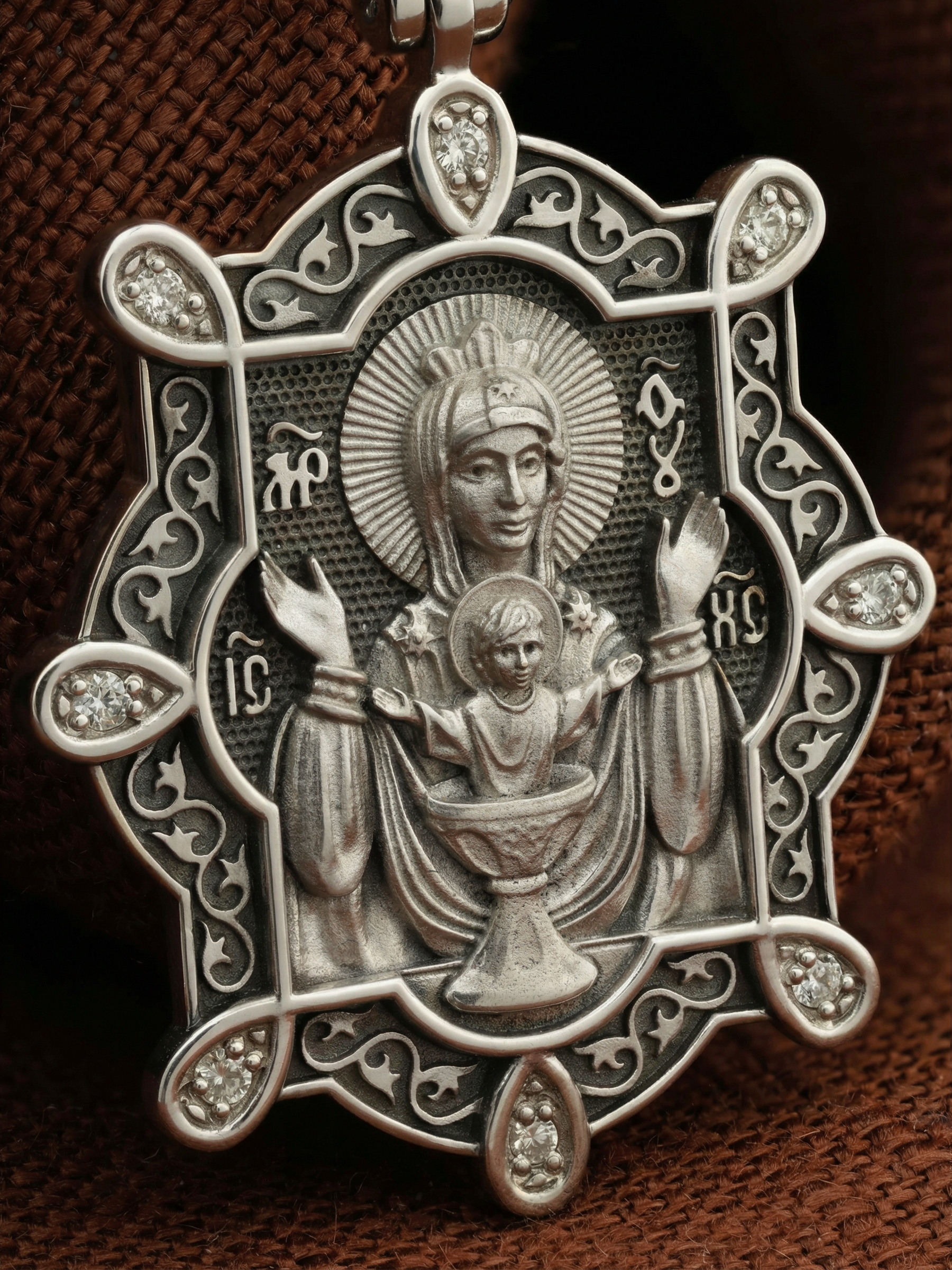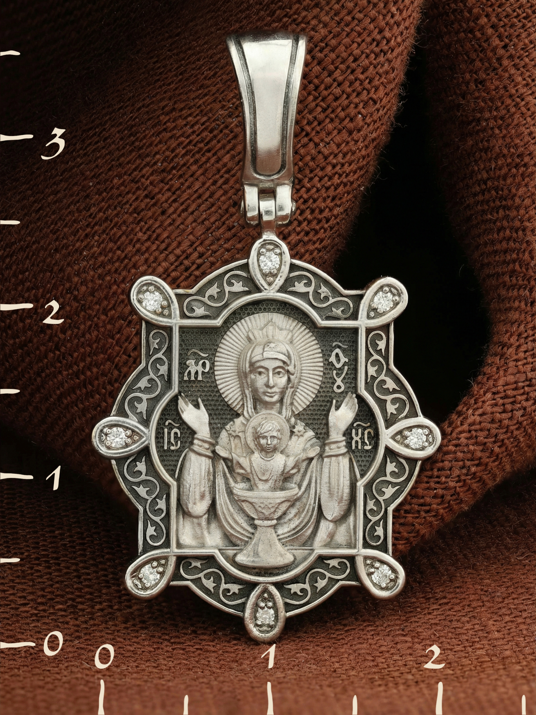 На лицевой части образка изображена икона Божией Матери «Неупиваемая чаша». Икона славится помощью в исцелении зависимостей, помогает людям обрести свободу от греховных страстей.