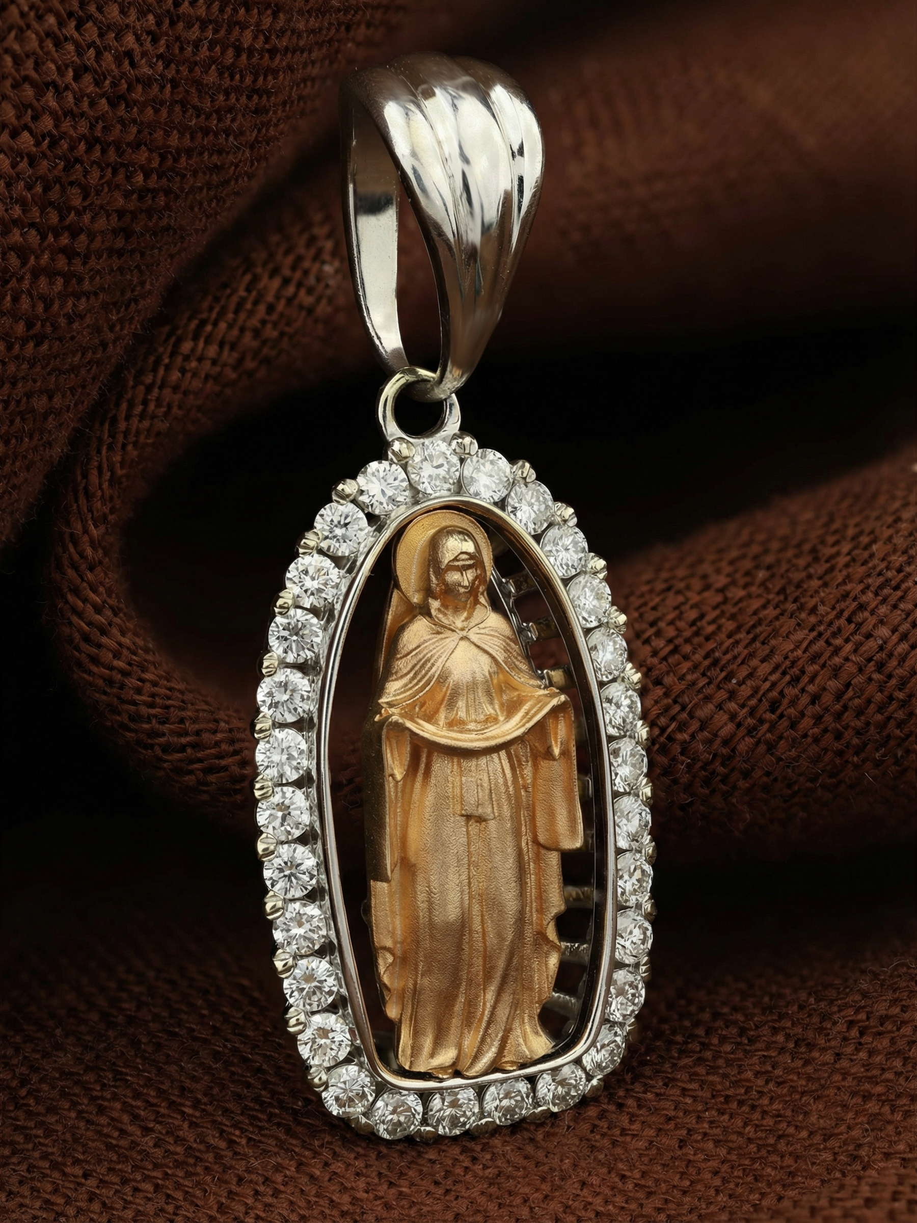 На лицевой части образка изображена икона Покров Пресвятой Богородицы. Праздник Покрова Божией Матери является воспоминанием чуда, которое произошло во Влахнернской церкви 1 (14) октября 910 года: Пресвятая Богородица явилась верующим над алтарем храма и распростерла над ними Свое покрывало. В этот день Божья Матерь открыла людям, что Она является Ходатаицей за них перед Богом. Богородица простирает Свой молитвенный покров над всеми православными христианами и умоляет Сына Своего о даровании вечного спасения каждому человеку.
