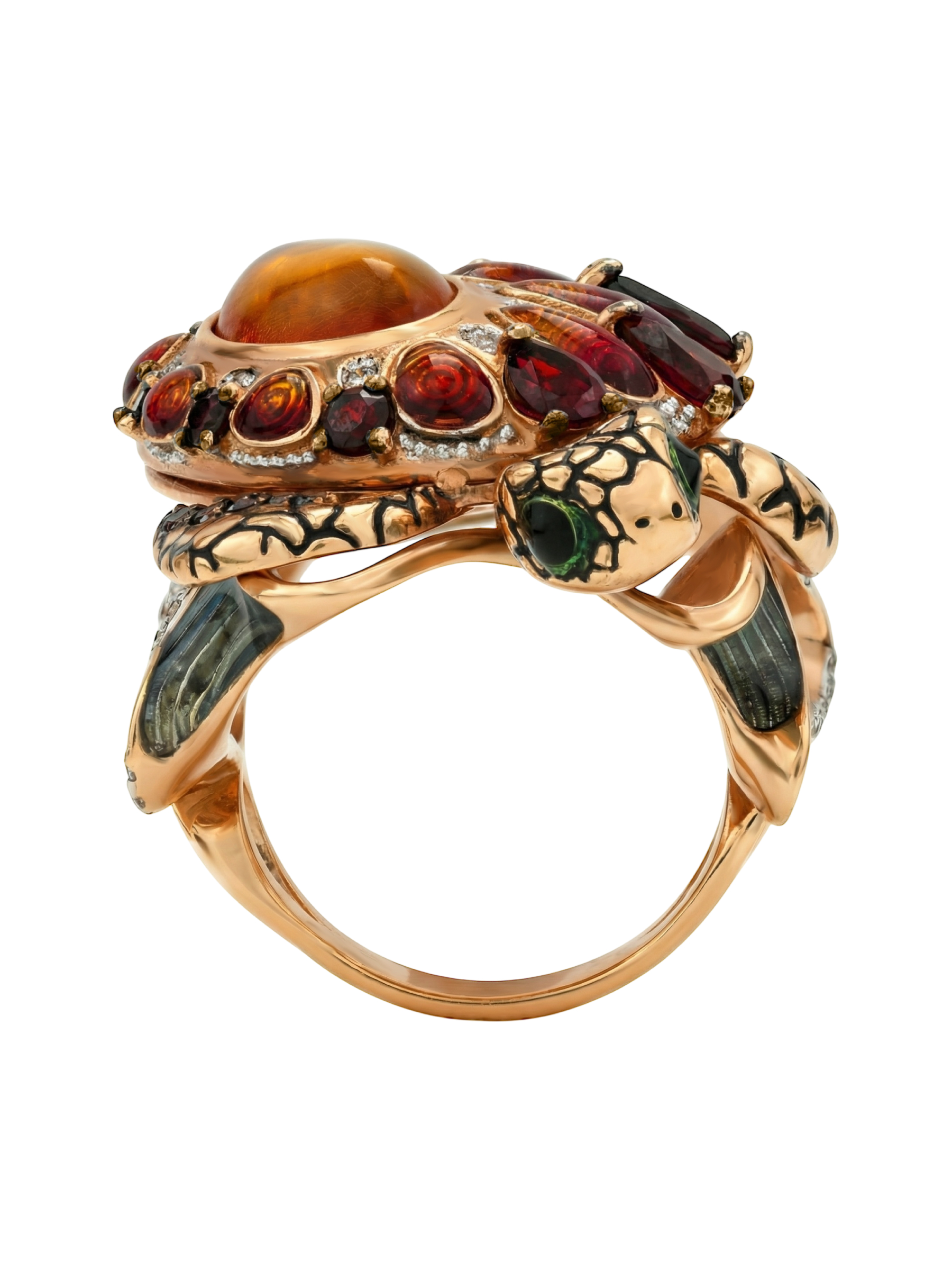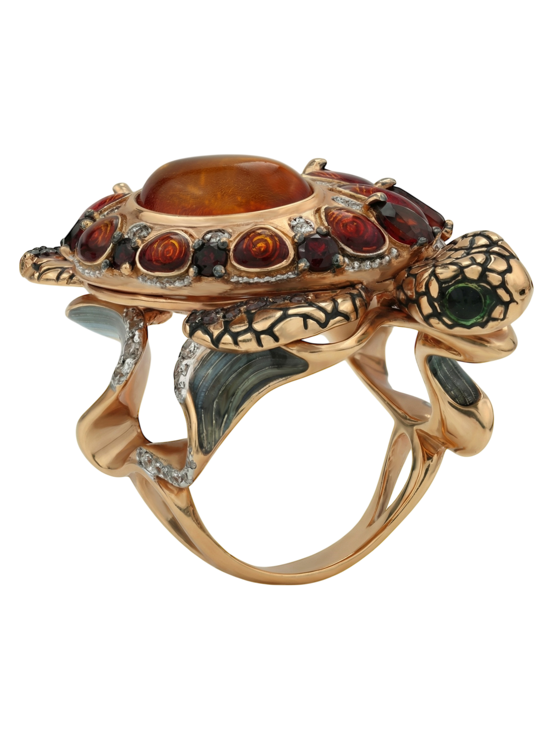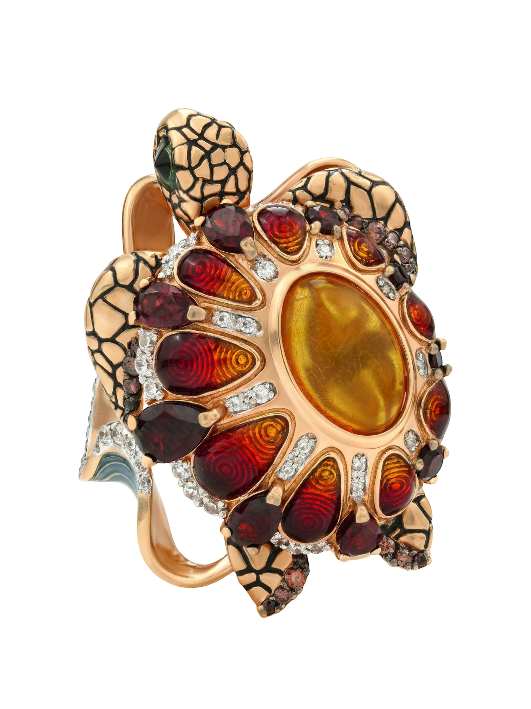 Кольцо из золота c эмаль, фианитом, гранатом и янтарём