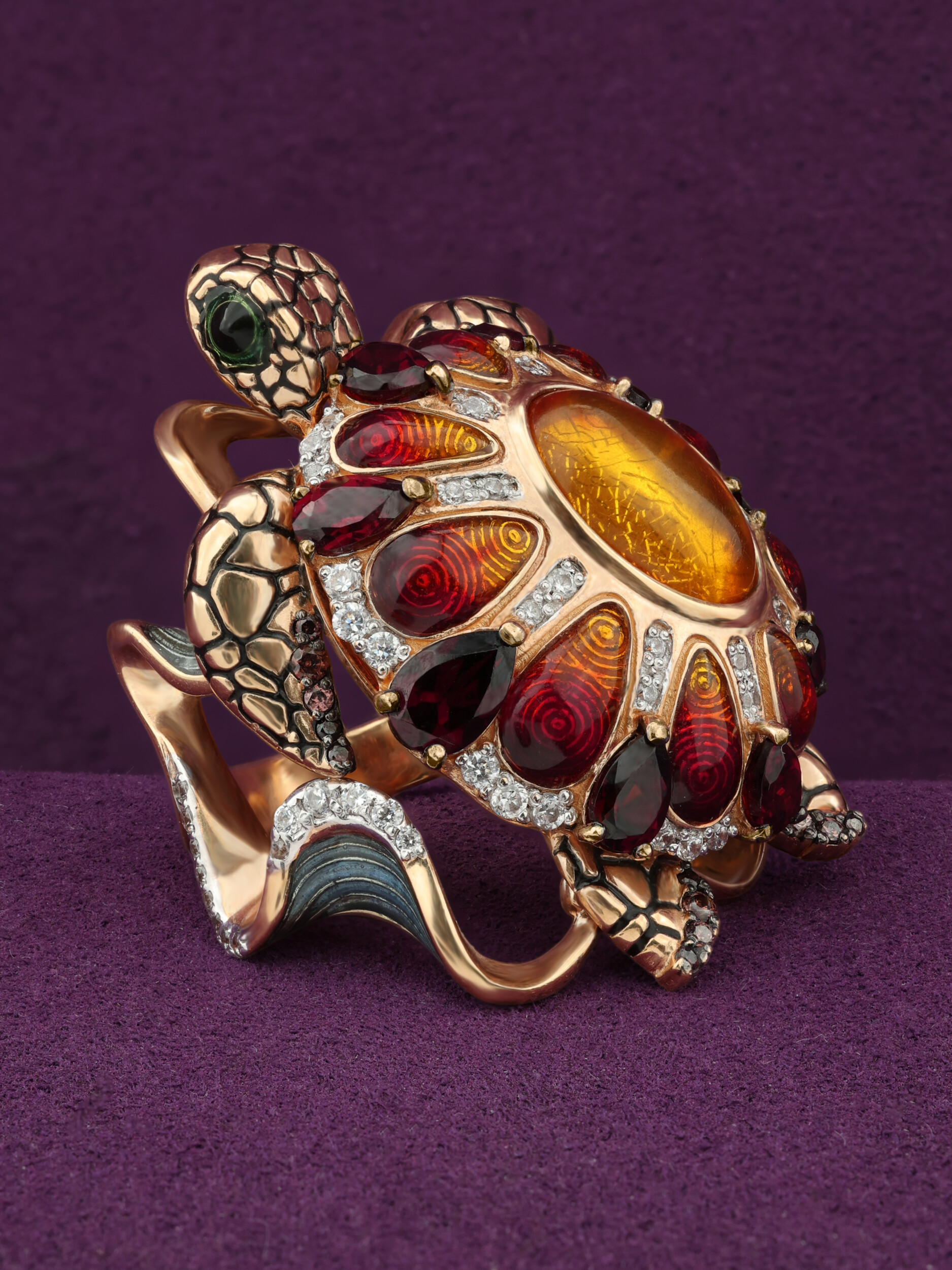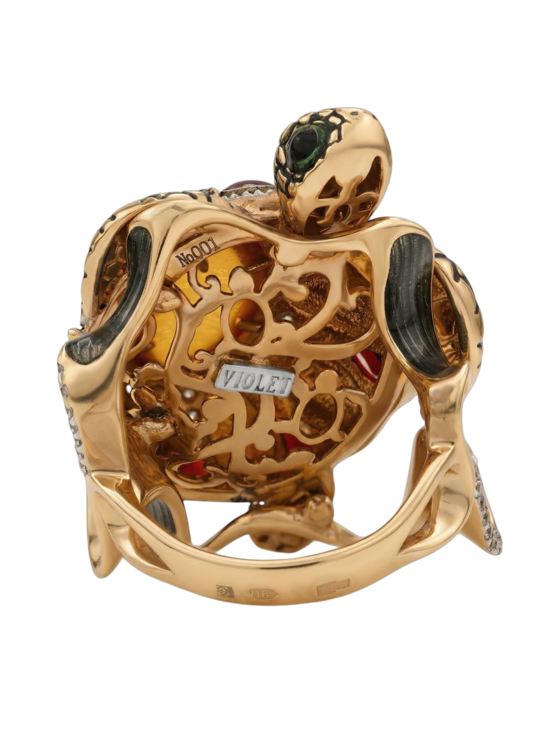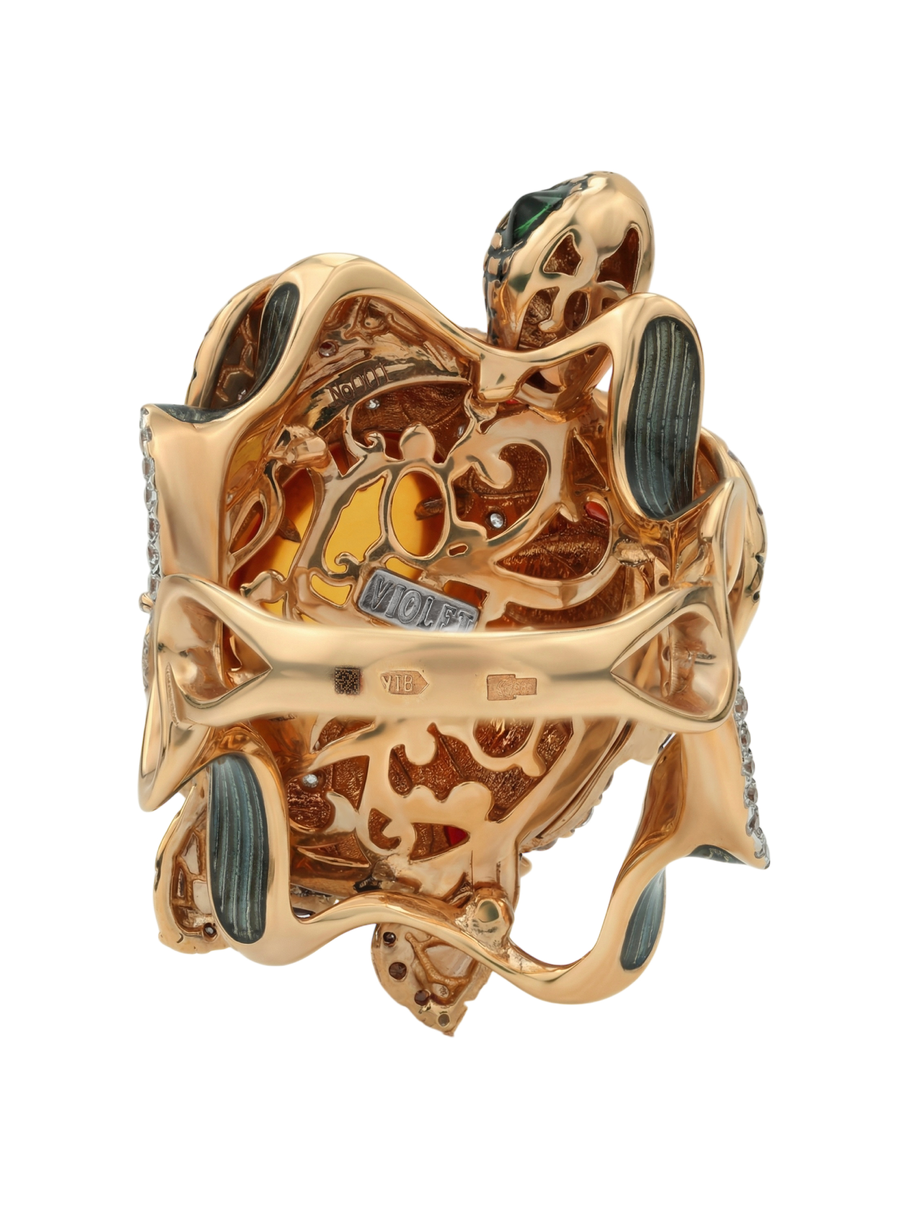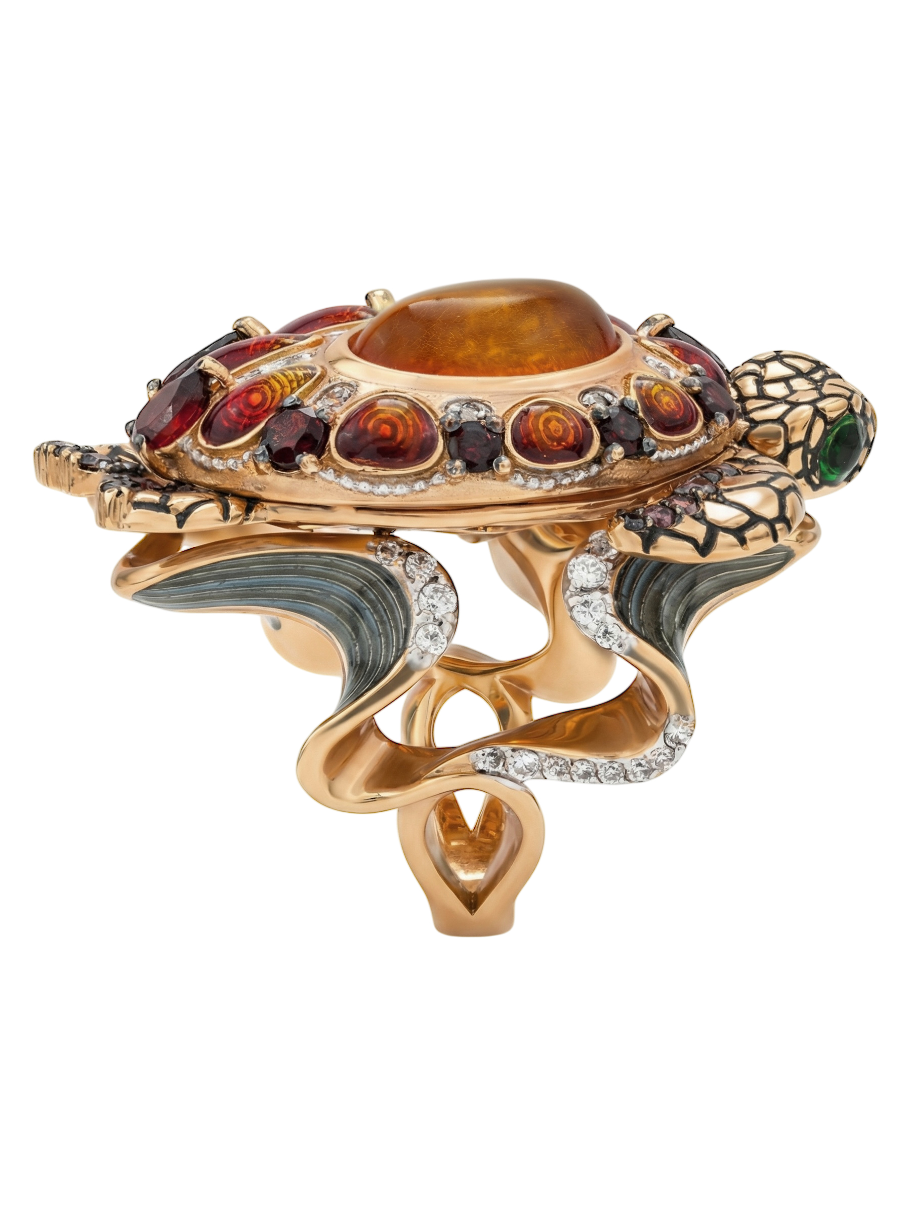 Кольцо из золота c эмаль, фианитом, гранатом и янтарём