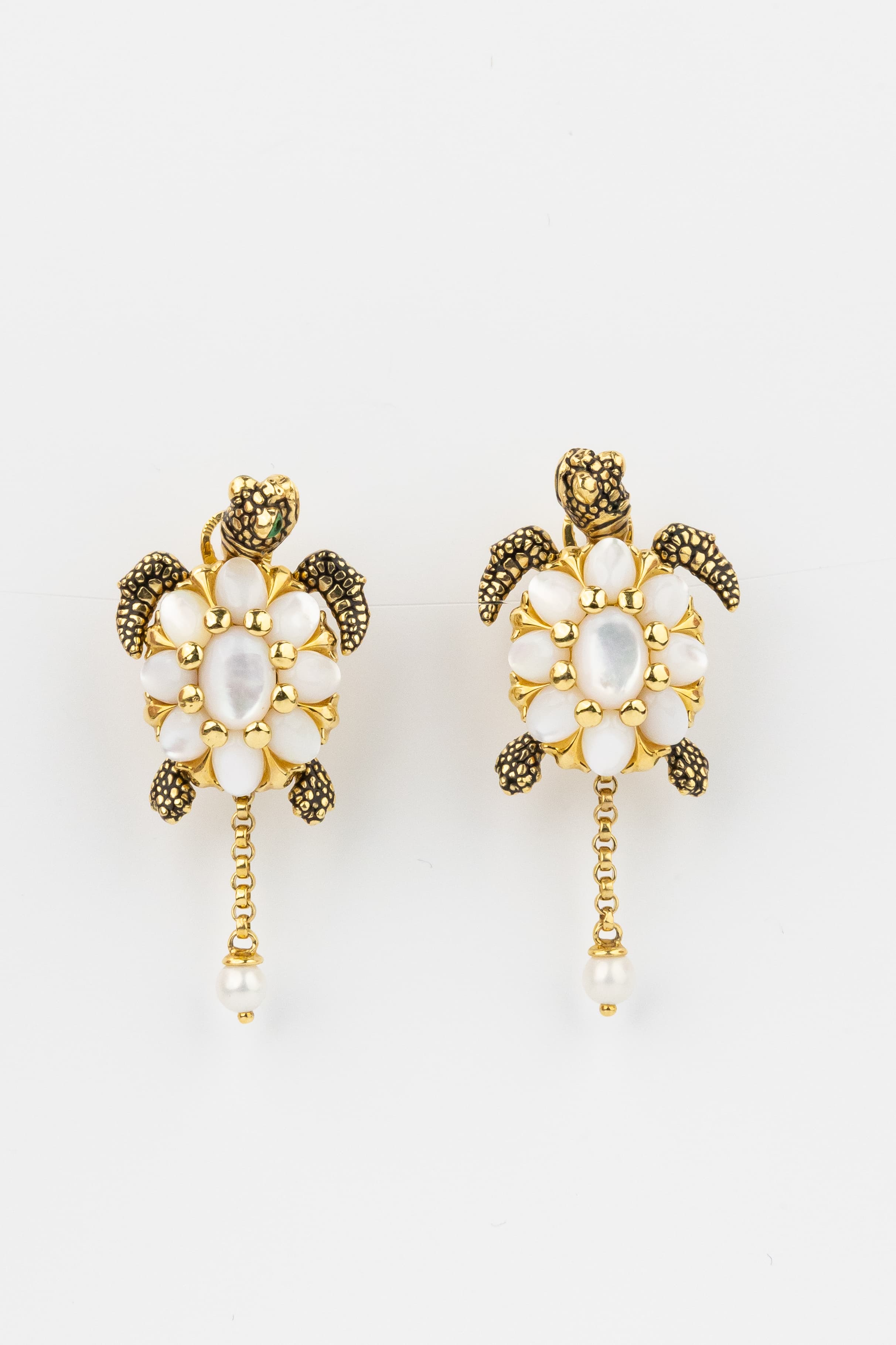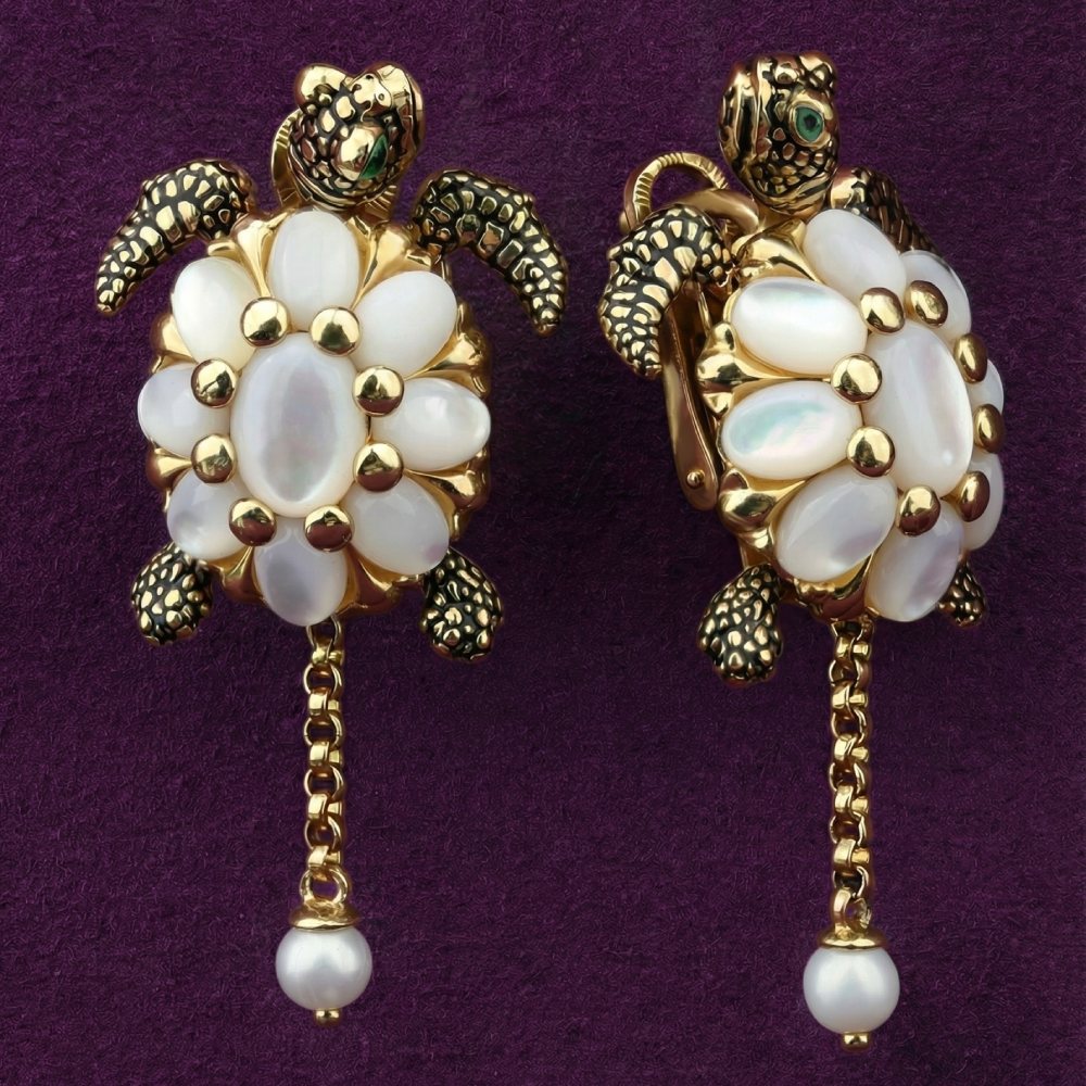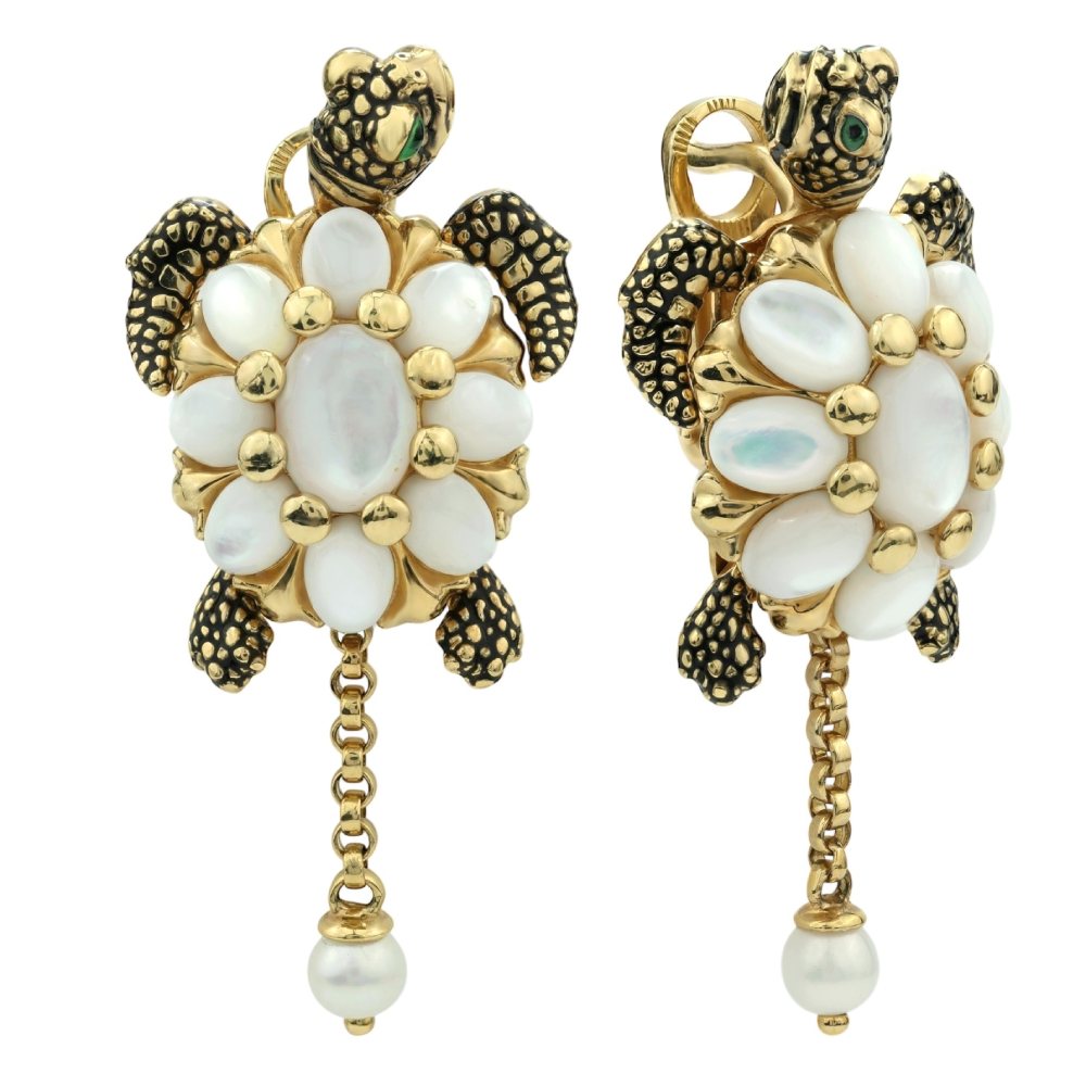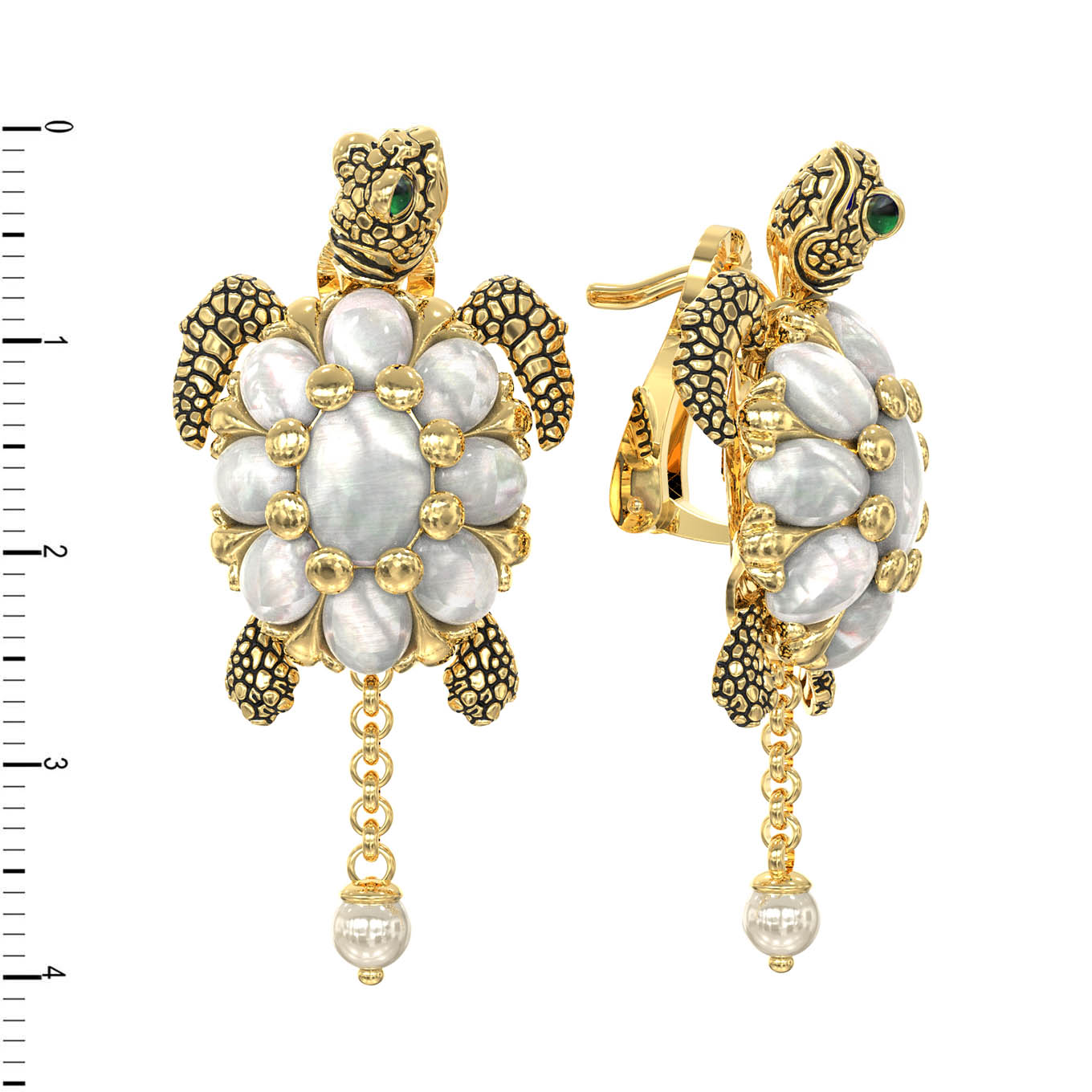 Серьги из лимонного золота c эмаль, жемчугом и перламутром