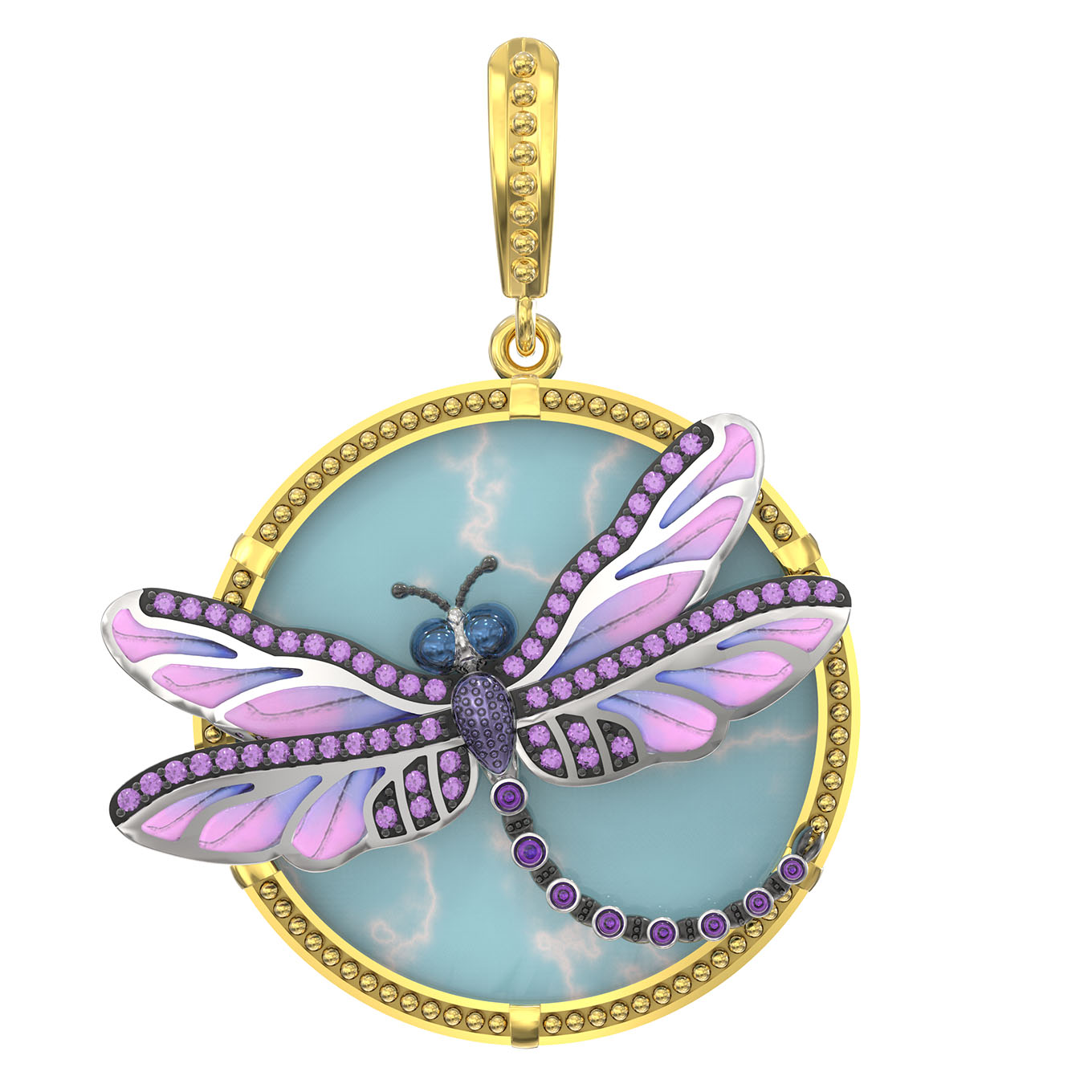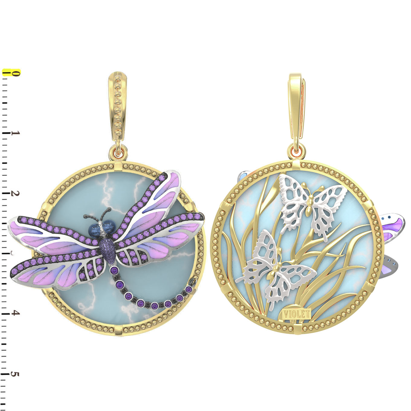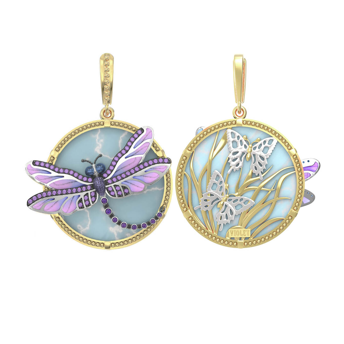Подвеска из лимонного золота c бирюзой, аметистом и эмалью