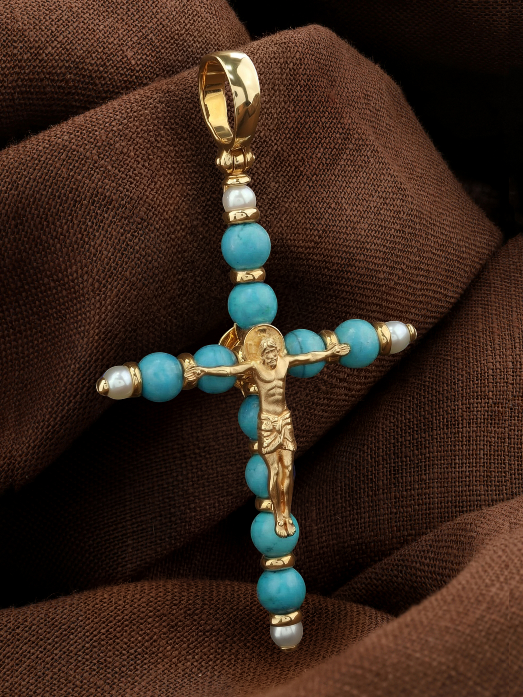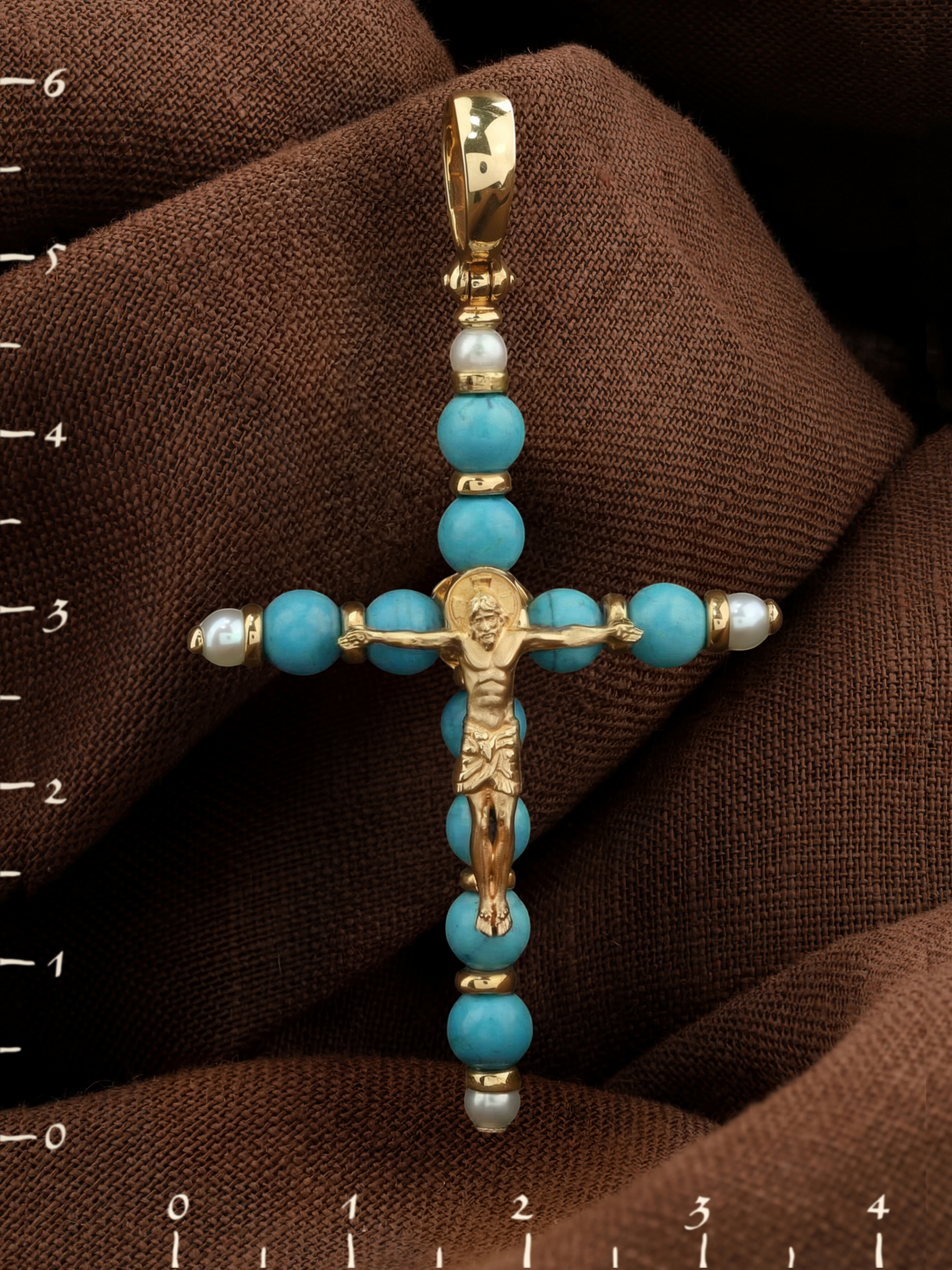 Крест из лимонного золота c жемчугом и бирюзой