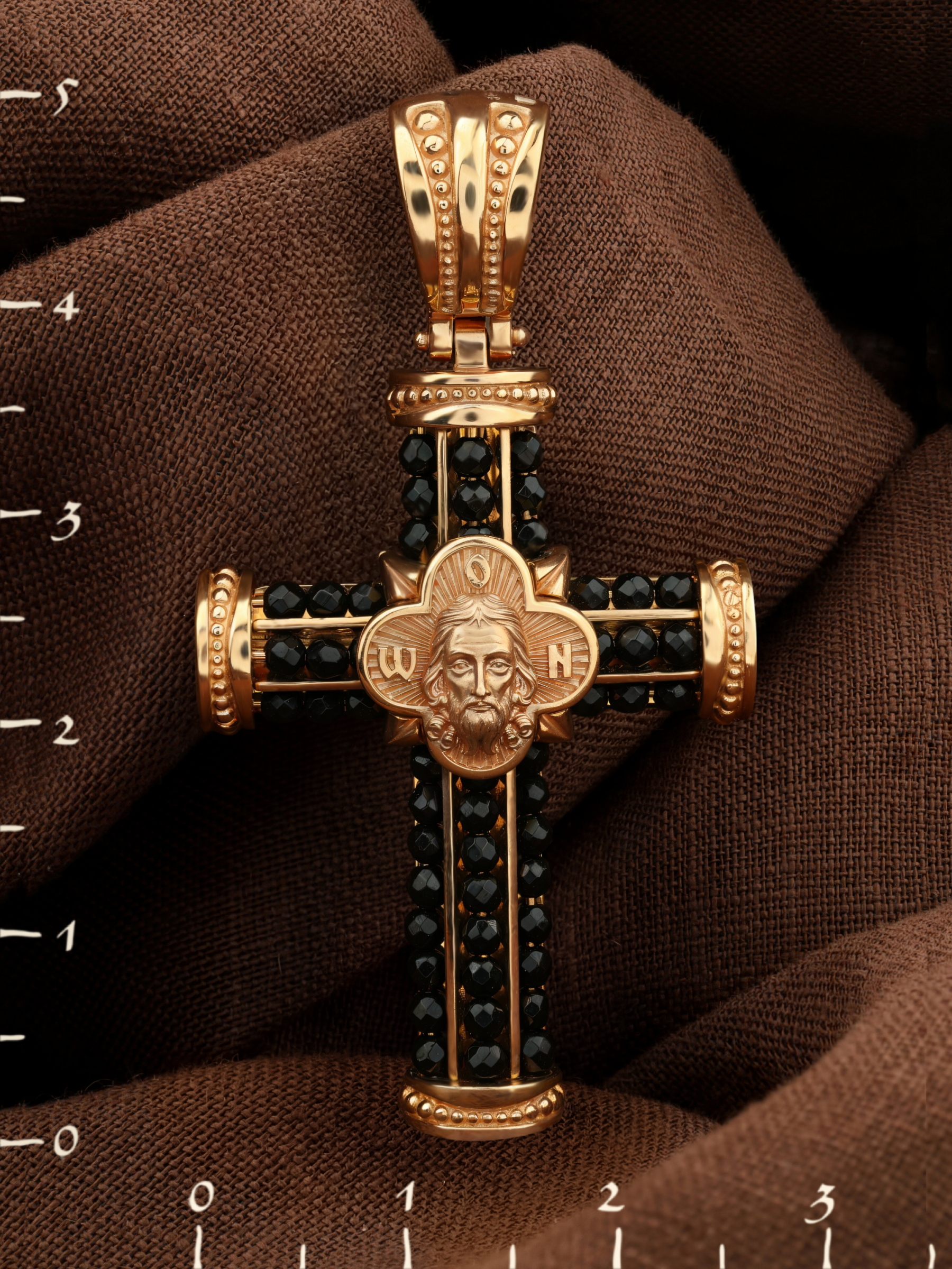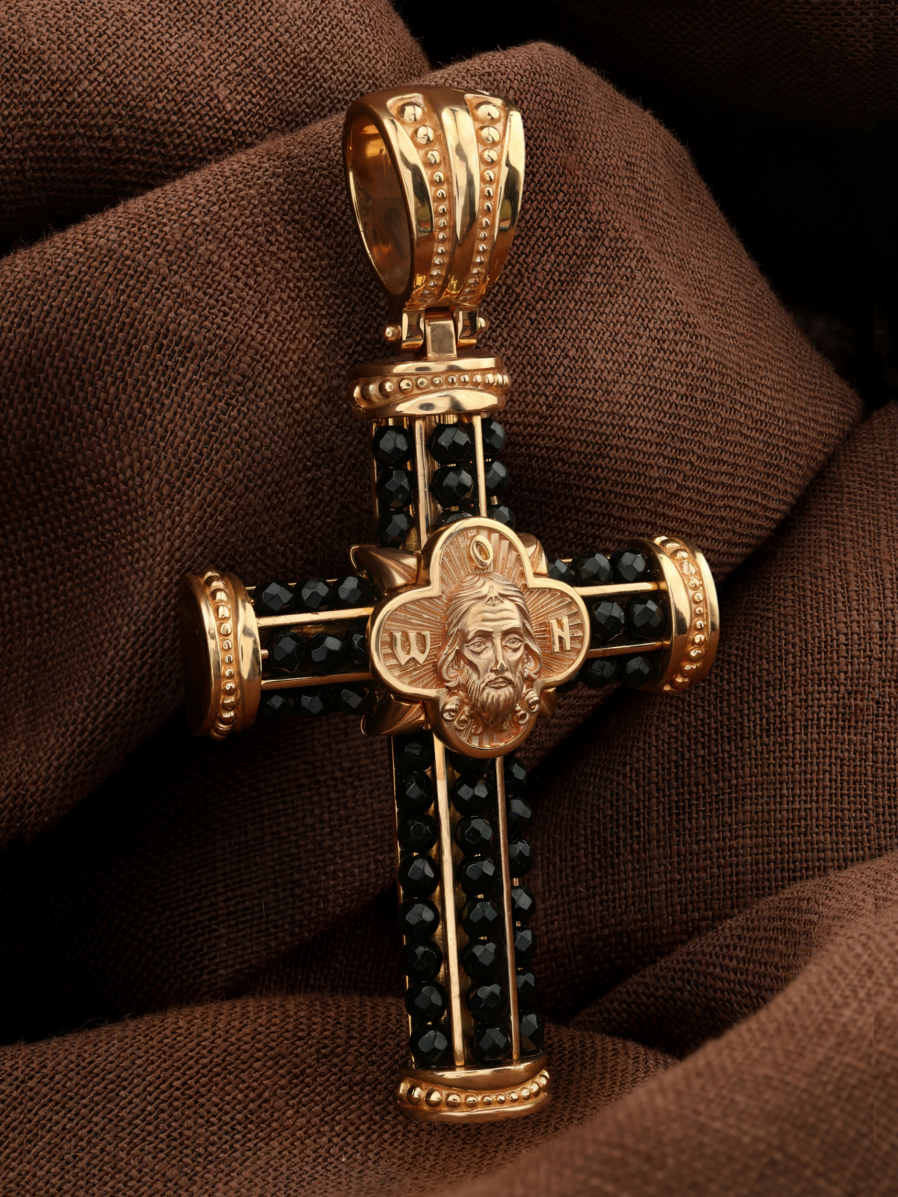 В центральной части лицевой стороны креста изображен Спас Нерукотворный — образ Господа и Спасителя нашего Иисуса Христа, чудесно отпечатавшийся на плате, котором Христос вытер свой лик. Согласно Преданию, изложенному в Четьи Минее, Авгарь V Ухама, больной проказой, послал ко Христу своего архивария Ханнана (Ананию) с письмо, в котором просил Христа прийти в Едессу и исцелить его. Ханнан же был художником, и Авгарь поручил ему, если Спаситель не сможет прийти, то написать хотя бы Его образ и принести ему. Видя, что Ханнан хочет сделать Его портрет, Христос потребовал воды, умылся, вытер Свой лик платом, и на этом плате отпечатался Его образ. Спаситель передал этот плат Ханнану с повелением отнести с ответным письмом пославшему его. Получив портрет, Авгарь исцелился от главного своего недуга, но лицо его оставалось еще поврежденным. После Пятидесятницы в Едессу пошёл святой апостол Фаддей, один из 70-ти, закончил исцеление Авгаря и обратил его в христианство. Авгарь прикрепил образ к доске и поместил в нише над городскими воротами, убрав оттуда находившегося там идола.