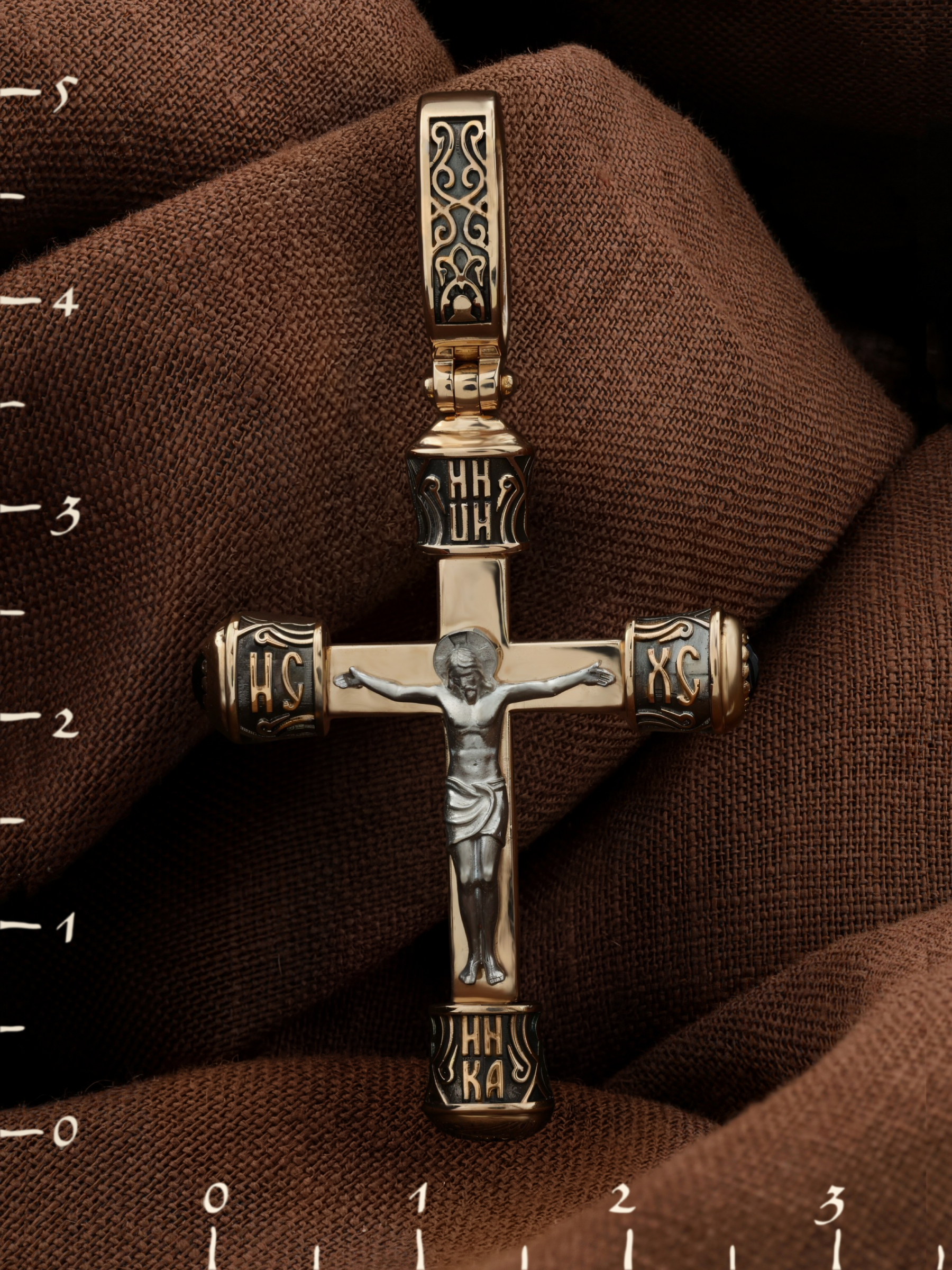 На лицевой стороне креста изображено Распятие Господа и Спасителя нашего Иисуса Христа. В Голгофе сокрыта непостижимая тайна бесконечной правды и любви Бога. Крест стал символом победы добра над злом, жизни над смертью, напоминанием бесконечной Божьей любви, предметом радости. Воплотившийся Сын Божий Своею кровью освятил крест и сделал его проводником Своей благодати, источником освящения верующих. Над распятием расположена надпись, составленная Понтием Пилатом — «ИНЦИ». Она означает «Иисус Назорей, Царь Иудейский». Надпись «ИС» «ХС» означает Иисус Христос и помещается на разных сторонах поперечной перекладины креста. В нижней части креста расположена «НИКА», что означает «победитель». На православном кресте Христос не умирает, а свободно простирает руки, ладони Иисуса открыты, будто он хочет обнять все человечество, даря им свою любовь и открывая путь к вечной жизни.