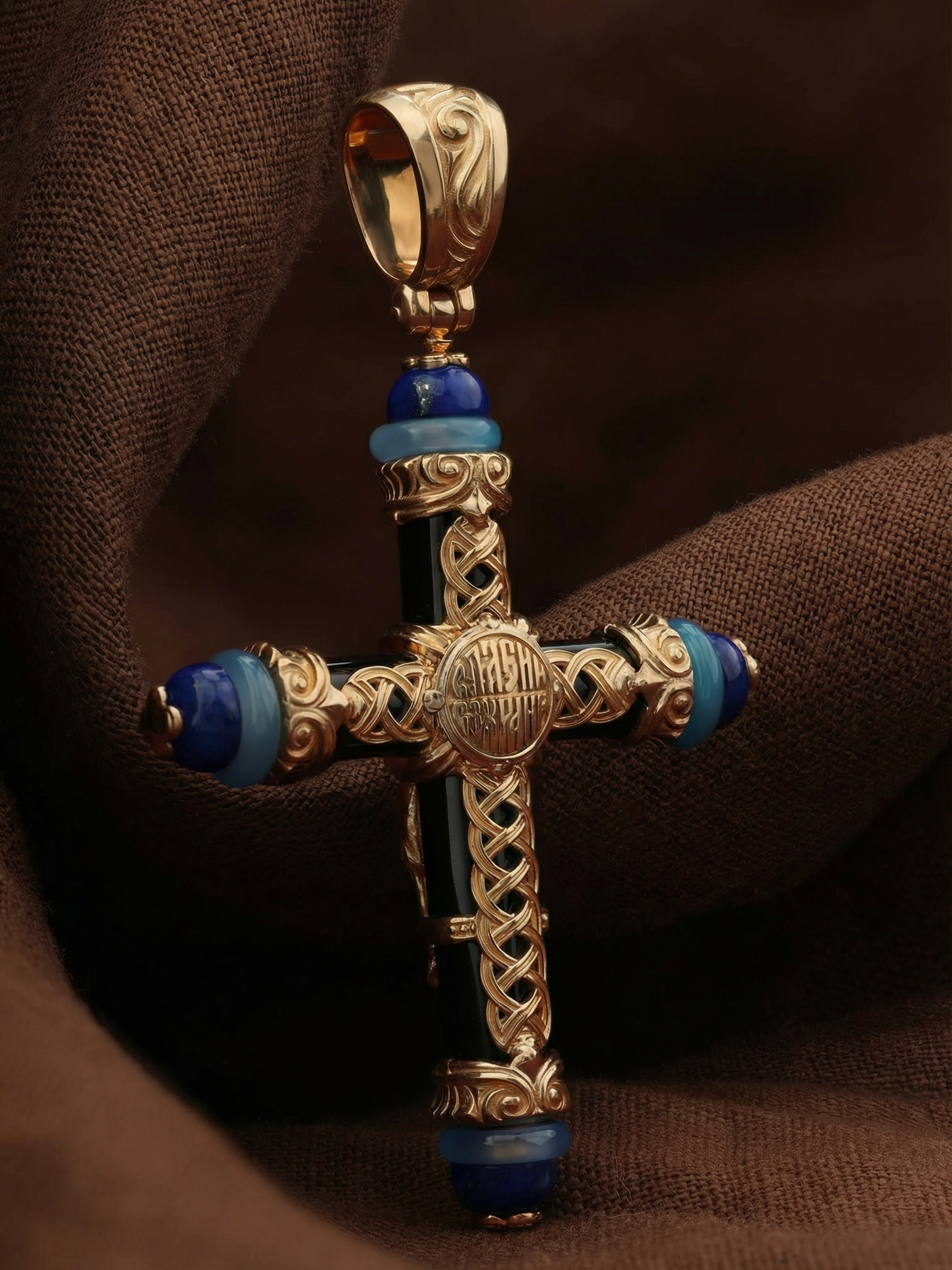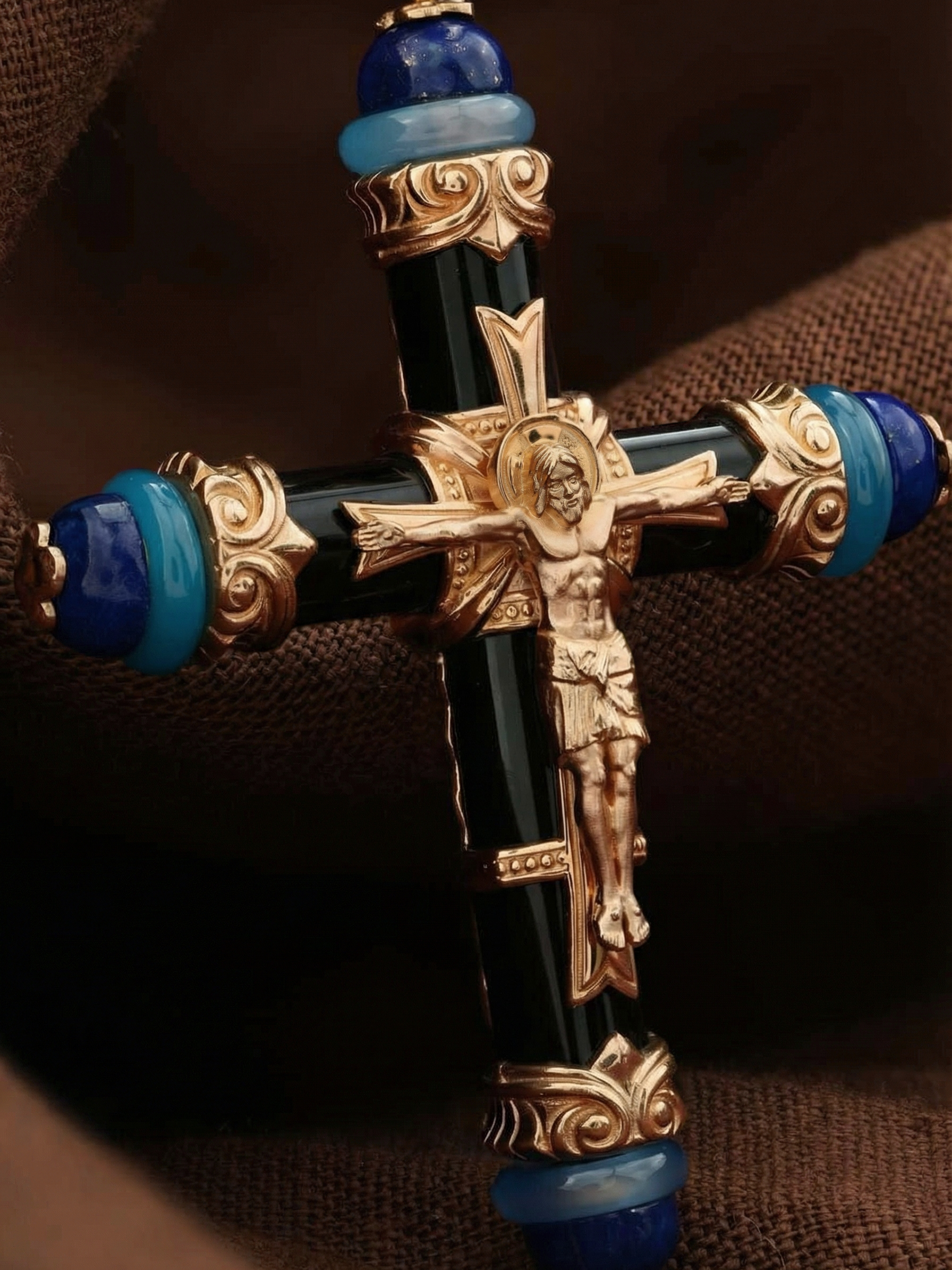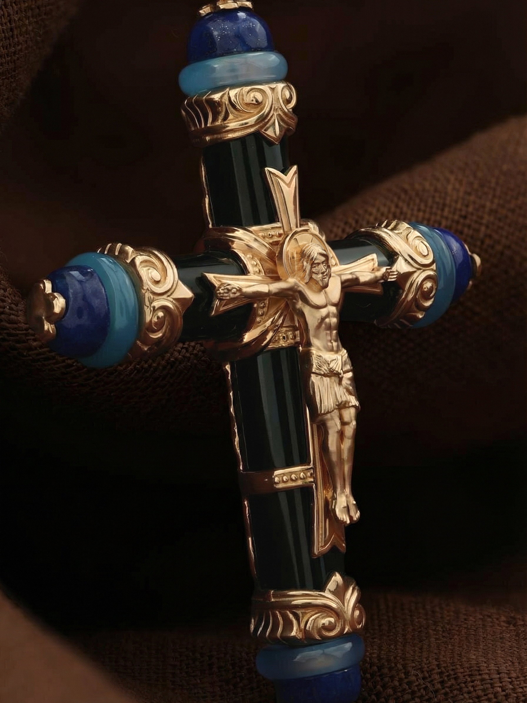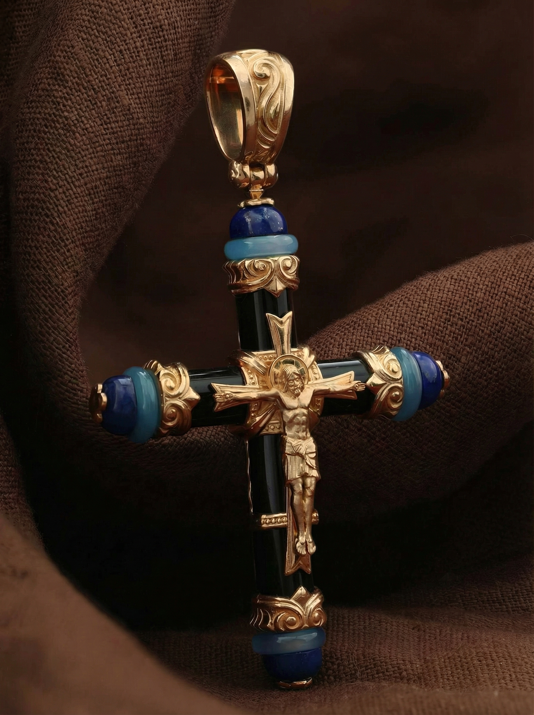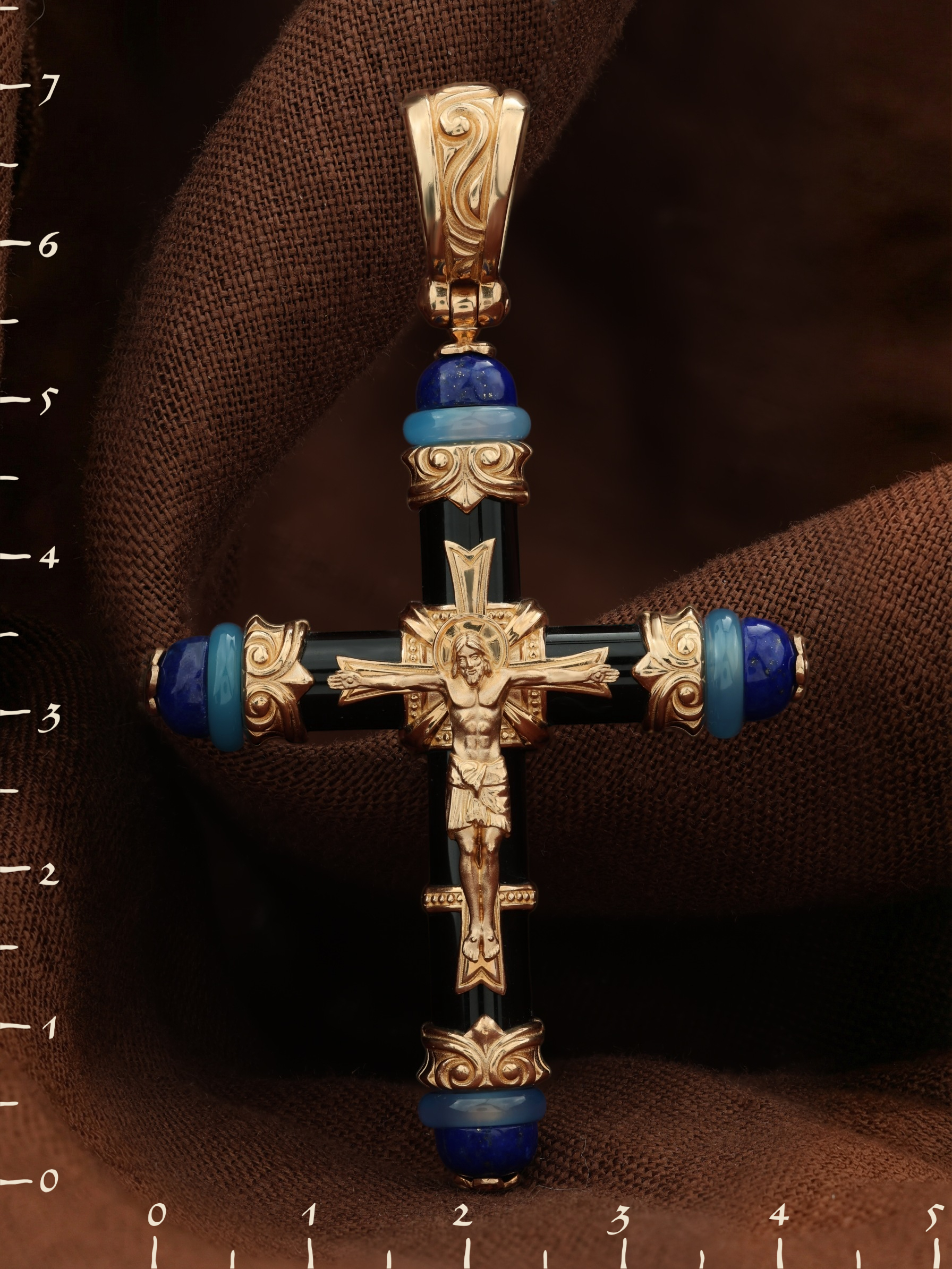 На лицевой стороне креста изображено Распятие Господа и Спасителя нашего Иисуса Христа. Своими крестными страданиями Господь смыл наши грехи, покрыл наш долг перед Богом или, на языке Писания, нас «искупил». В Голгофе сокрыта непостижимая тайна бесконечной правды и любви Бога. Крест стал символом победы добра над злом, жизни над смертью, напоминанием бесконечной Божьей любви, предметом радости. Воплотившийся Сын Божий Своею кровью освятил крест и сделал его проводником Своей благодати, источником освящения верующих. Христос в Своей Божественной любви, над которой смерть не властна и которая, страдая, и не страдает в обычном смысле, простирает к людям со Креста Свои объятия, в которые призывается и привлекается весь мир. Поэтому Тело Его не висит, а торжественно покоится на Кресте.