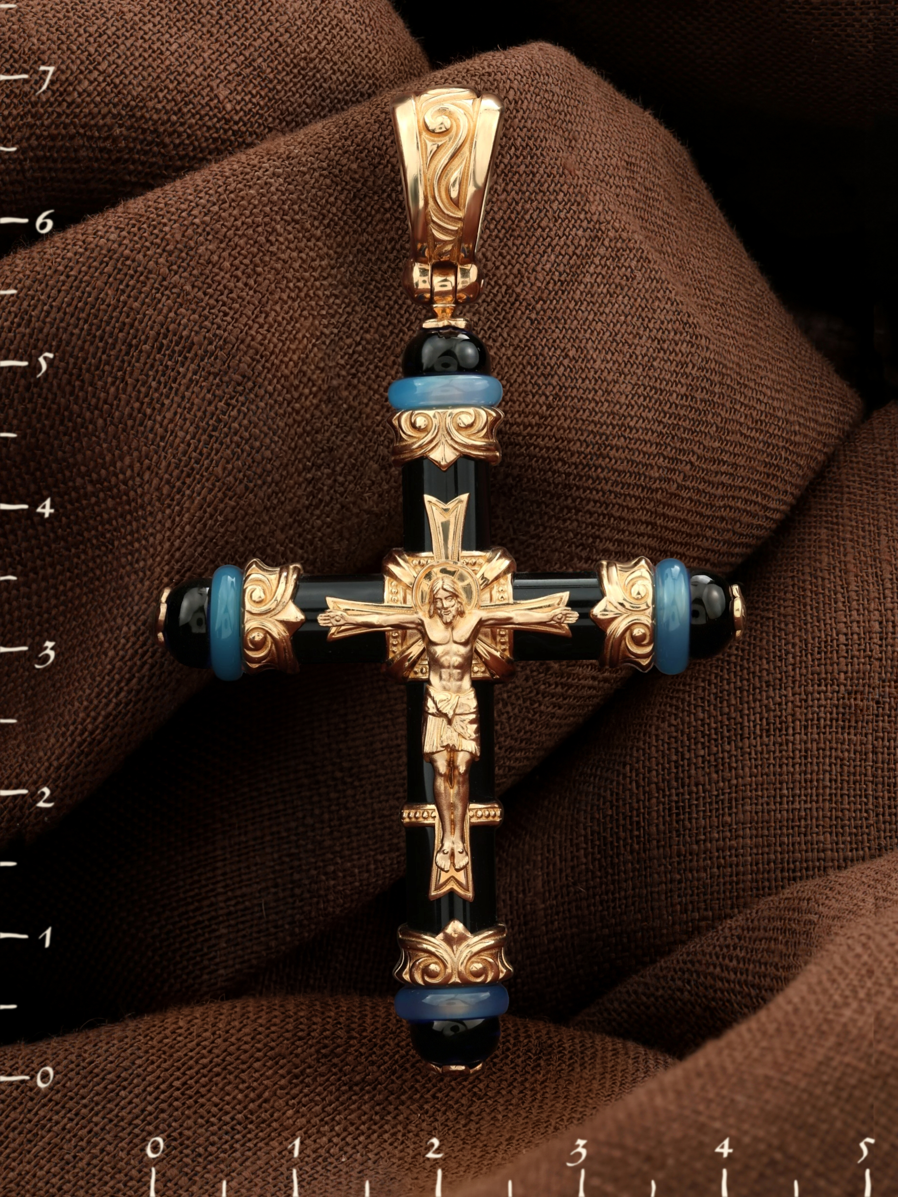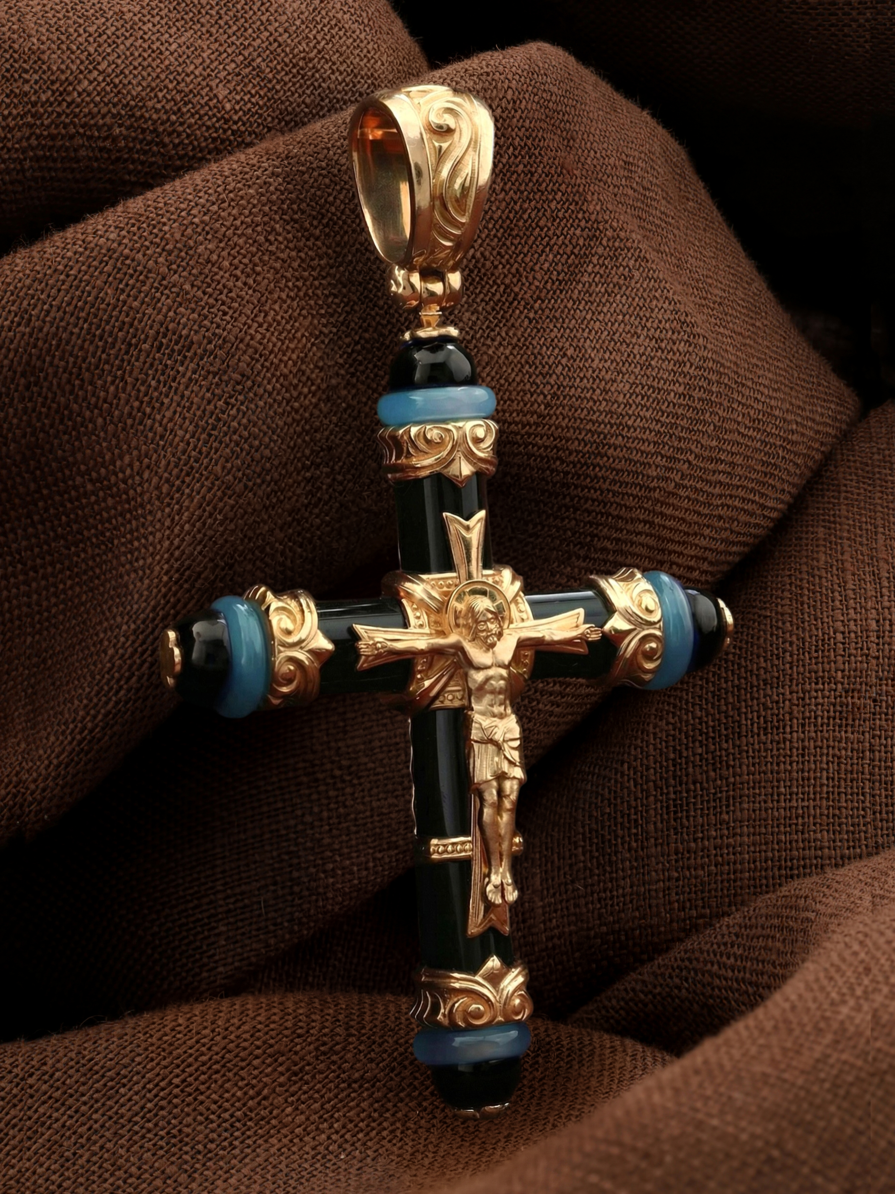 На лицевой стороне креста изображено Распятие Господа и Спасителя нашего Иисуса Христа. Своими крестными страданиями Господь смыл наши грехи, покрыл наш долг перед Богом или, на языке Писания, нас «искупил». В Голгофе сокрыта непостижимая тайна бесконечной правды и любви Бога. Крест стал символом победы добра над злом, жизни над смертью, напоминанием бесконечной Божьей любви, предметом радости. Воплотившийся Сын Божий Своею кровью освятил крест и сделал его проводником Своей благодати, источником освящения верующих. Христос в Своей Божественной любви, над которой смерть не властна и которая, страдая, и не страдает в обычном смысле, простирает к людям со Креста Свои объятия, в которые призывается и привлекается весь мир. Поэтому Тело Его не висит, а торжественно покоится на Кресте.