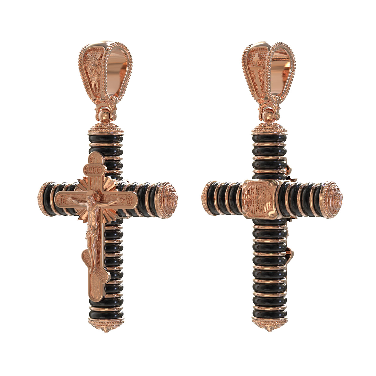На лицевой стороне креста изображено Распятие Господа и Спасителя нашего Иисуса Христа. Своими крестными страданиями Господь смыл наши грехи, покрыл наш долг перед Богом или, на языке Писания, нас «искупил». В Голгофе сокрыта непостижимая тайна бесконечной правды и любви Бога. Крест стал символом победы добра над злом, жизни над смертью, напоминанием бесконечной Божьей любви, предметом радости. Воплотившийся Сын Божий Своею кровью освятил крест и сделал его проводником Своей благодати, источником освящения верующих. На верхней табличке, выше головы Иисуса, расположена надпись, составленная Понтием Пилатом — «IНЦI». Она означает «Иисус Назорей, Царь Иудейский». Надпись «IC» «ХC», означает Иисус Христос, помещаются на разных сторонах поперечной перекладины креста. Христос в Своей Божественной любви, над которой смерть не властна и которая, страдая, и не страдает в обычном смысле, простирает к людям со Креста Свои объятия, в которые призывается и привлекается весь мир. Поэтому Тело Его не висит, а торжественно покоится на Кресте. На кулонном кольце изображен шестикрылый Серафим. Серафим означает «Пламенный». Горя любовью к Богу, он зажигает огонь этой любви и в сердцах людей.