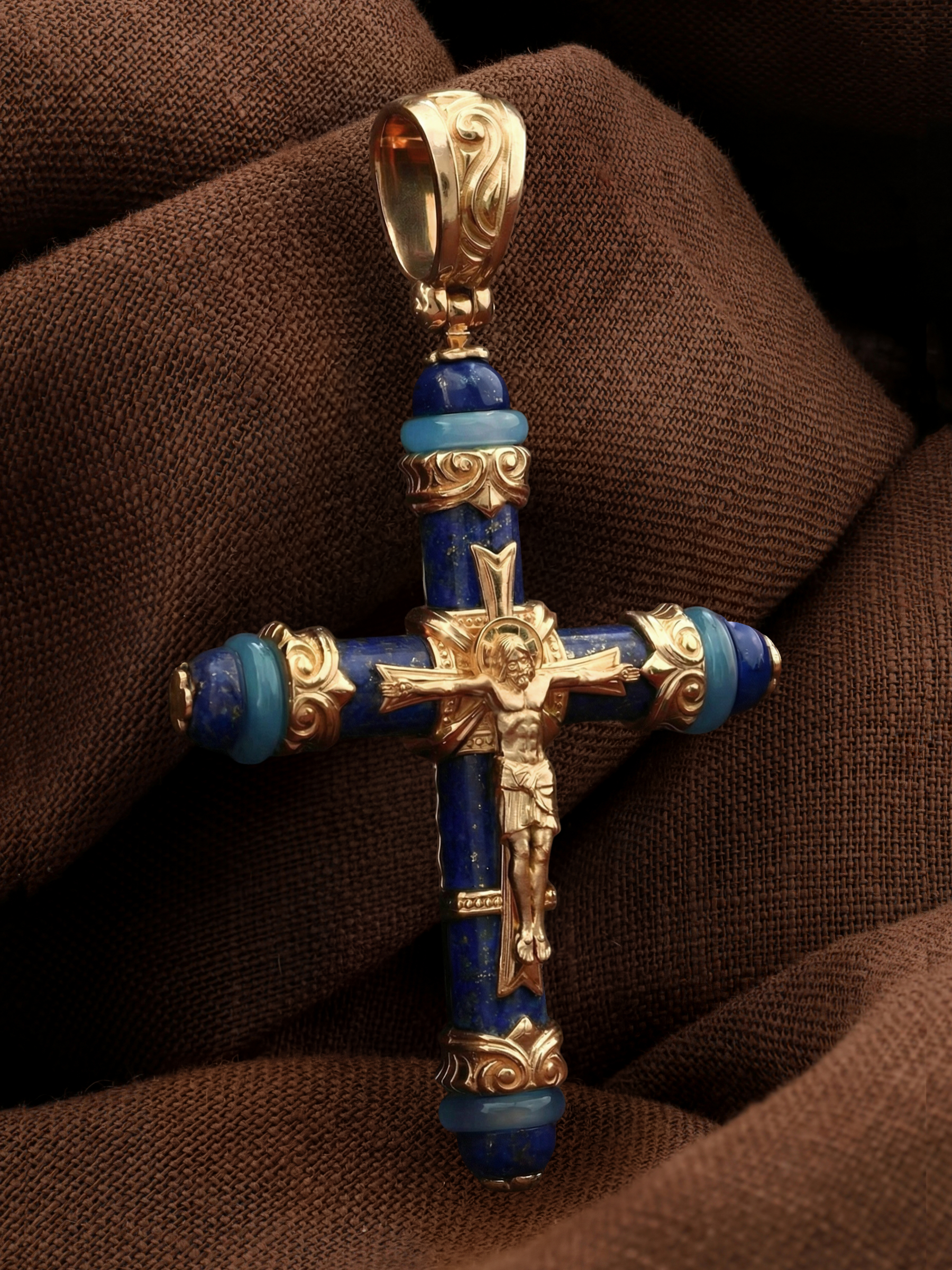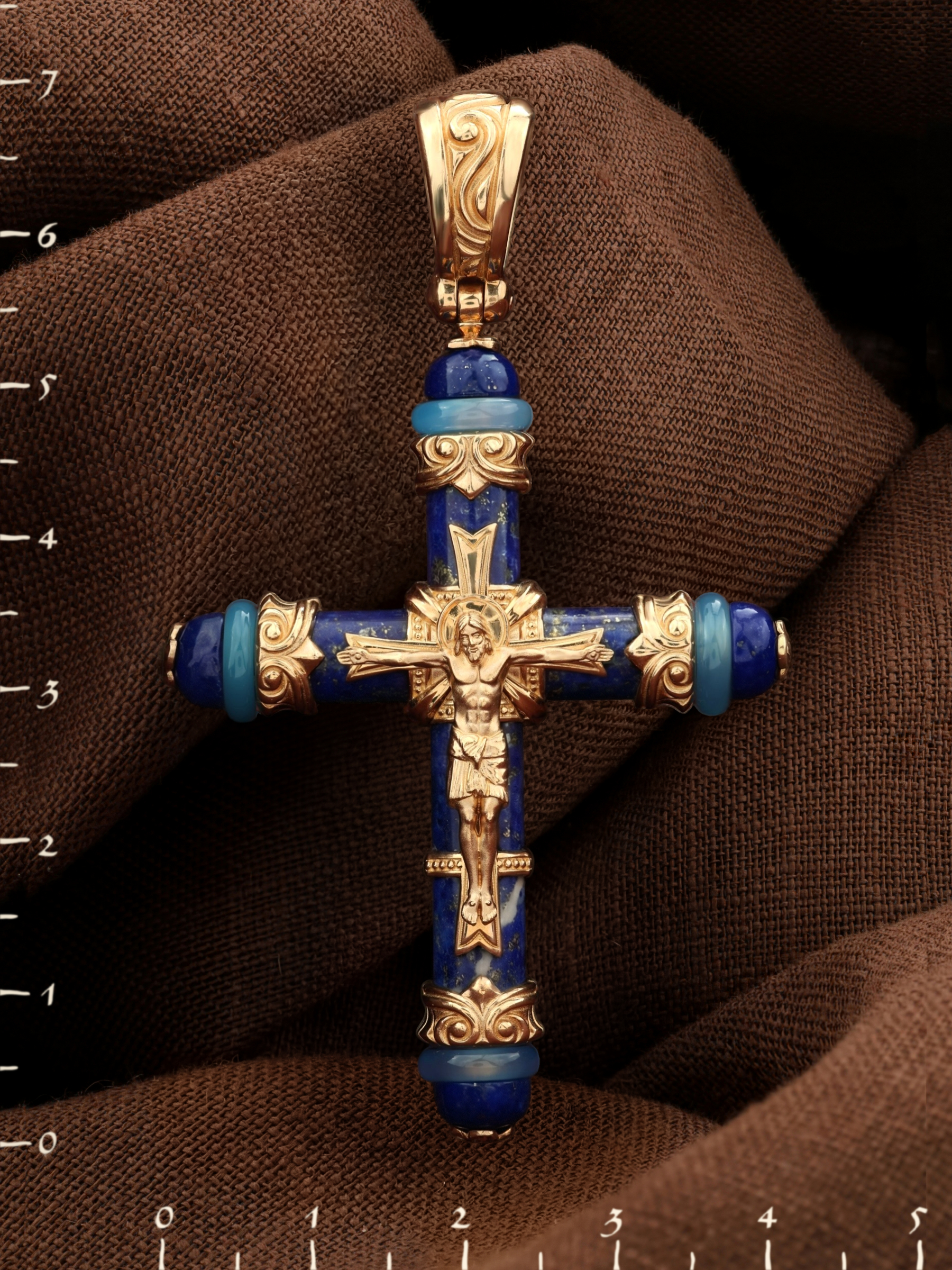 На лицевой стороне креста изображено Распятие Господа и Спасителя нашего Иисуса Христа. Своими крестными страданиями Господь смыл наши грехи, покрыл наш долг перед Богом или, на языке Писания, нас «искупил». В Голгофе сокрыта непостижимая тайна бесконечной правды и любви Бога. Крест стал символом победы добра над злом, жизни над смертью, напоминанием бесконечной Божьей любви, предметом радости. Воплотившийся Сын Божий Своею кровью освятил крест и сделал его проводником Своей благодати, источником освящения верующих. Христос в Своей Божественной любви, над которой смерть не властна и которая, страдая, и не страдает в обычном смысле, простирает к людям со Креста Свои объятия, в которые призывается и привлекается весь мир. Поэтому Тело Его не висит, а торжественно покоится на Кресте.
