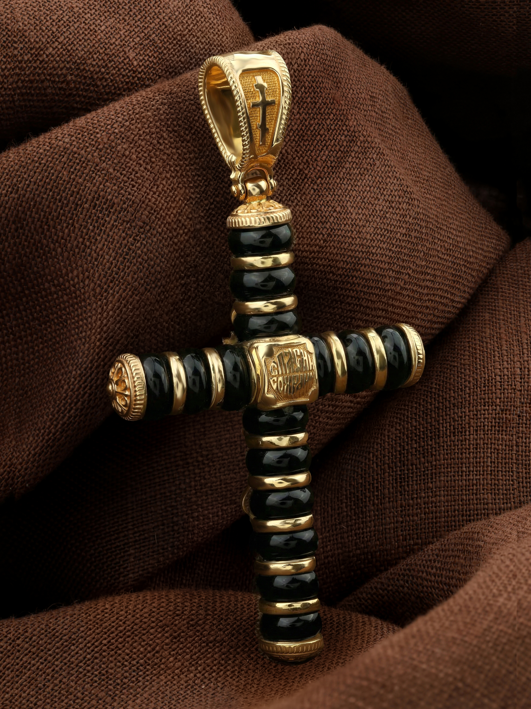 На лицевой стороне креста изображено Распятие Господа и Спасителя нашего Иисуса Христа. Своими крестными страданиями Господь смыл наши грехи, покрыл наш долг перед Богом или, на языке Писания, нас «искупил». В Голгофе сокрыта непостижимая тайна бесконечной правды и любви Бога. Крест стал символом победы добра над злом, жизни над смертью, напоминанием бесконечной Божьей любви, предметом радости. Воплотившийся Сын Божий Своею кровью освятил крест и сделал его проводником Своей благодати, источником освящения верующих. Господь сказал: кто хочет идти за Мною, отвергнись себя, и возьми крест свой, и следуй за Мною. (Мк. 8: 34). На верхней табличке, выше головы Иисуса, расположена надпись, составленная Понтием Пилатом — «IНЦI». Она означает «Иисус Назорей, Царь Иудейский». Надпись «IC» «ХC», означает Иисус Христос, помещается на разных сторонах поперечной перекладины креста. На православном кресте Христос не умирает, а свободно простирает руки, ладони Иисуса открыты, будто он хочет обнять все человечество, даря им свою любовь и открывая путь к вечной жизни. На кулонном кольце изображен шестикрылый Ангел Серафим.